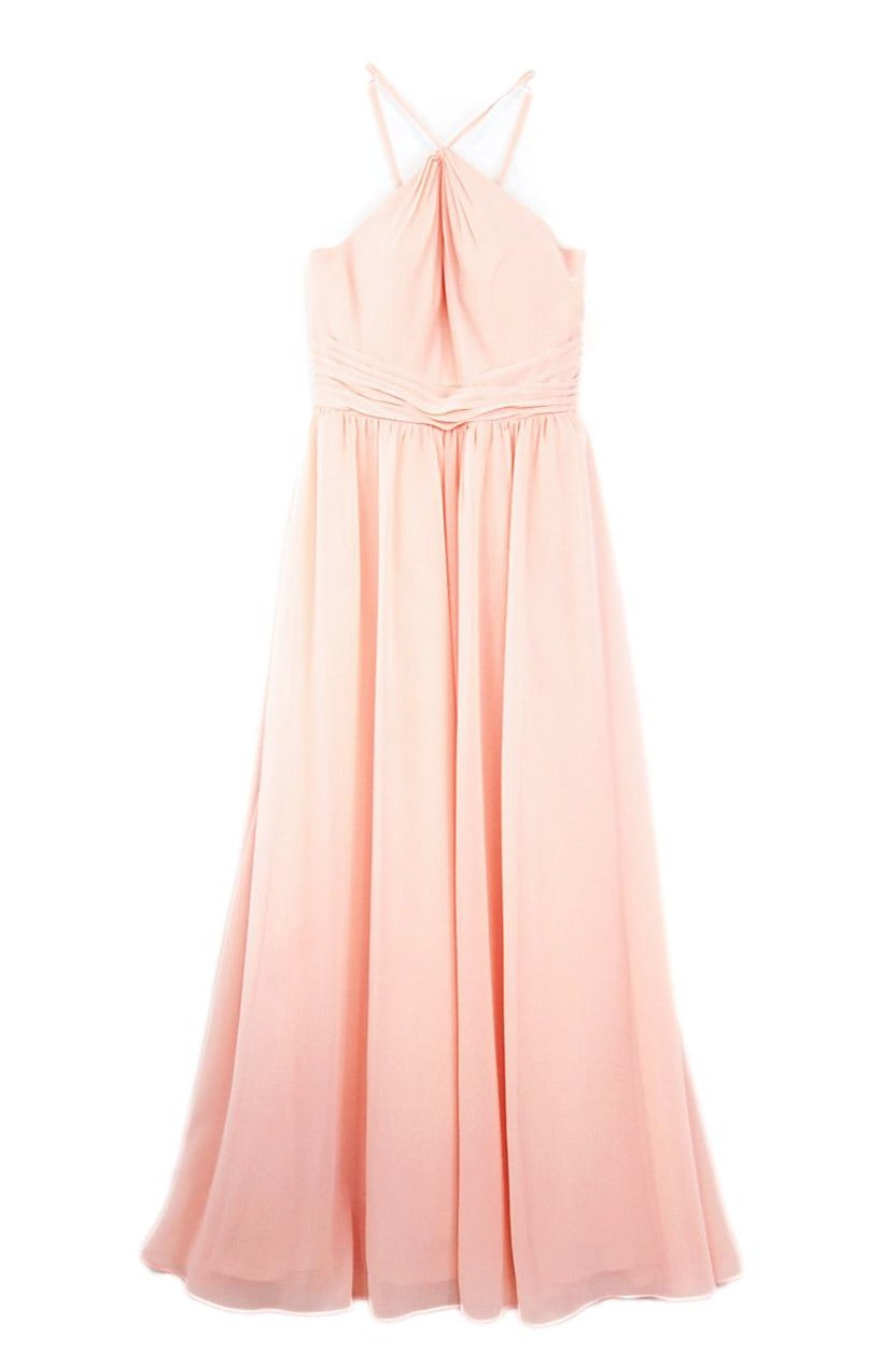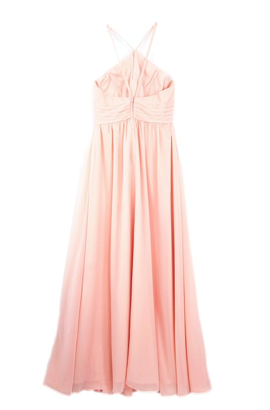 Chiffon high neck halter princess seam bodice with built-in bust padding, 3" keyhole at center front, spaghetti straps at neck, open back, pleated waistband, gathered a-line skirt