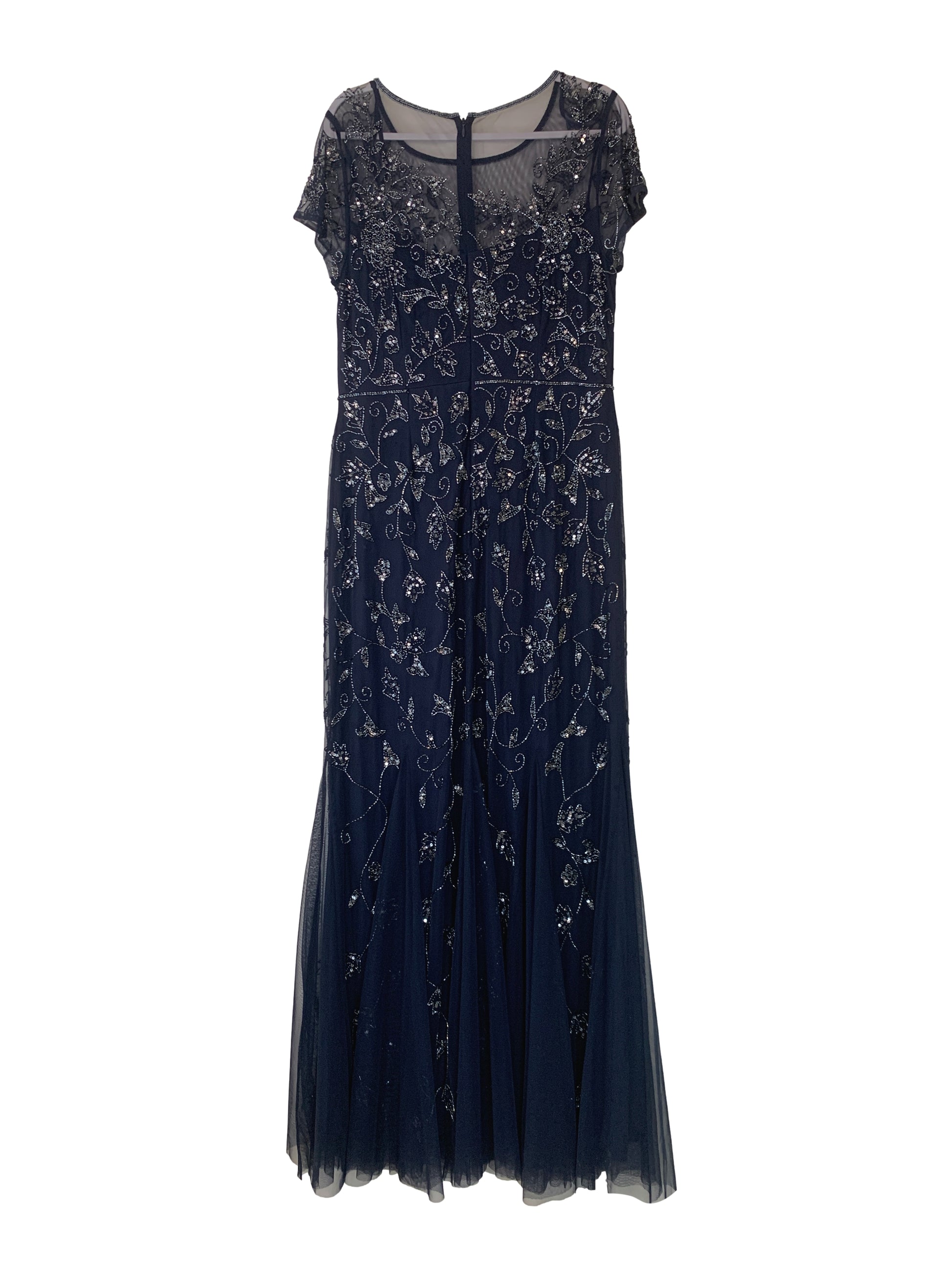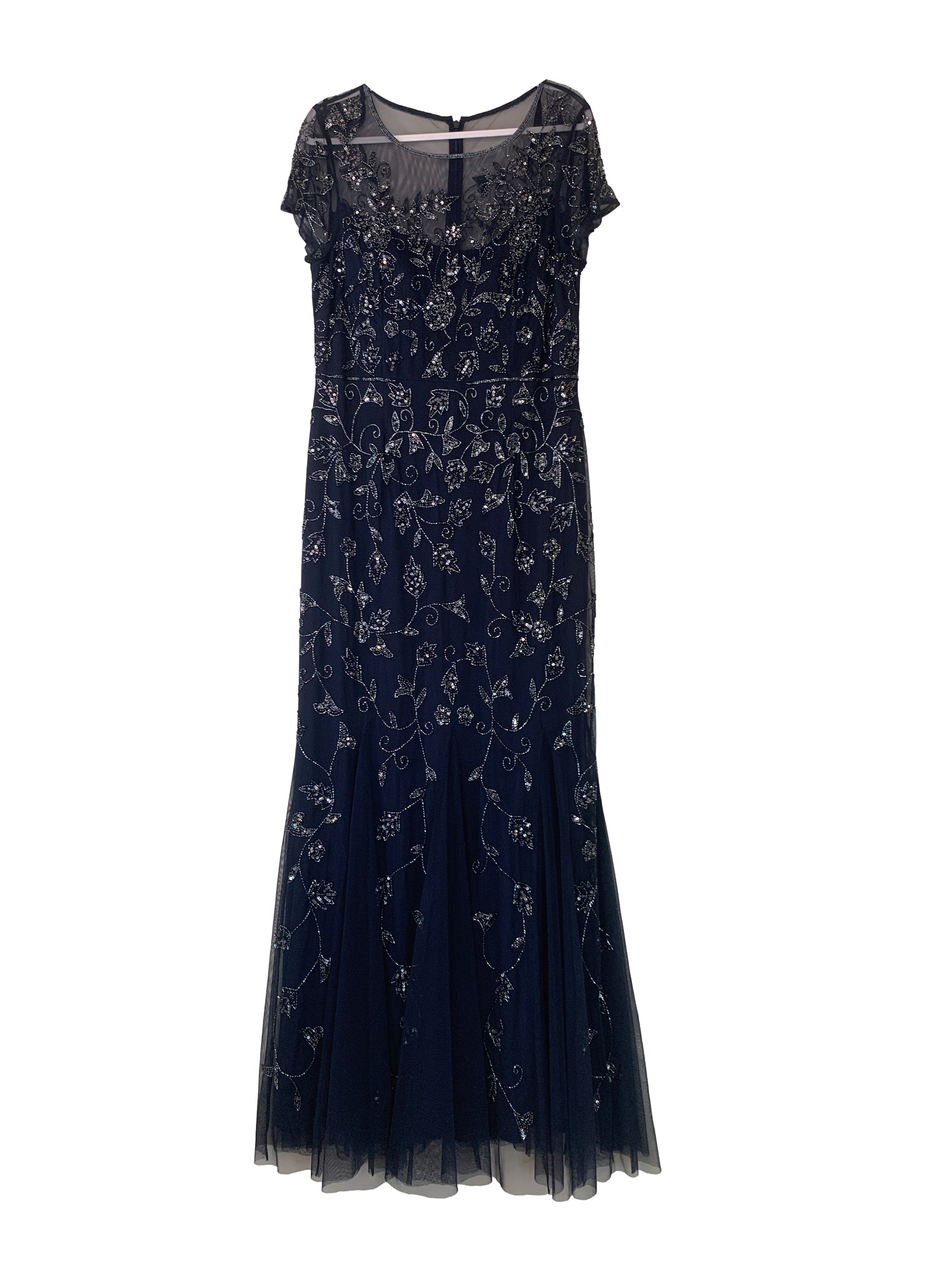 Jewel neckline with illusion mesh front and back bodice, natural waist, elegant short sleeves, fit and flare mermaid skirt with godets, covered in beautiful anthracite beading and sequins in floral motifs.