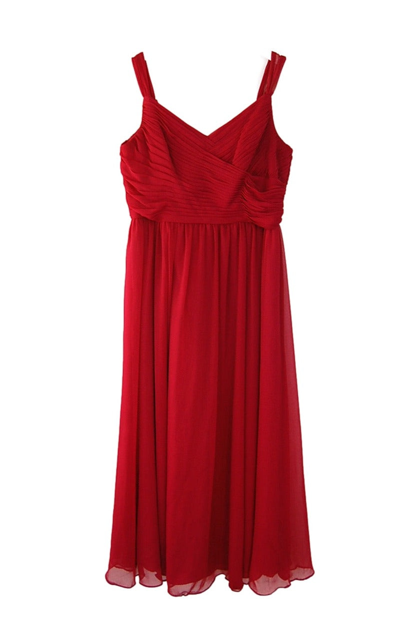 Crinkle chiffon pleated v-neck bodice, 1.5" wide straps, v-back, gathered A-line skirt.