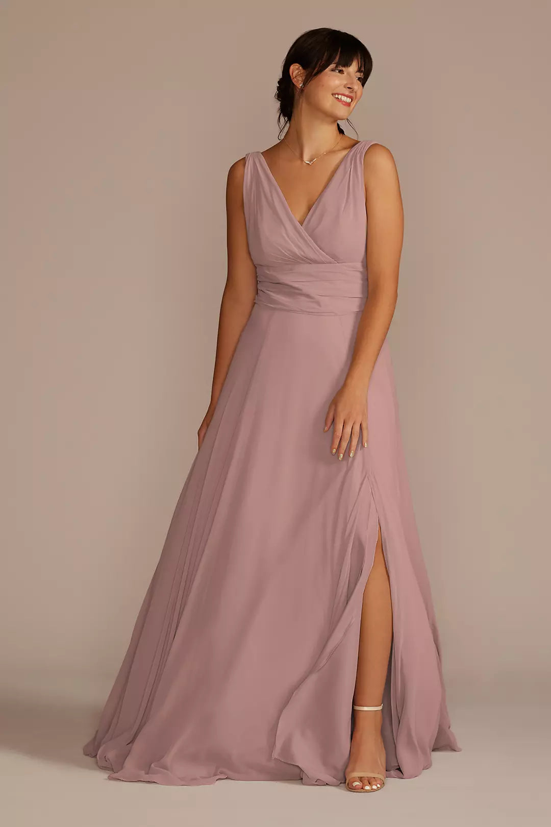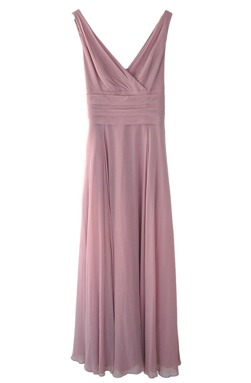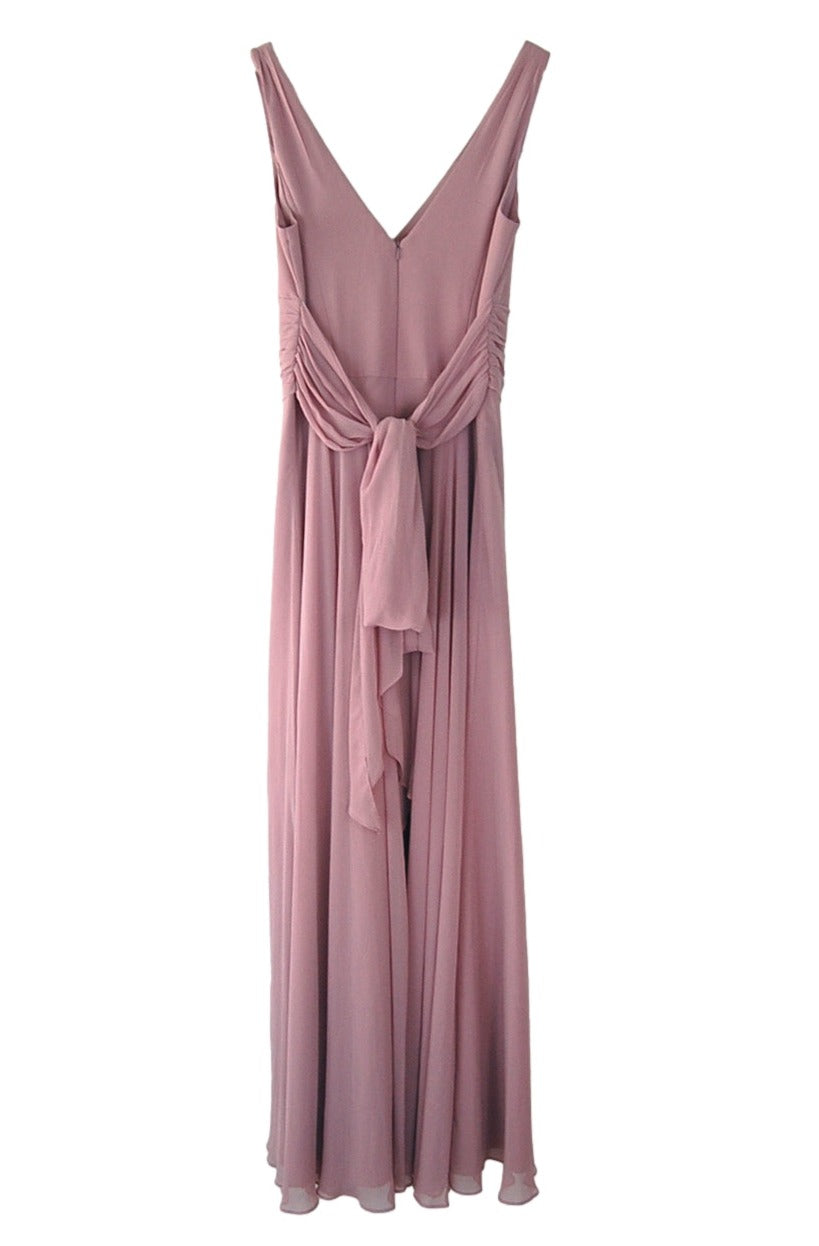 Chiffon v-neck, faux wrap, gathered extended empire bodice, 1.5" straps (bra friendly style), 3.5" pleated waistband, princess seam a-line skirt with streamers tying at the back