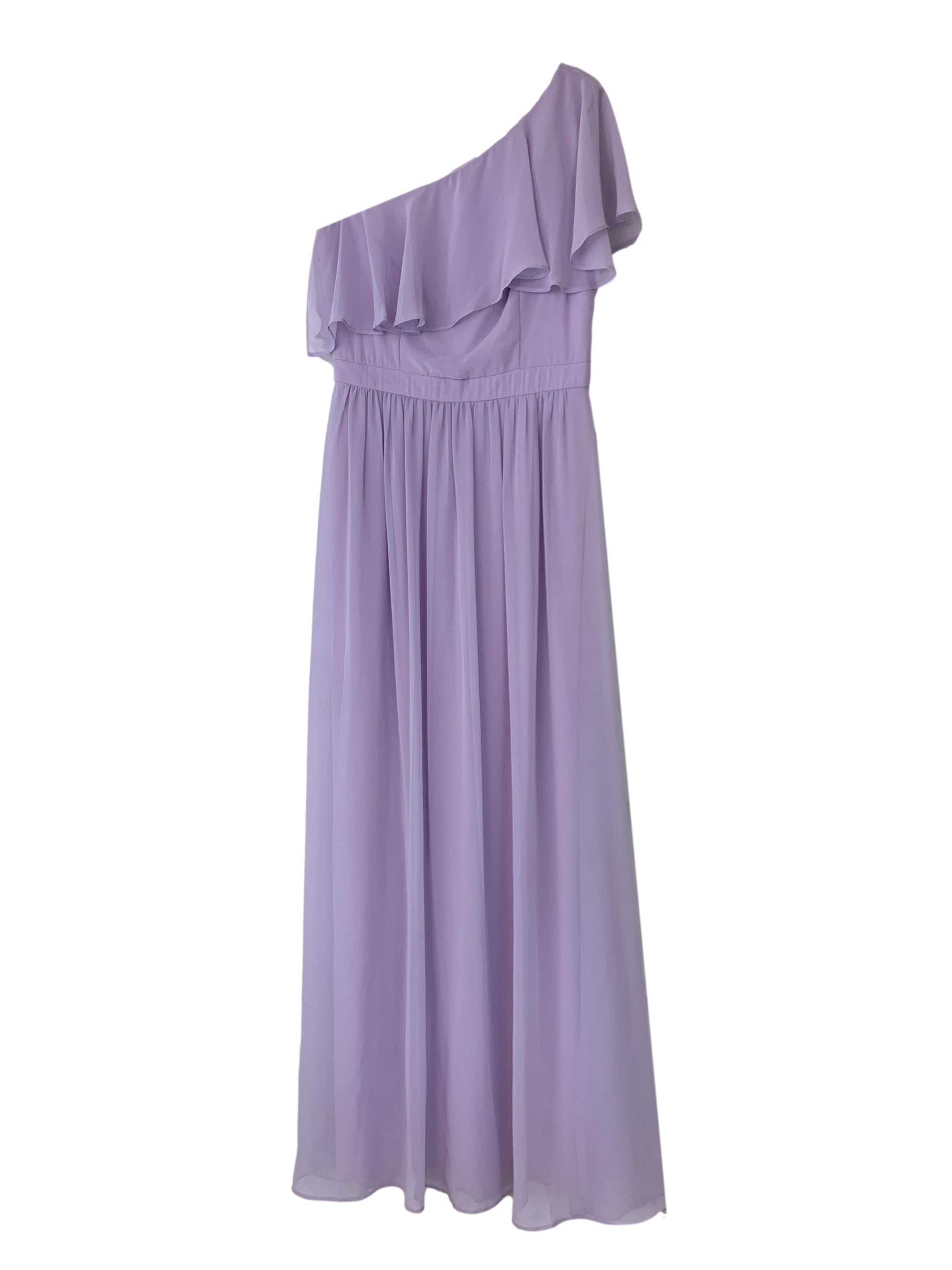 One shoulder (left) princess seam bodice with flowing fabric overlay at shoulder, creating flutter sleeve and flowing across bodice, gathered a-line skirt