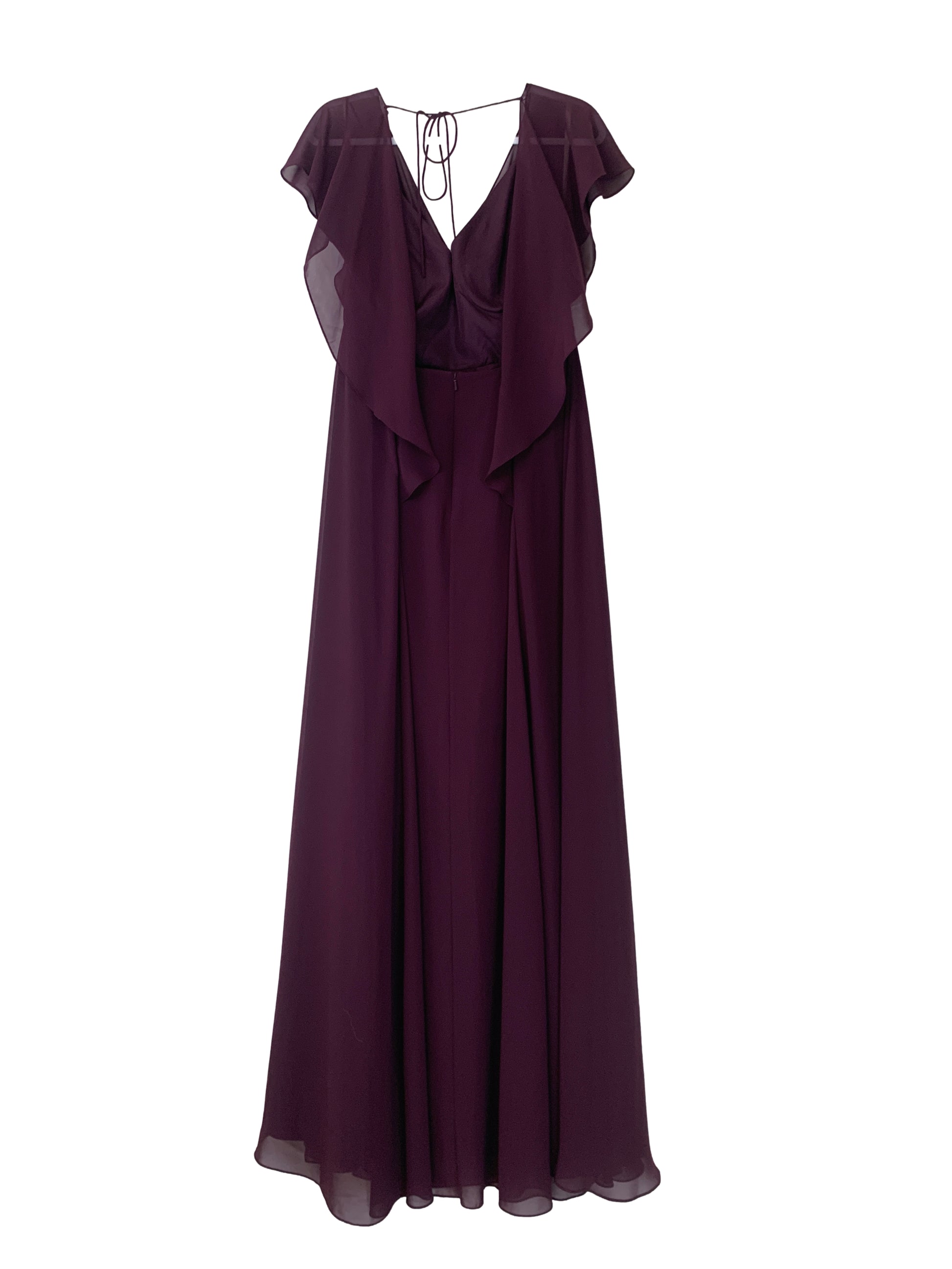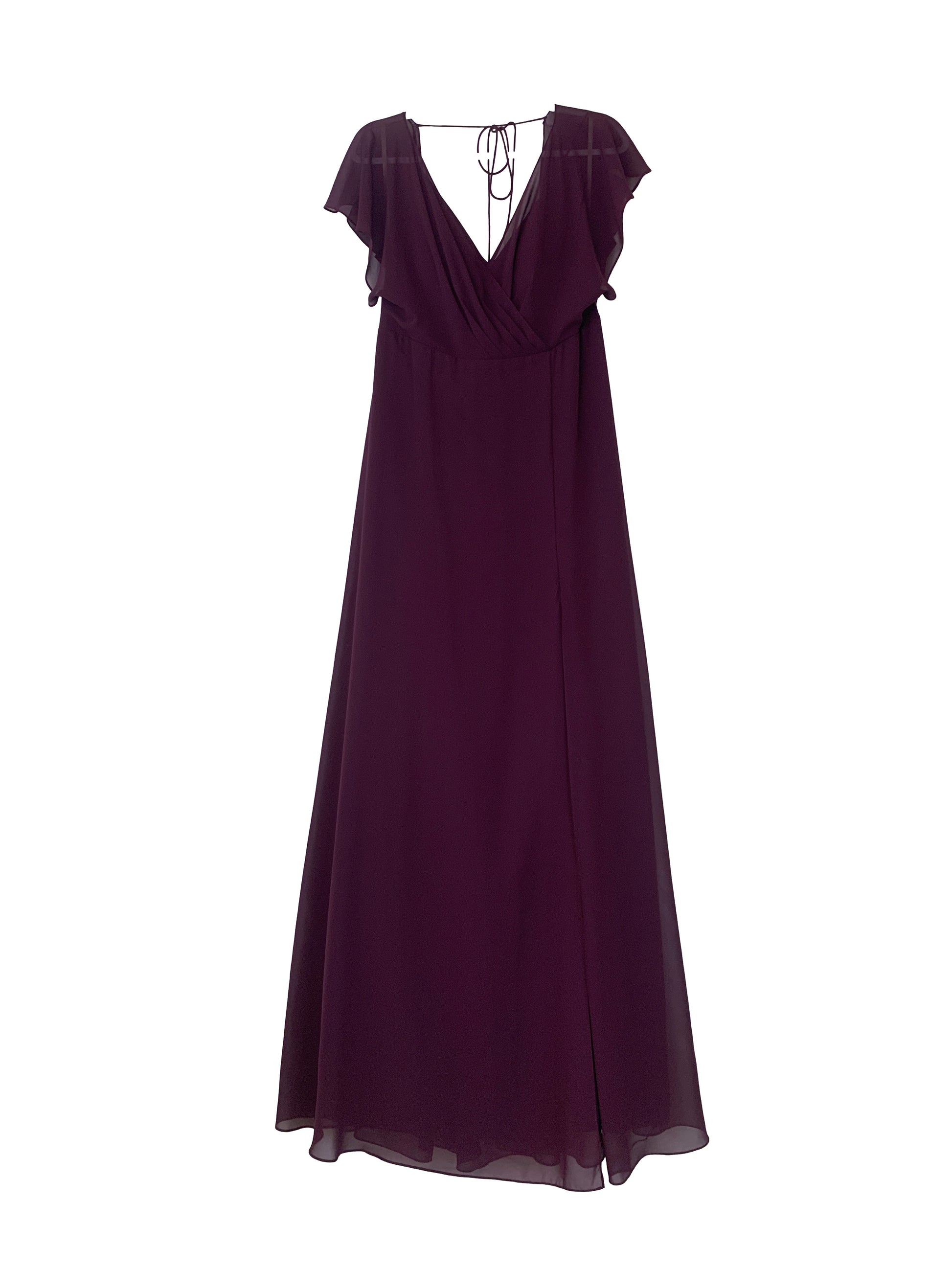 Chiffon v-neck surplice bodice, extended empire waist, flutter sleeve, v back with tie at back neck, a-line wrap skirt.