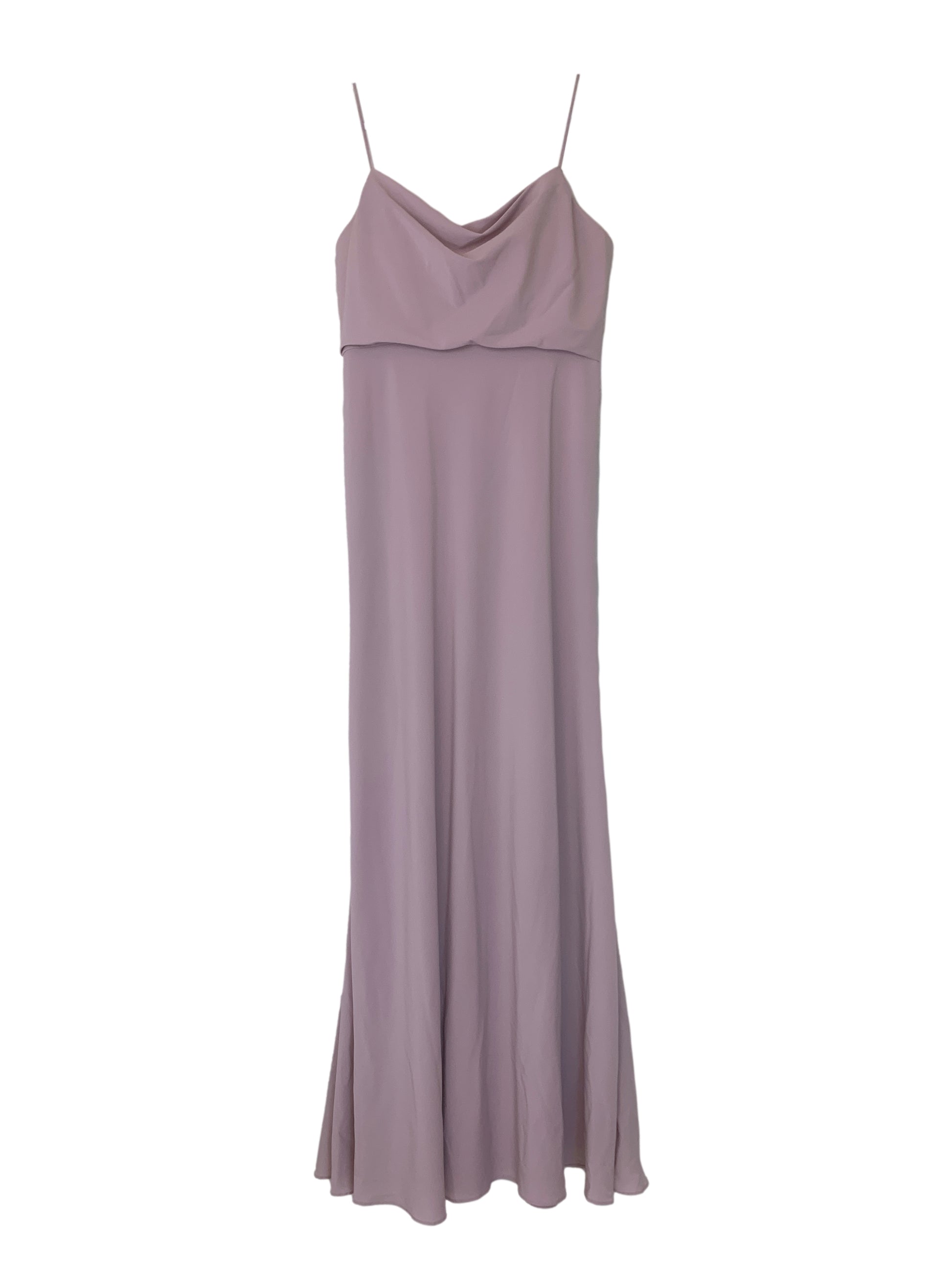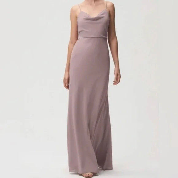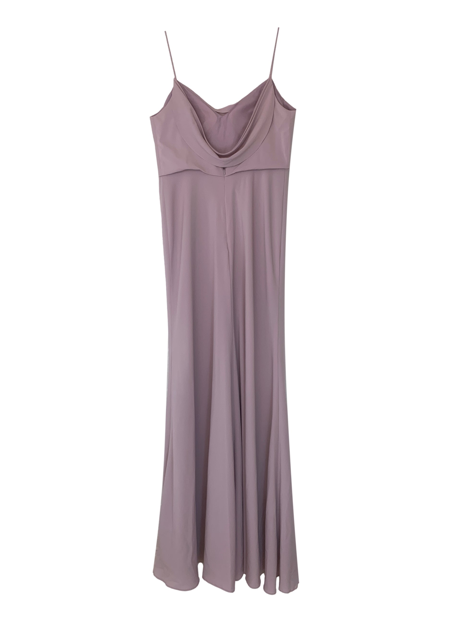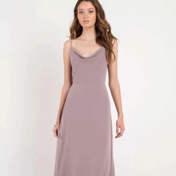 Crepe straight neckline with soft cowl, spaghetti straps, extended empire waist, elegant scop back with drape, soft a-line skirt