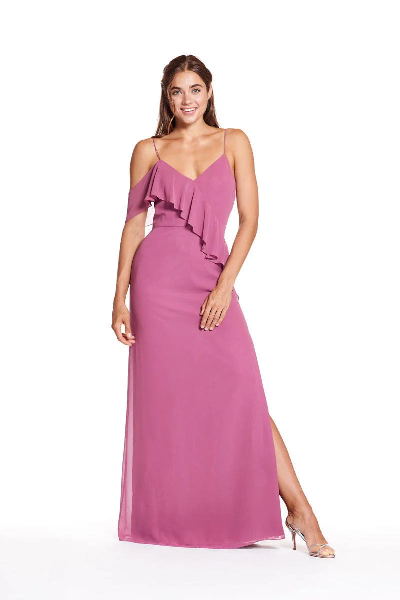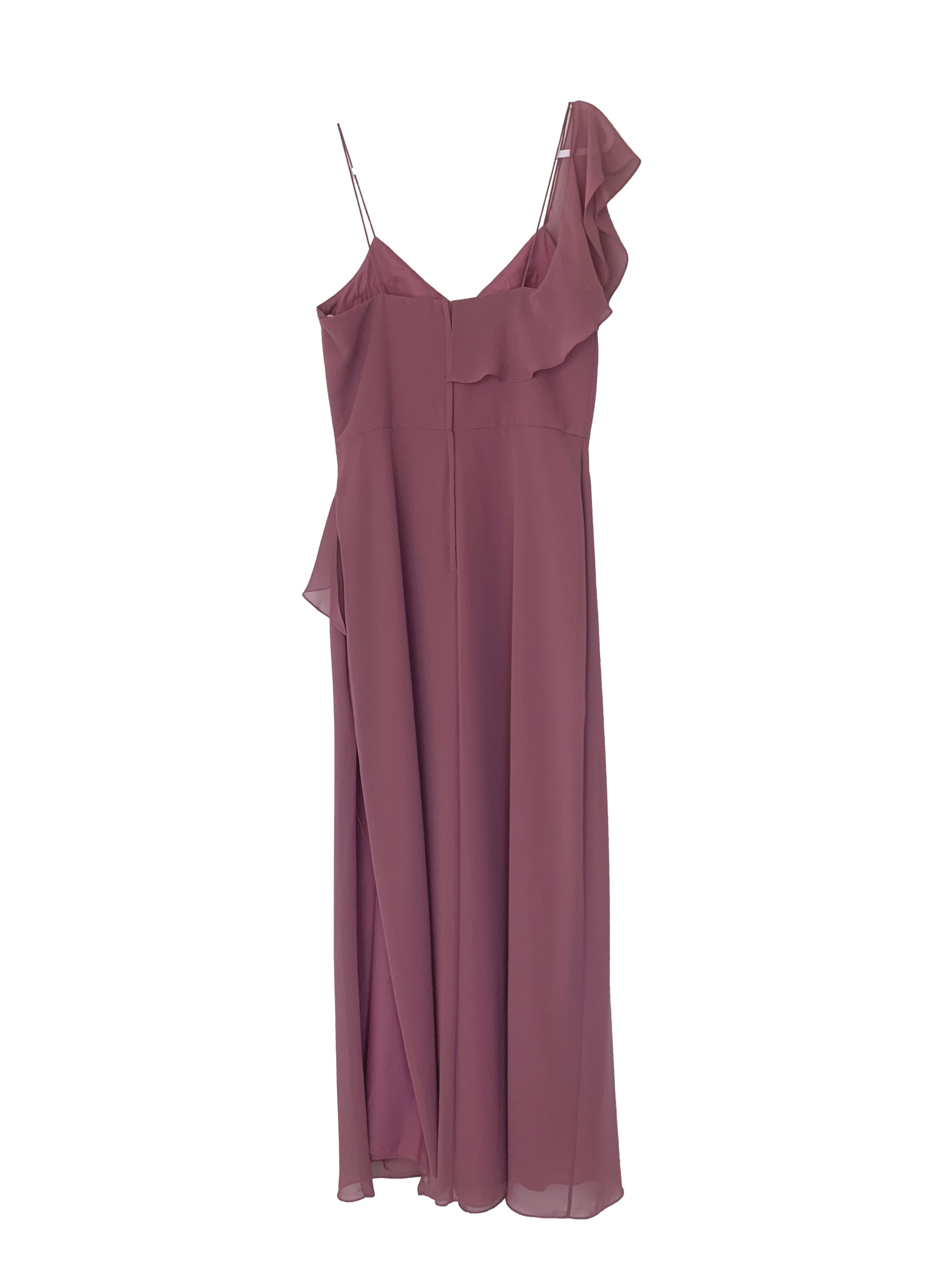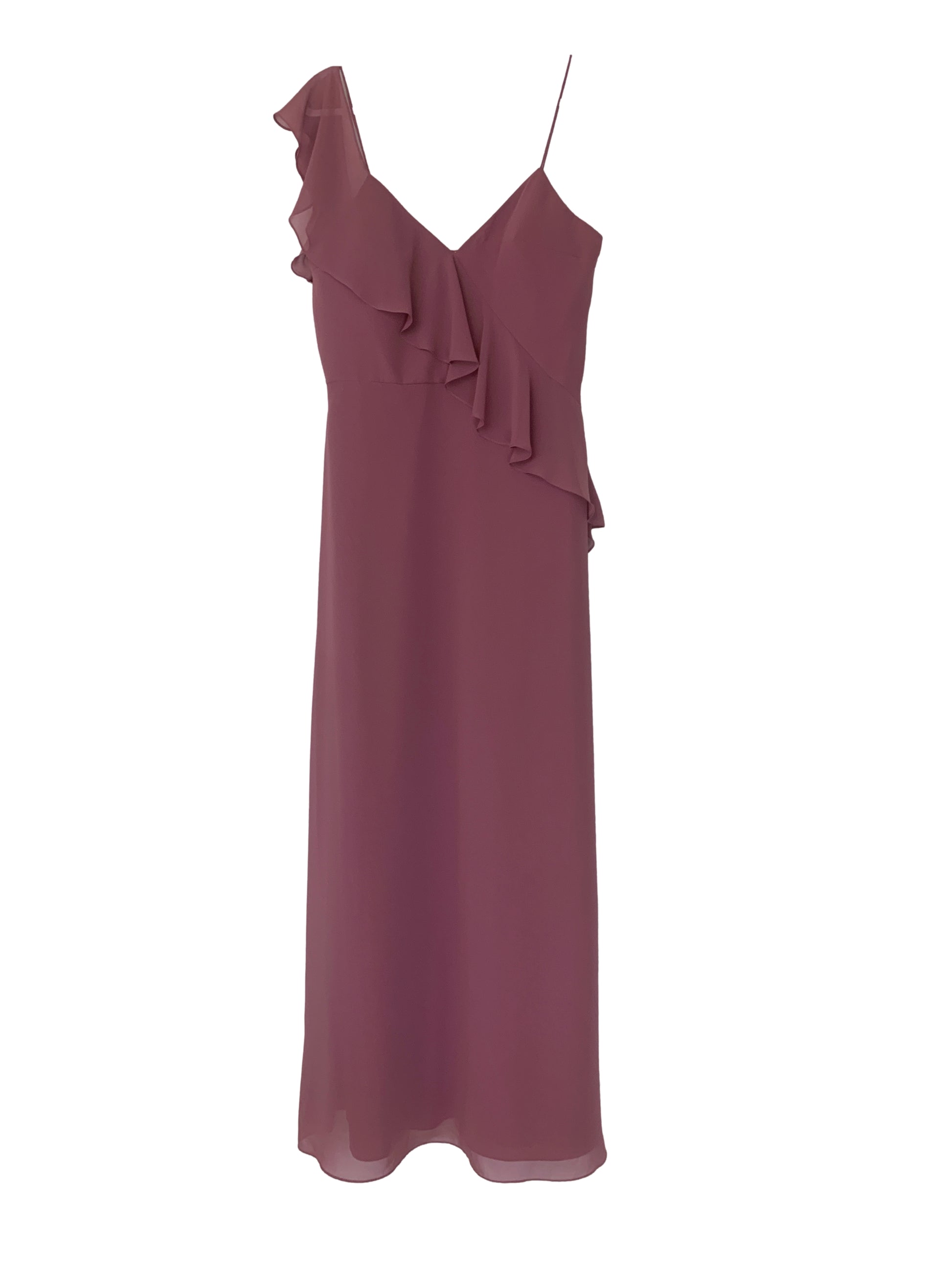 Soft chiffon, spaghetti straps, ruffle from center back flows over right shoulder and cascades across body to left hip, a-line skirt