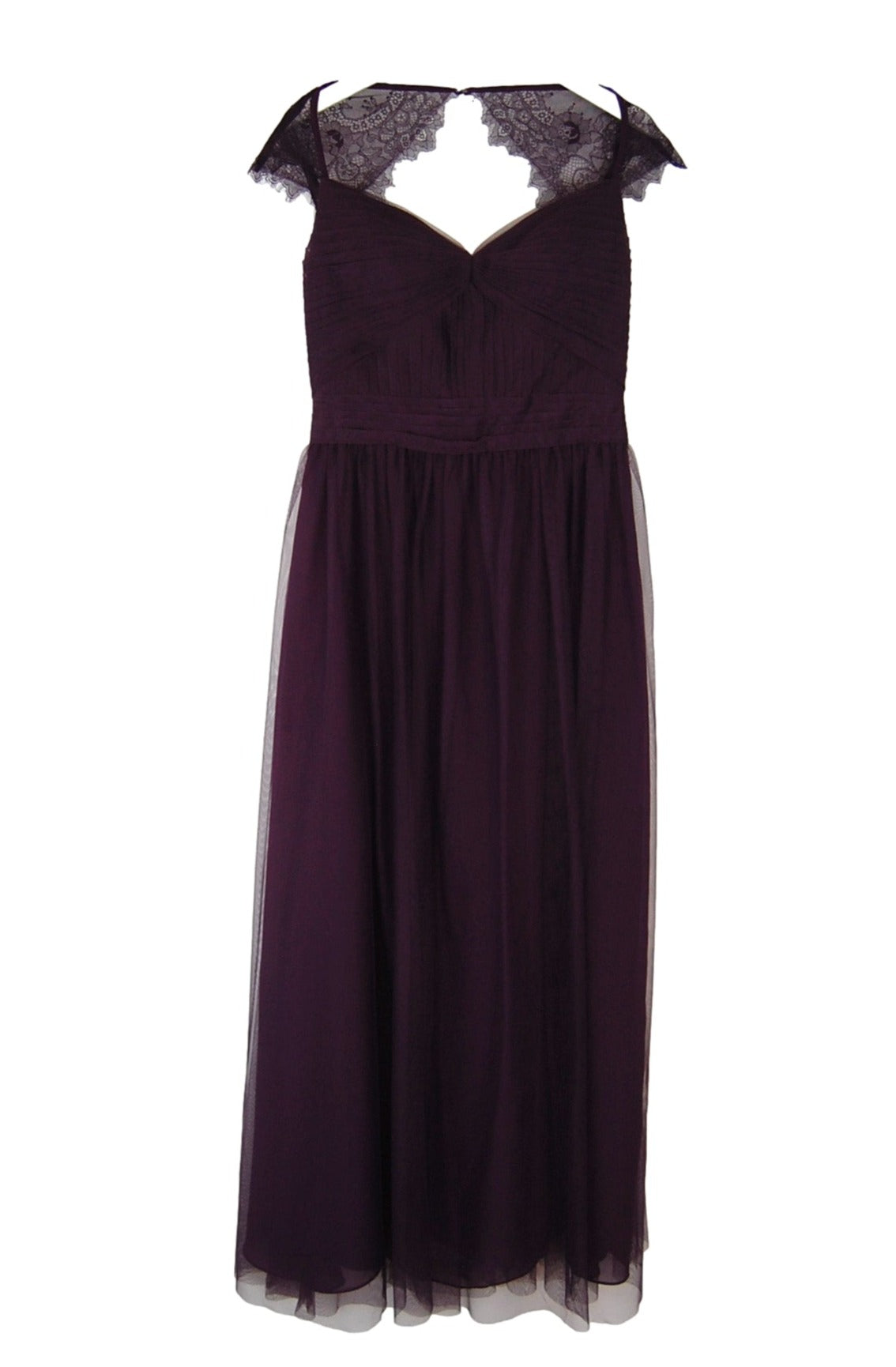 Tulle and lace, beautifully draped wide v neckline with built-in bust padding, lace cap sleeves, semi-open back, gathered v-neck skirt