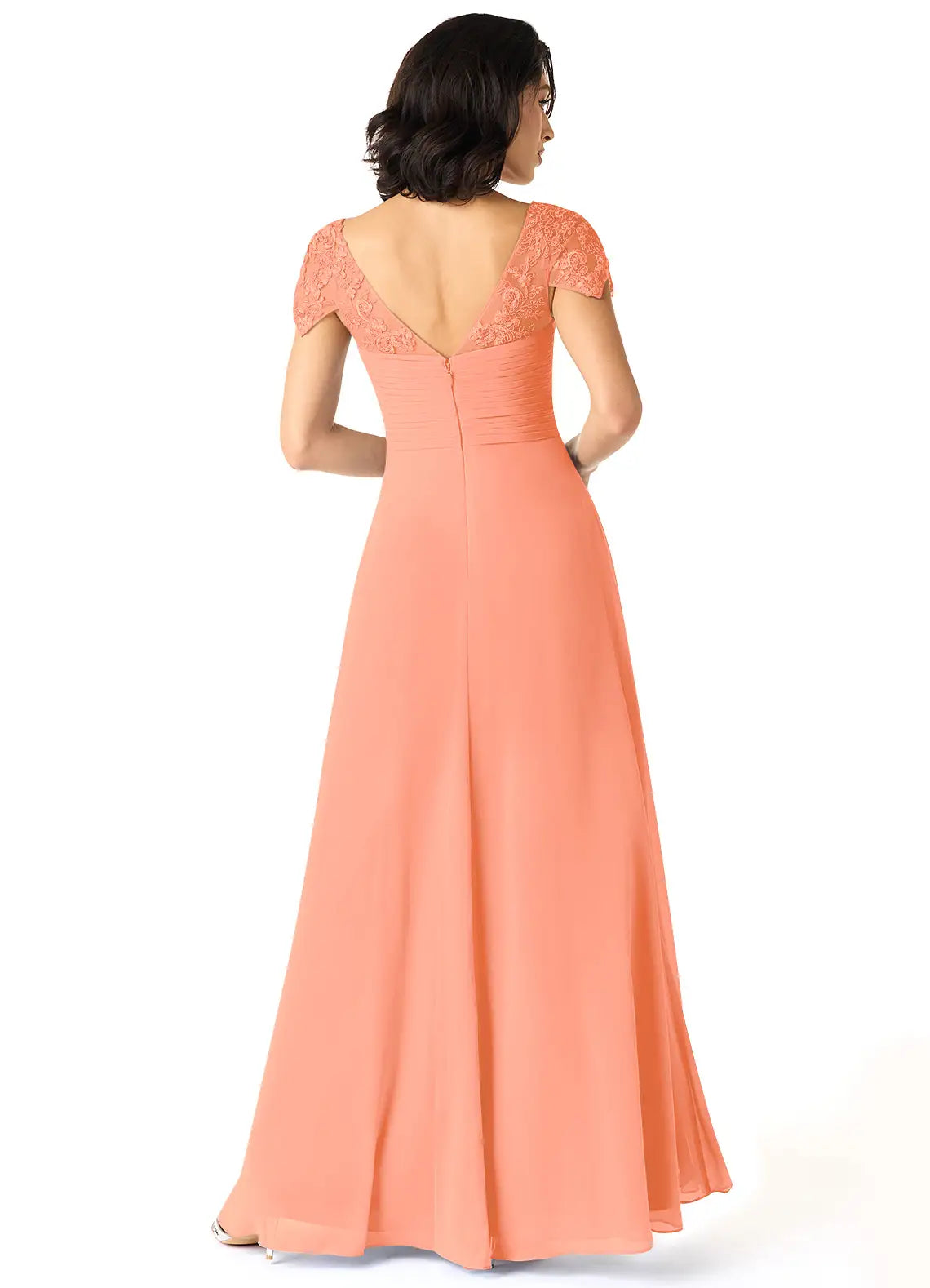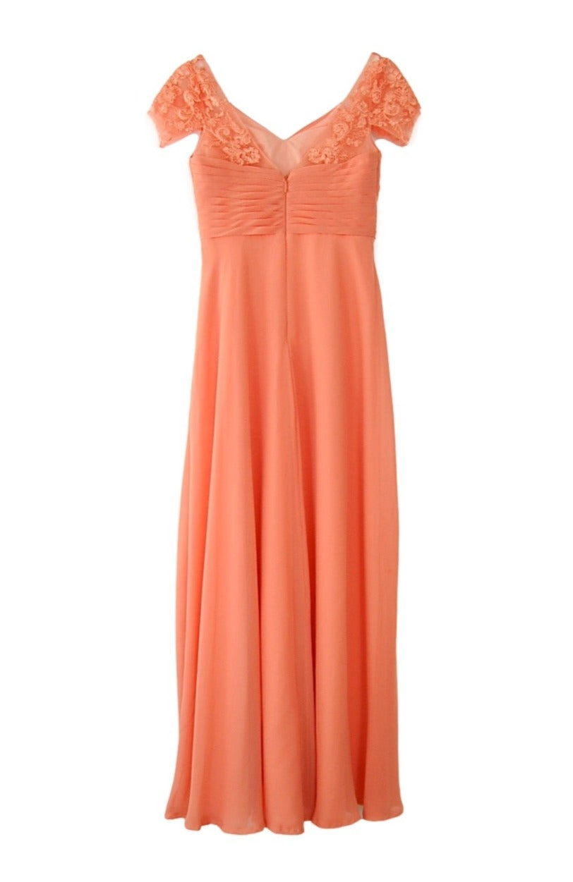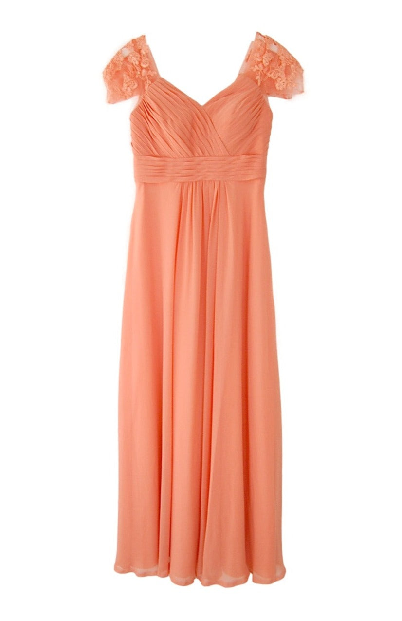 Chiffon and embroidered lace v-neck extended empire pleated bodice with boning, embroidered floral lace cap sleeves, 2.5" pleated waistband, a-line skirt with gathers at front waist.