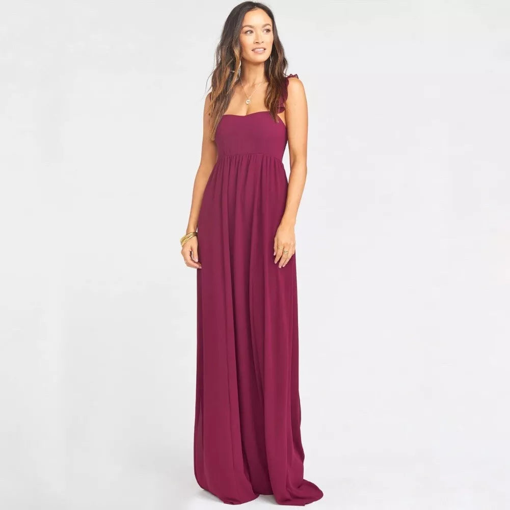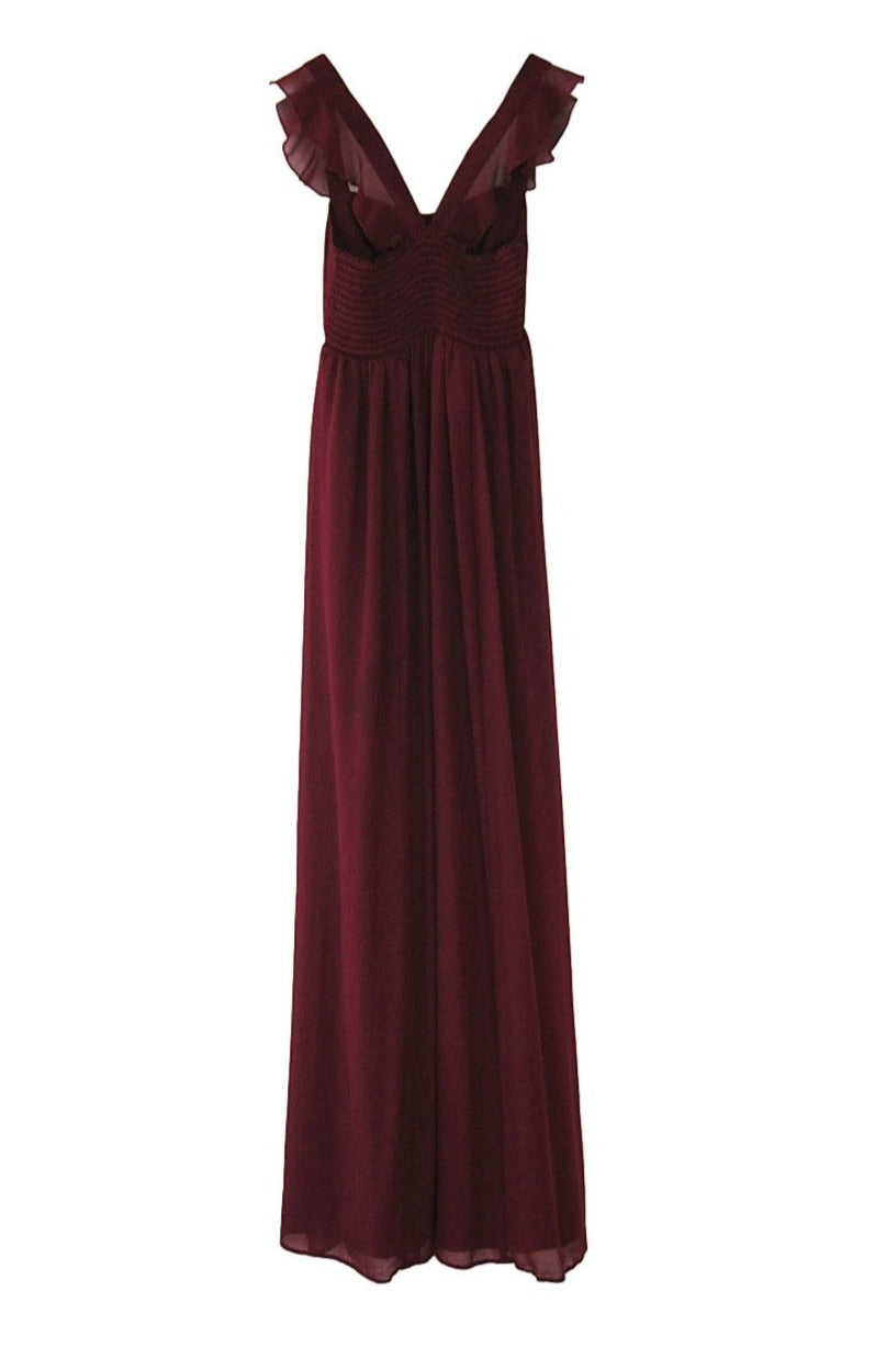 Chiffon princess seamed bodice with smocked elasticized back bodice, 1" straps with 1.5" ruffle, straps meet at center back, gathered a-line skirt