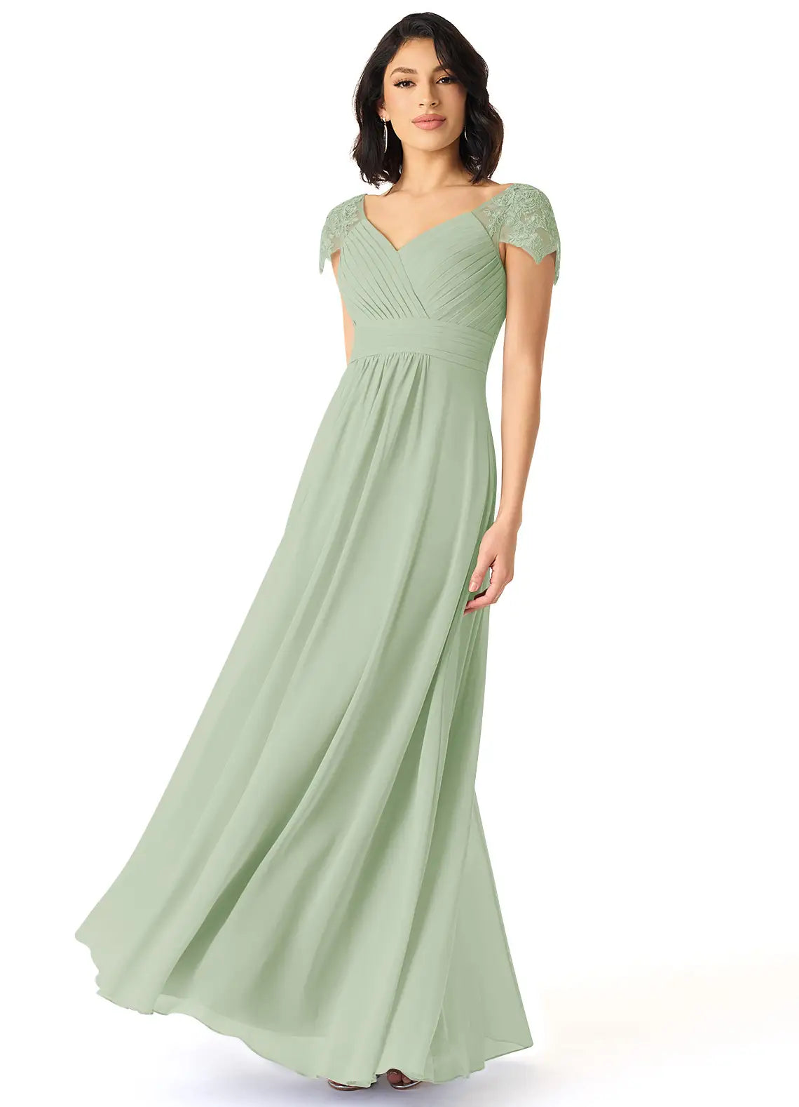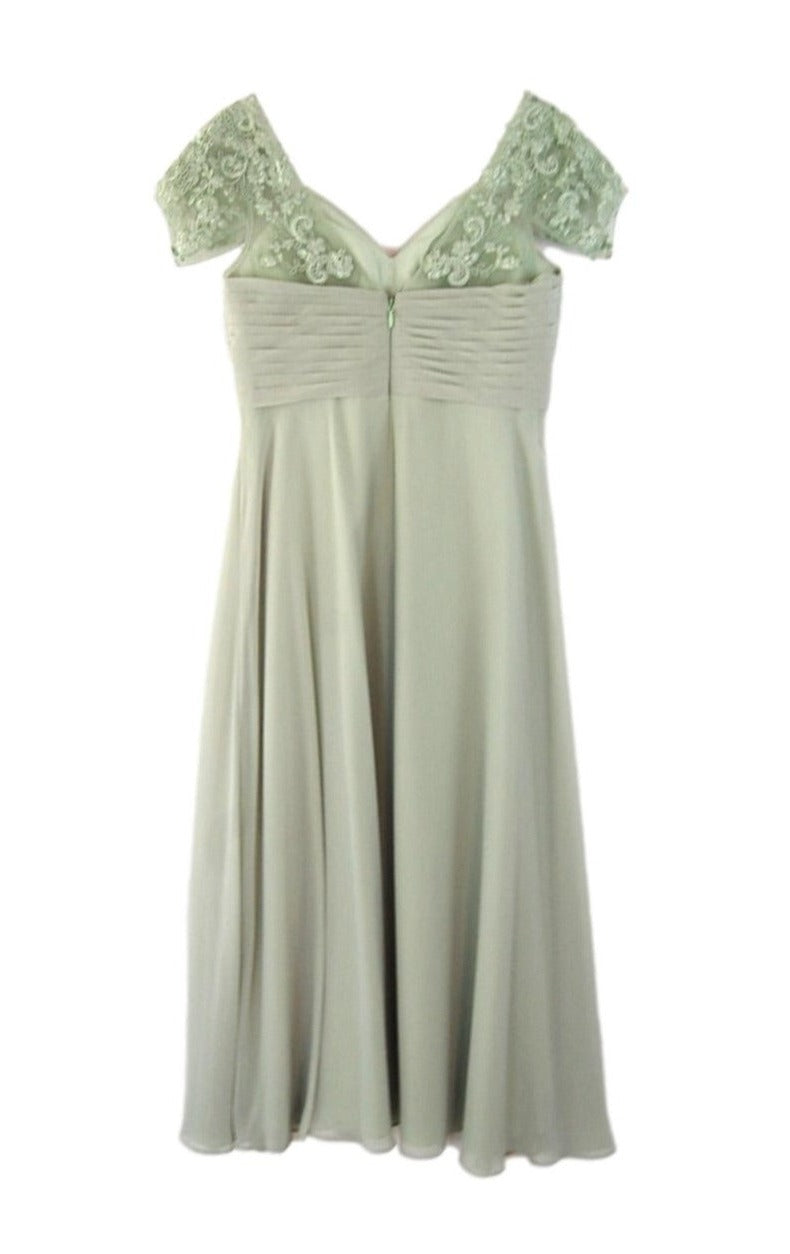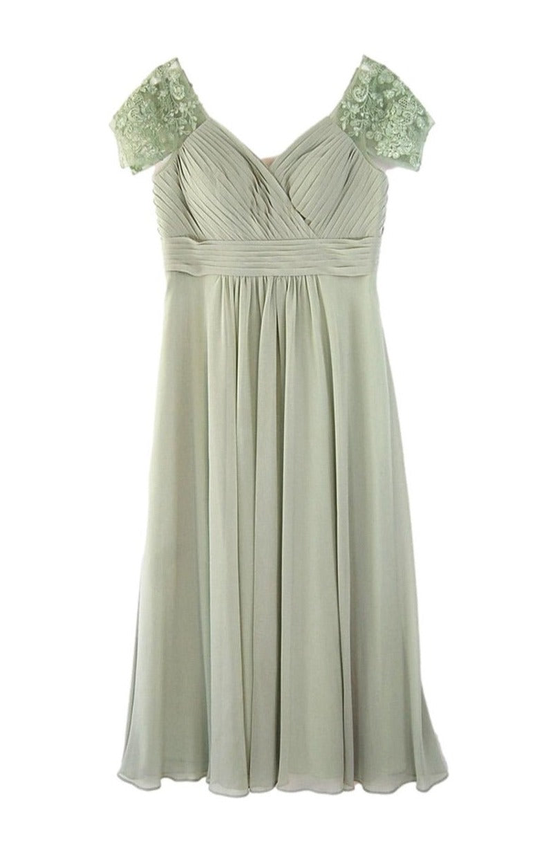 Chiffon and embroidered lace v-neck extended empire pleated bodice with boning, embroidered floral lace cap sleeves, 2.5" pleated waistband, a-line skirt with gathers at front waist.