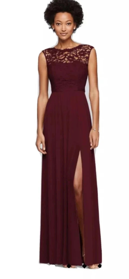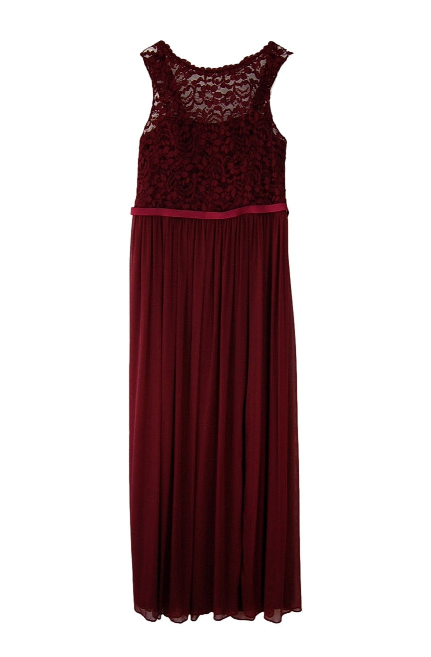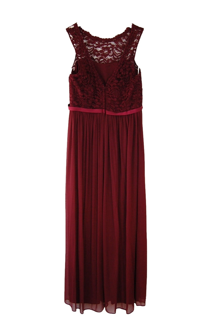 Chiffon sweetheart bodice with built-in bust padding, boatneck lace bodice overlay, 2" straps, v back neckline, 1" grosgrain ribbon at waist, gathered a-line skirt