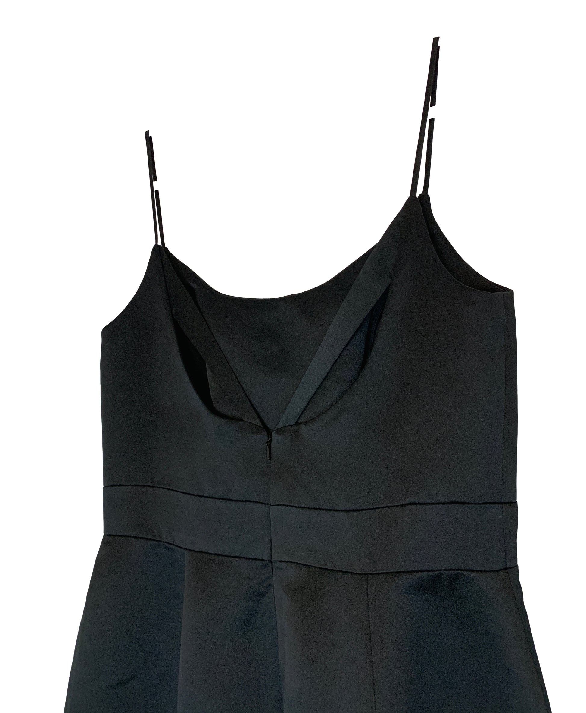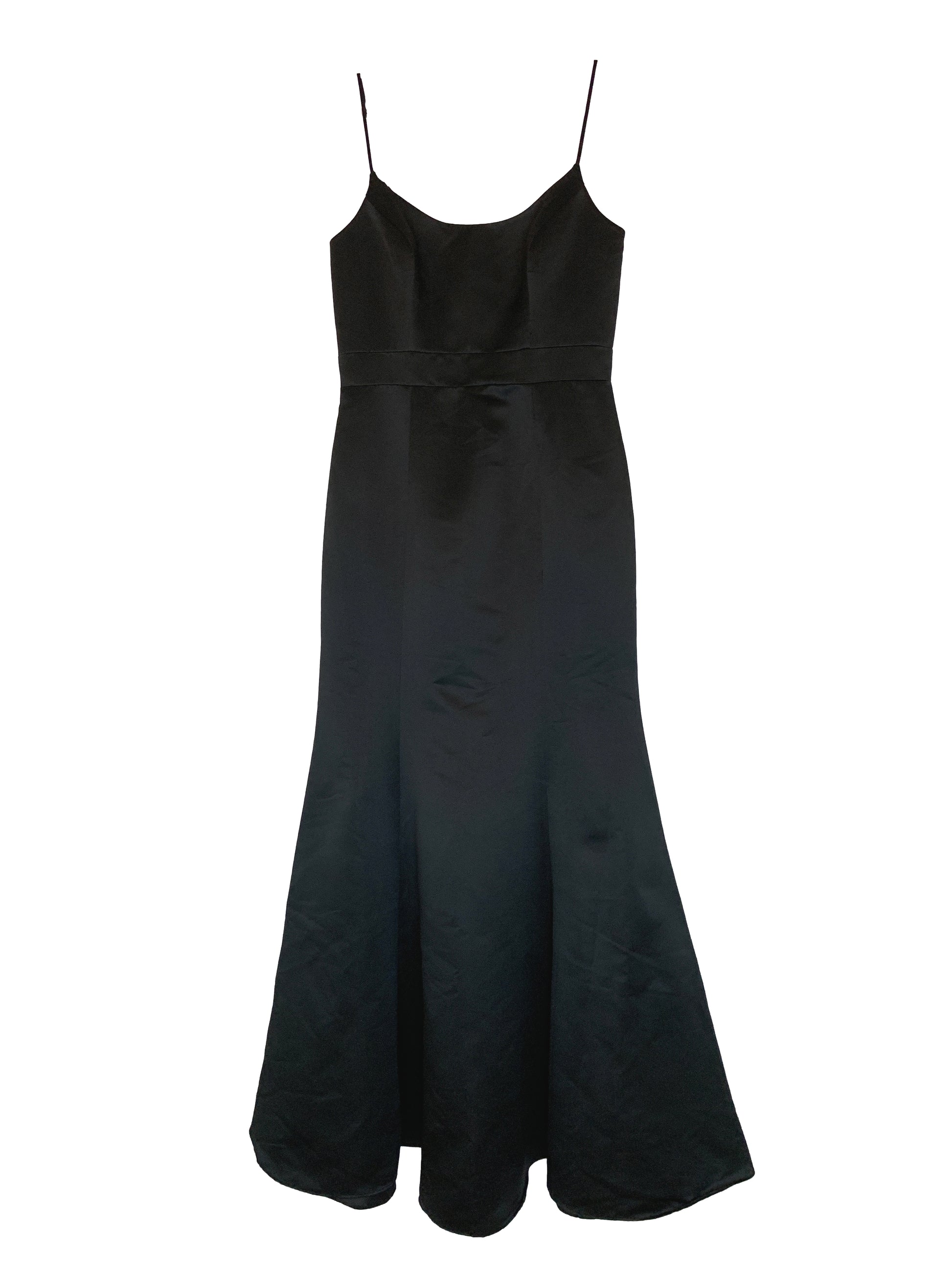 Satin straight neckline, spaghetti straps, extended empire bodice, 1.5" waistband, open back with cutouts, fit and flare trumpet skirt.
