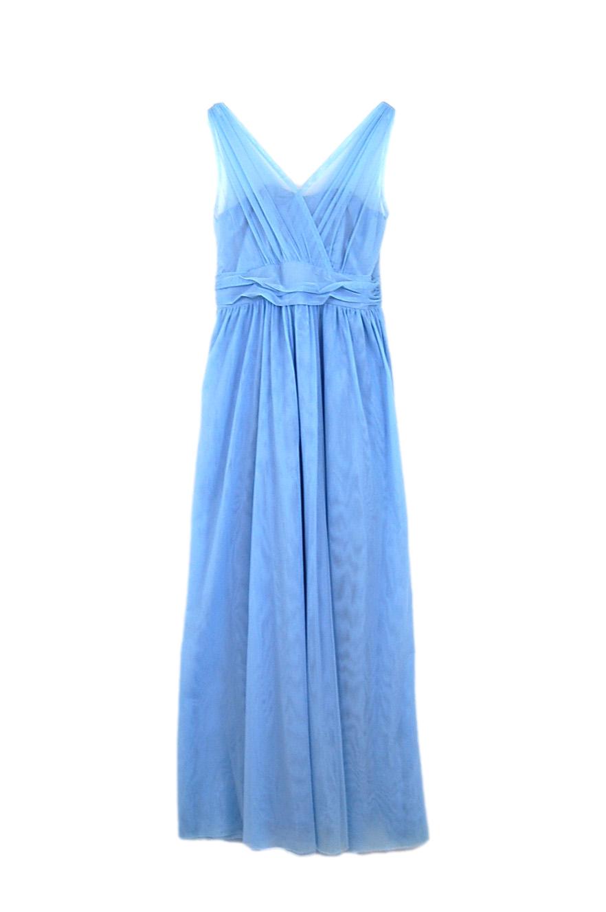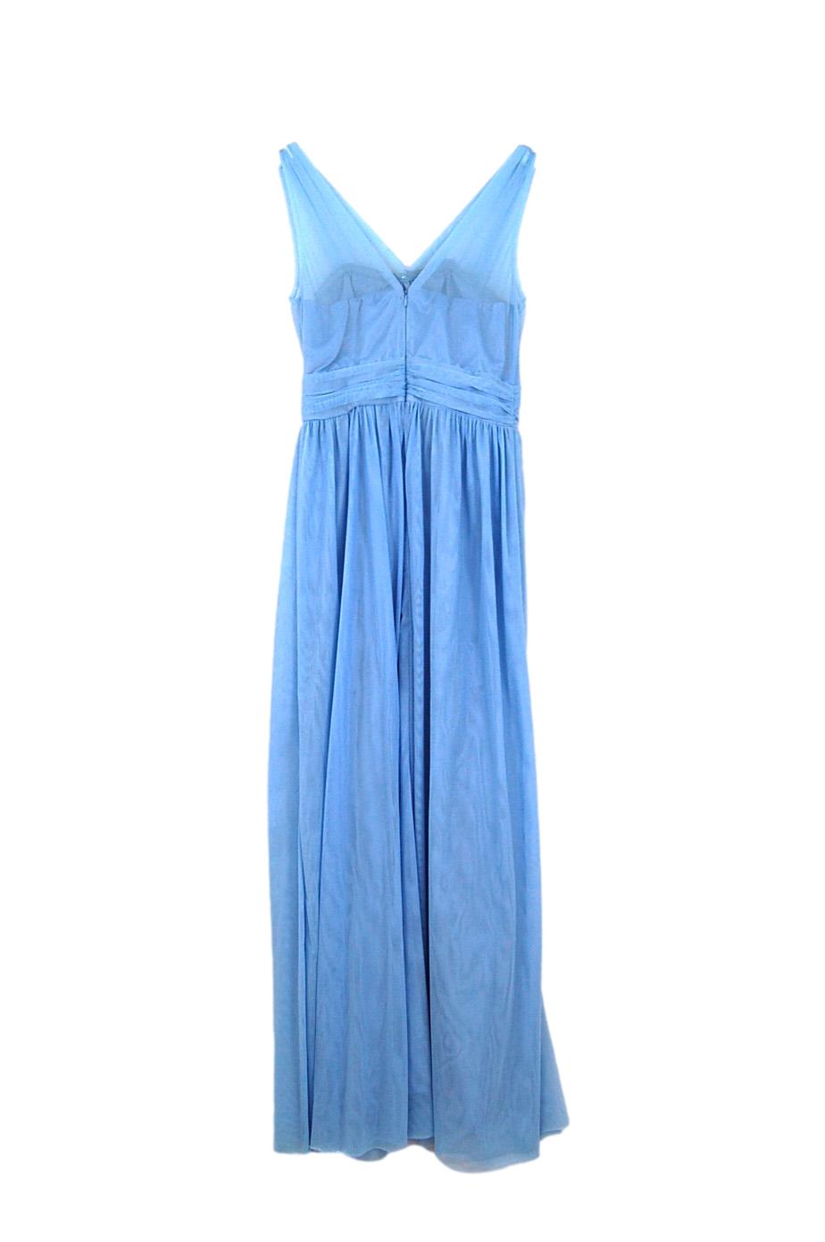 Stretch mesh extended empire boned bodice with faux wrap tulle overlay, v-neck with gathers at bust, 2" wide straps, v back neckline, 2.5" waistband, gathered a-line skirt