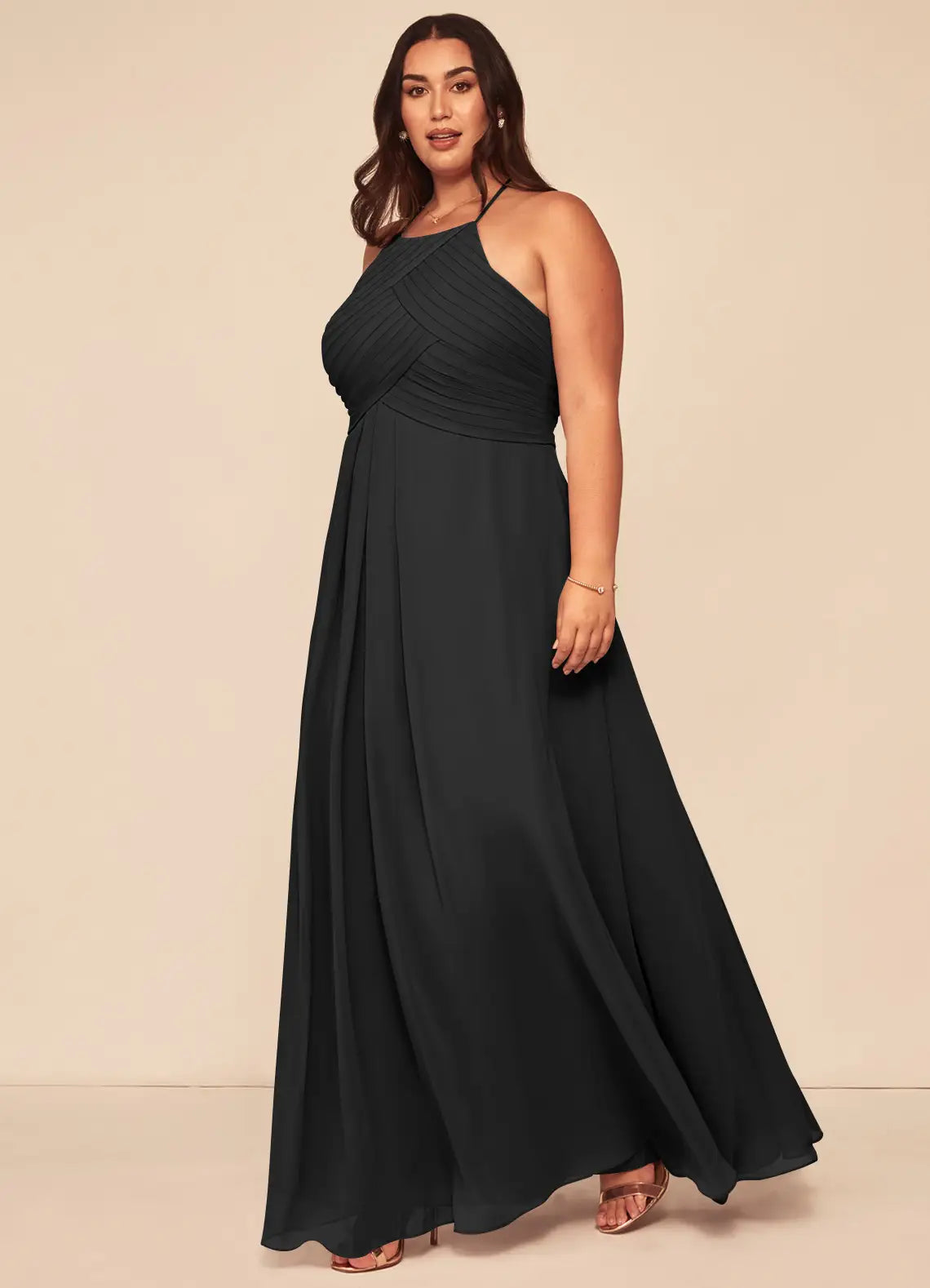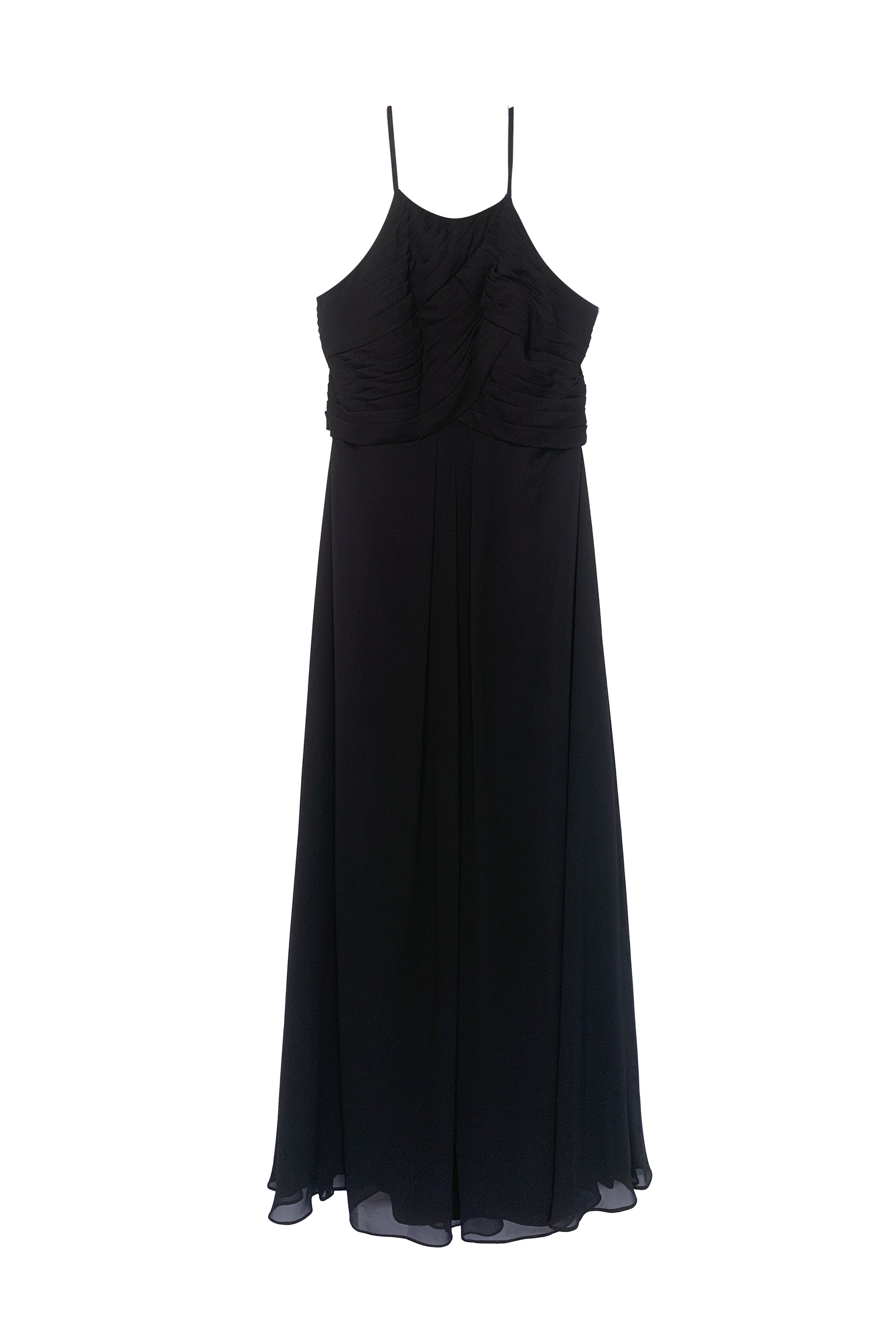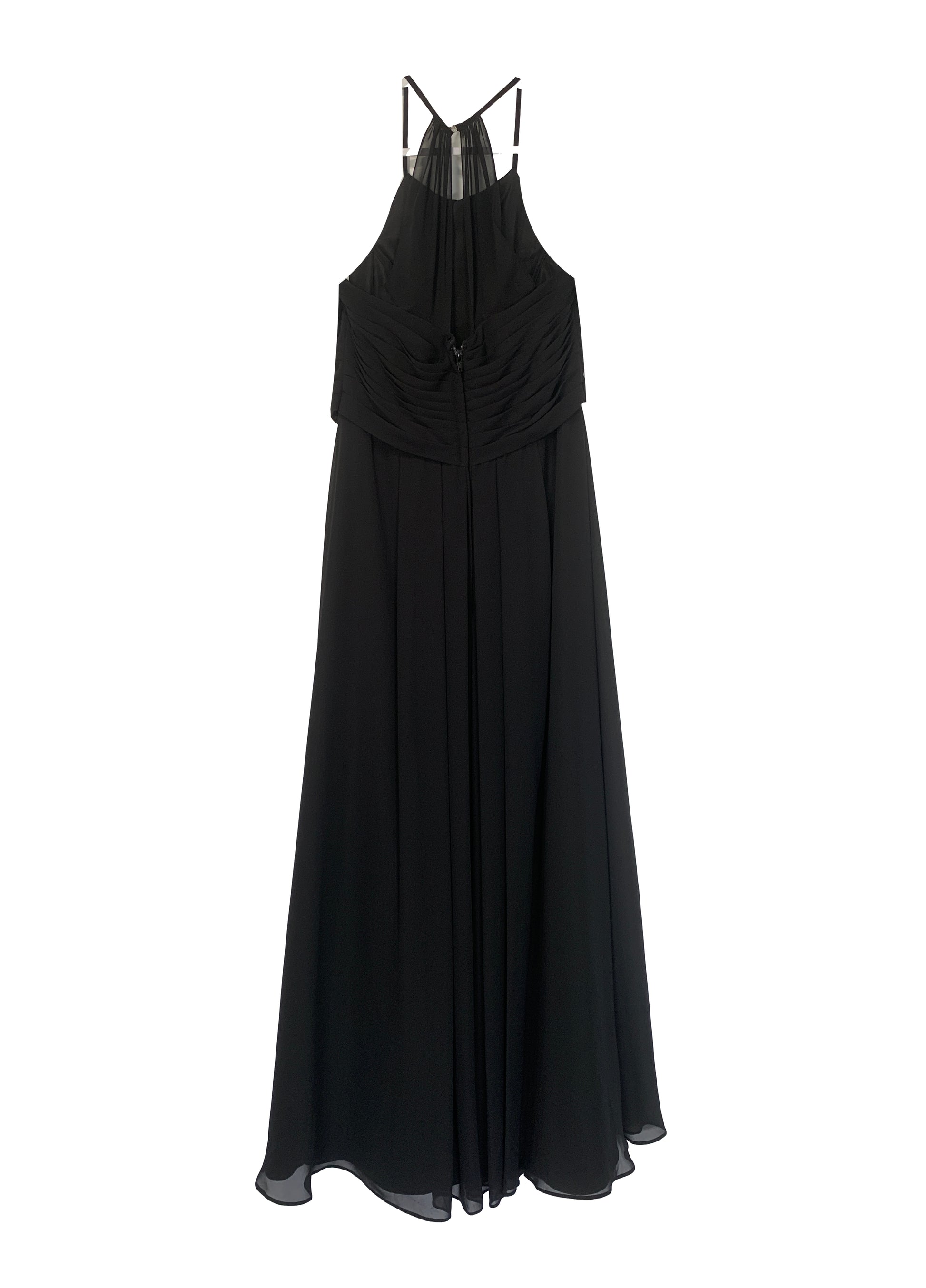 High neck halter draped, pleated bodice with inset padding, spaghetti straps, semi-open back, a-line skirt, pleating at front waist, gathers at back.