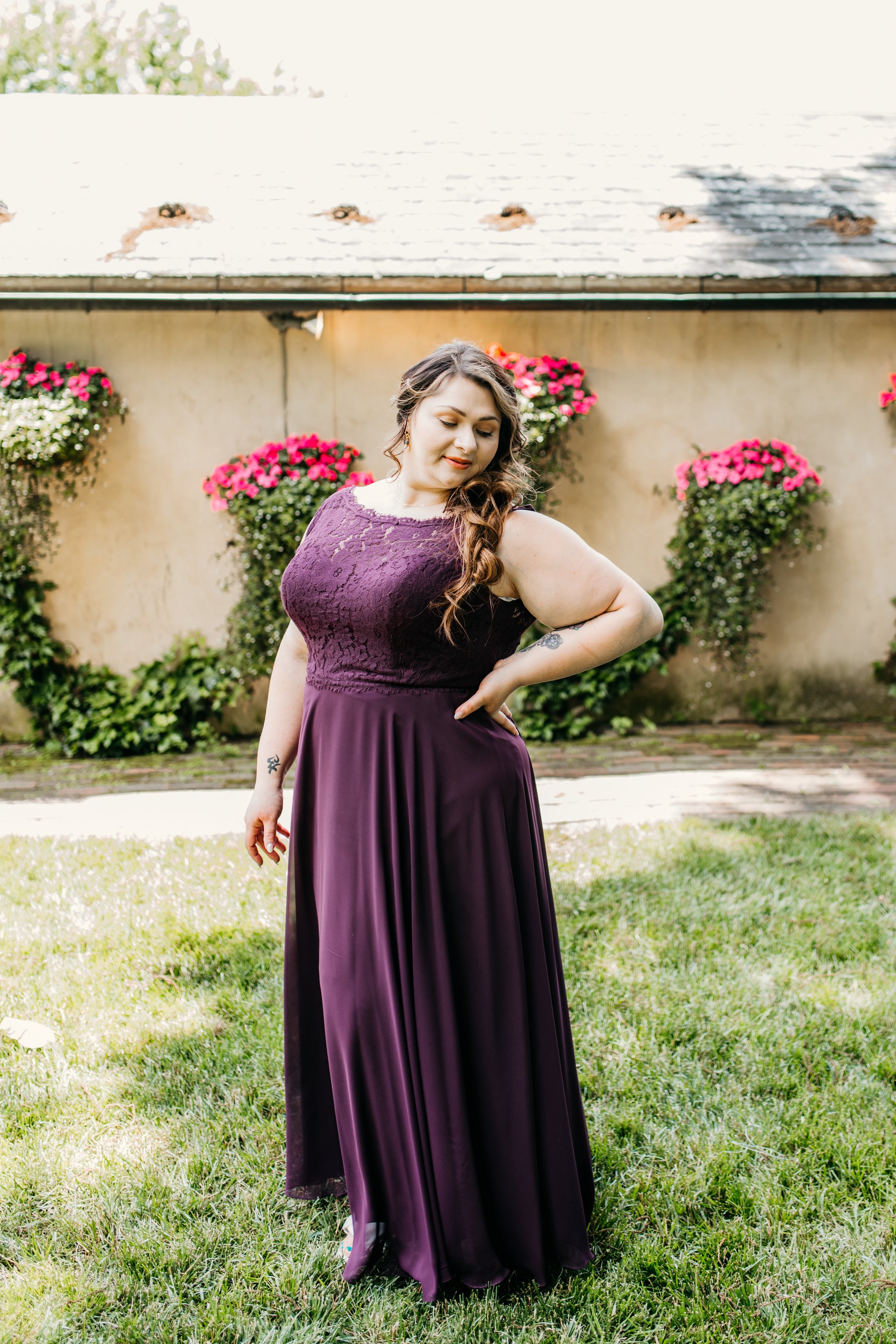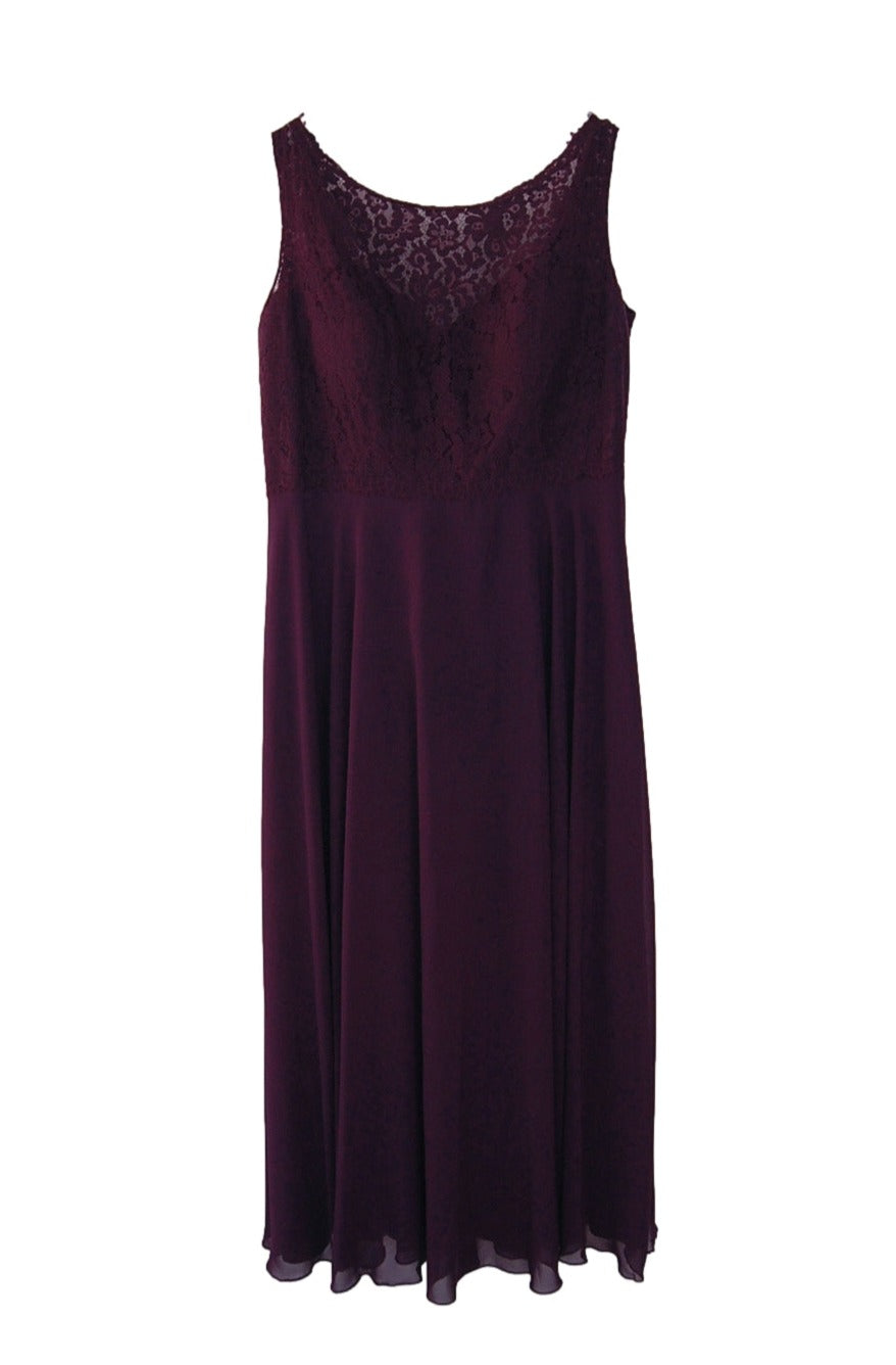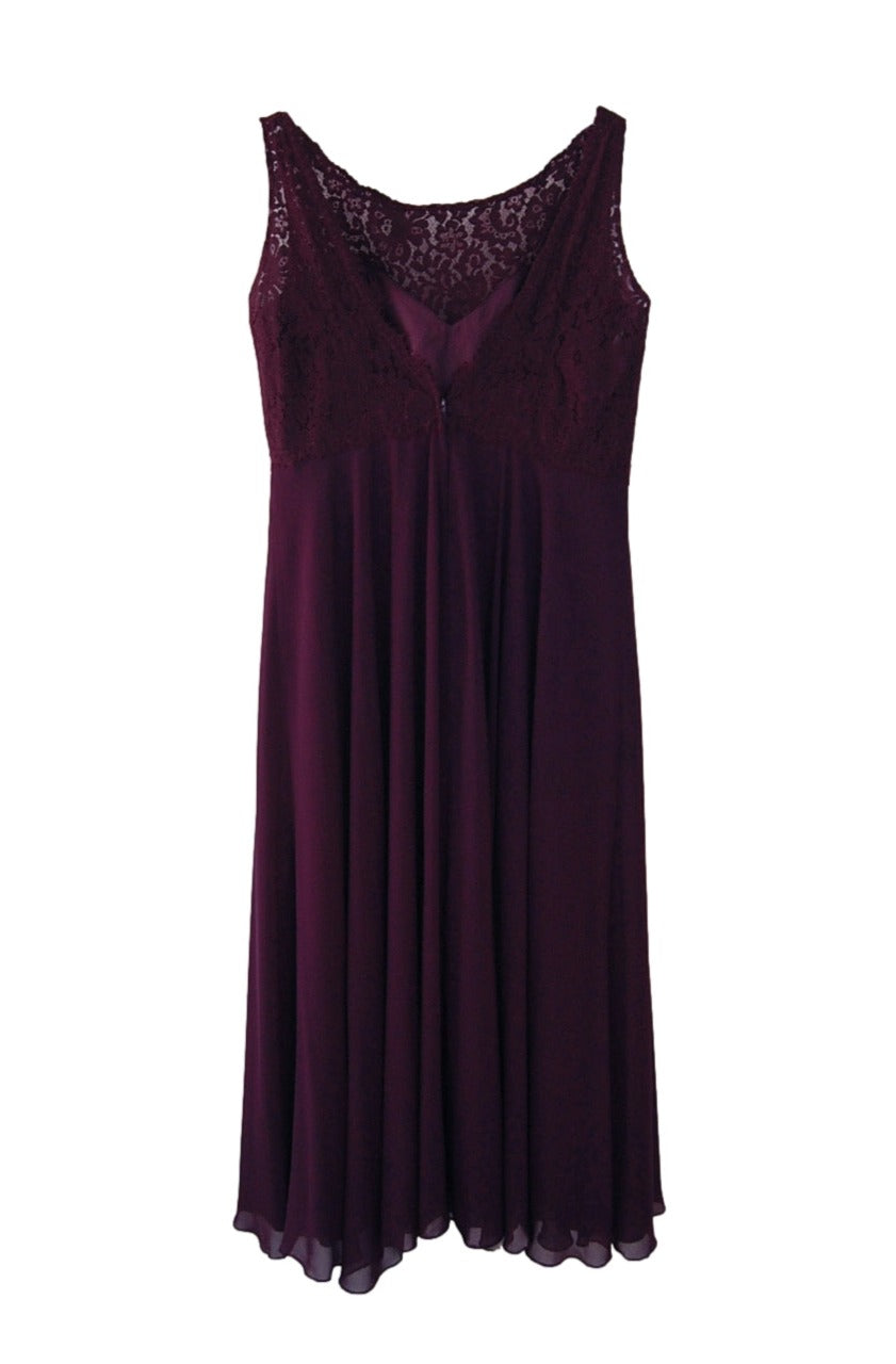 Lace boat neck illusion bodice with built-in bust padding, 1.25" wide straps, natural waist, chiffon a-line skirt