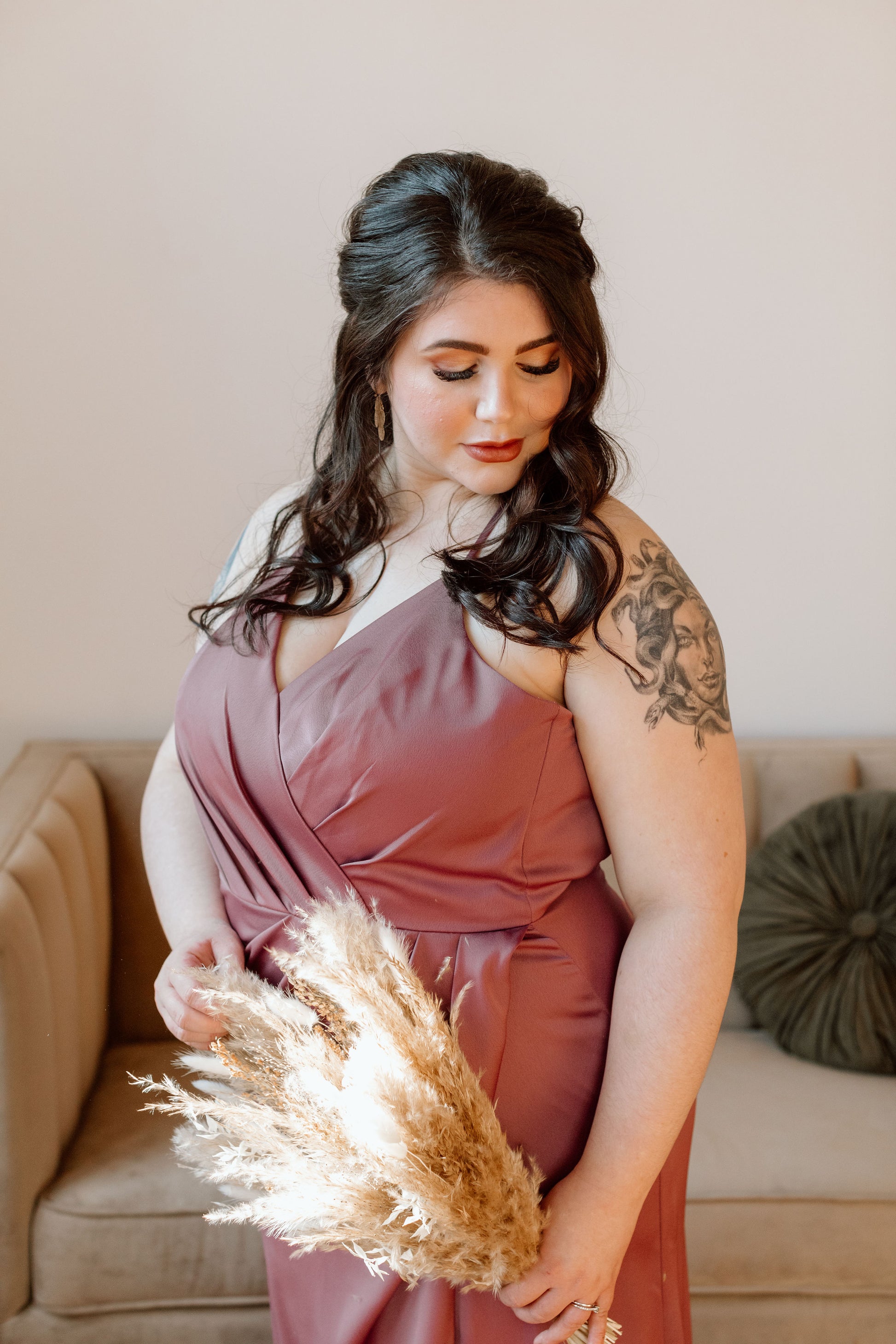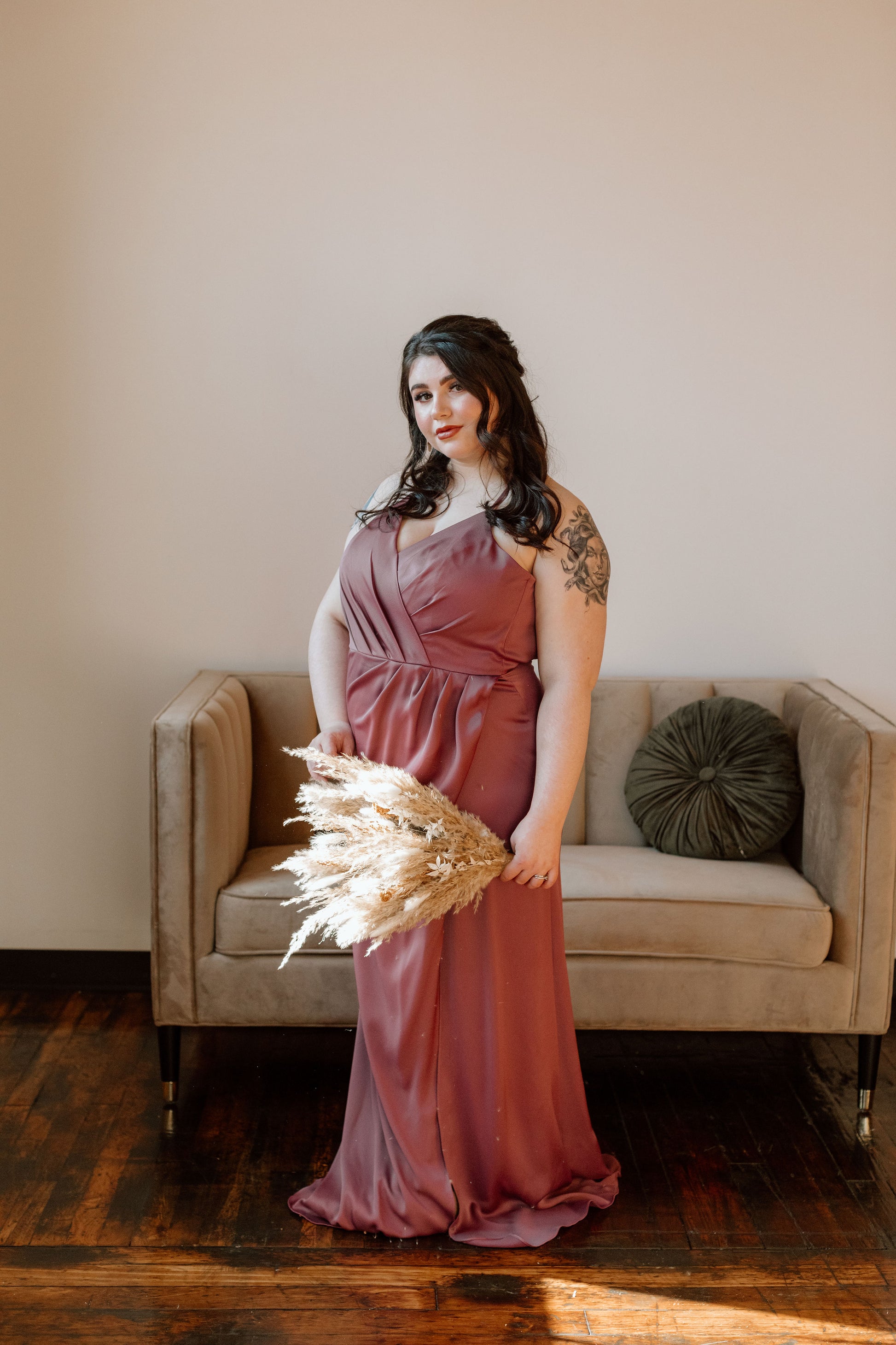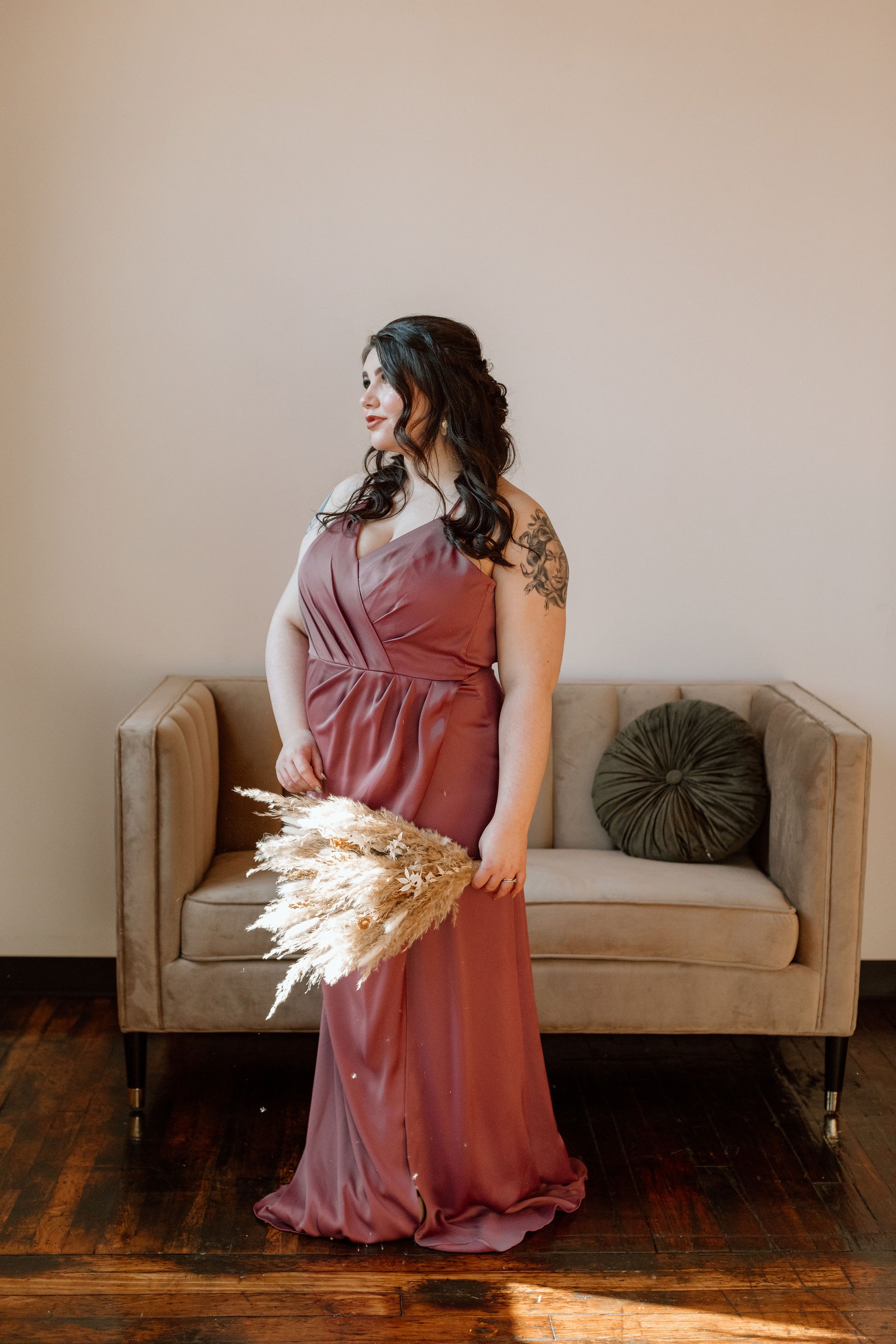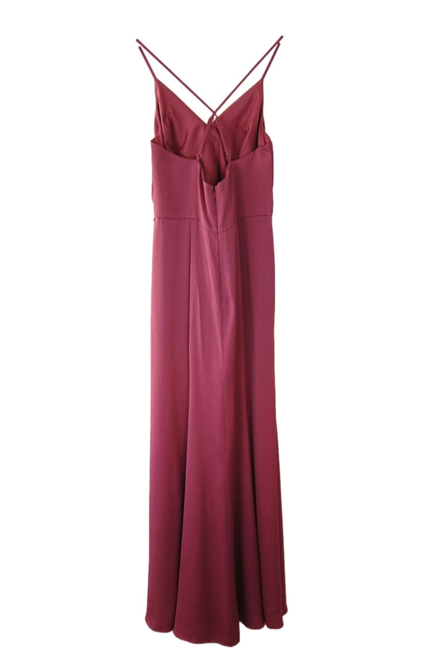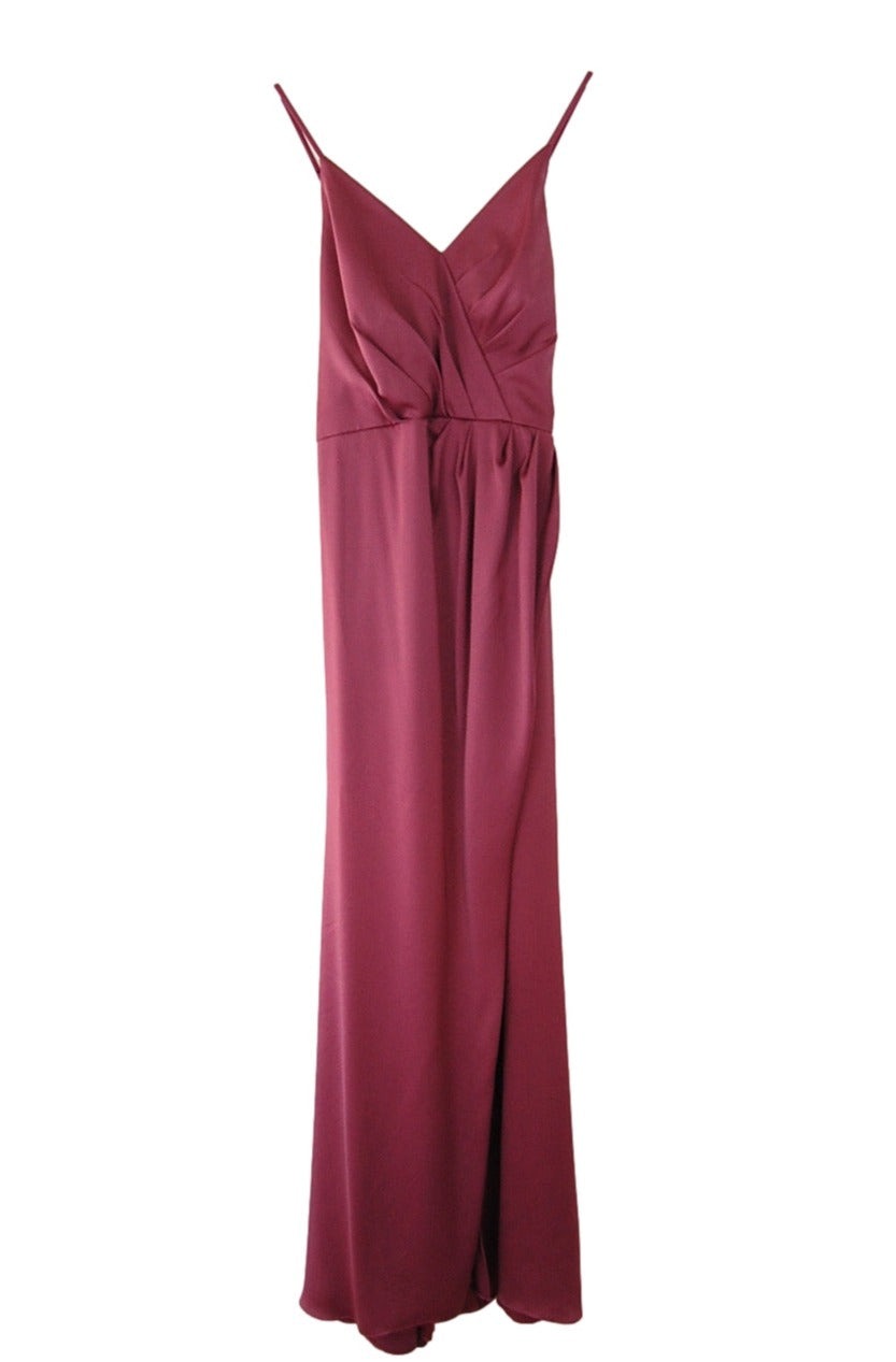 Satin v-neck, faux wrap draped bodice, adjustable spaghetti straps, draping at waist, faux wrap a-line skirt with slit at left leg