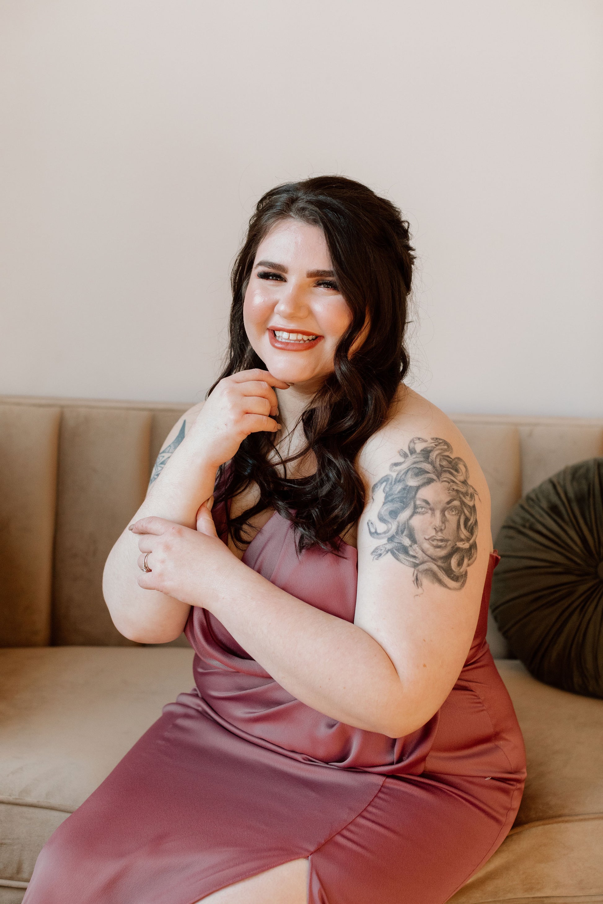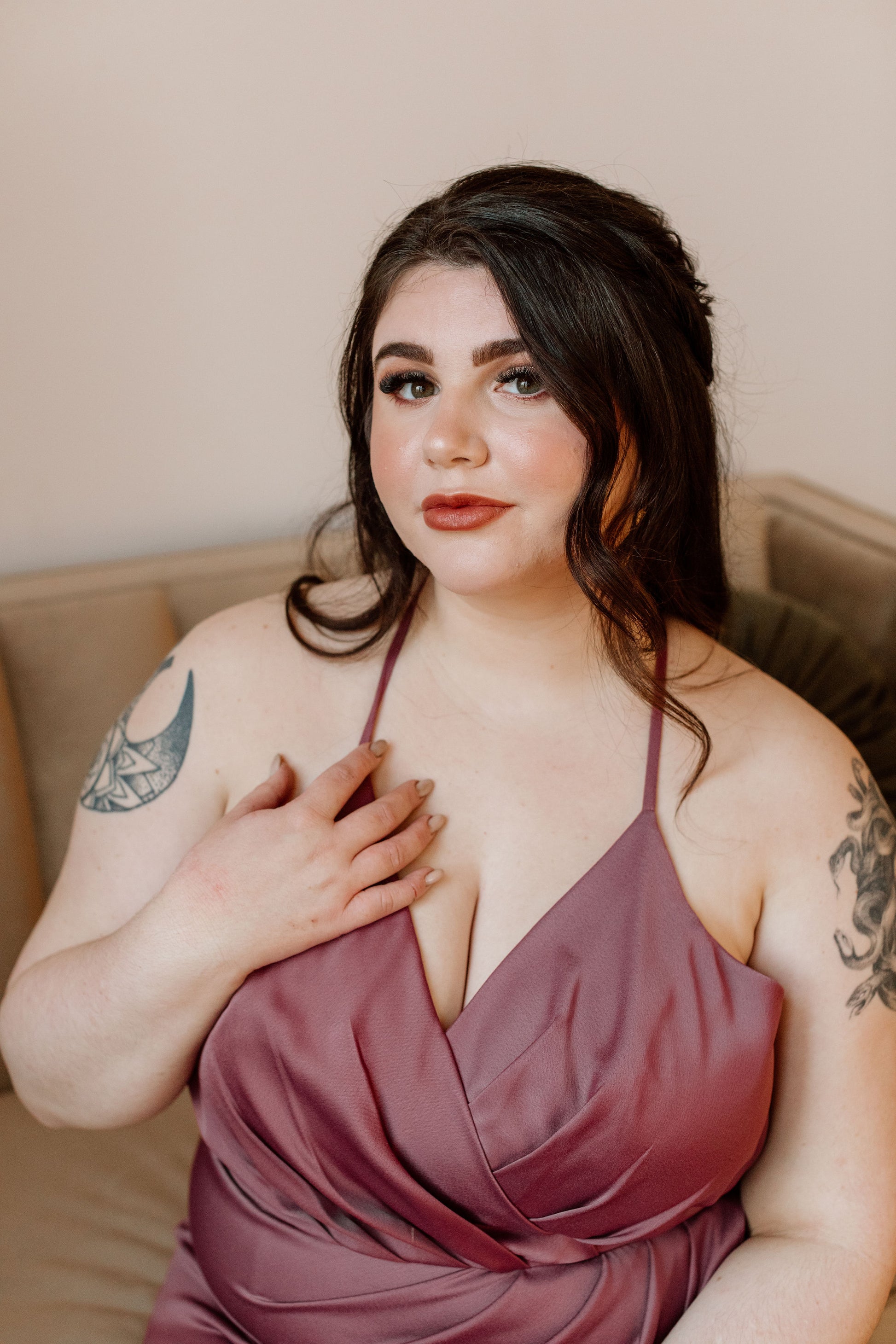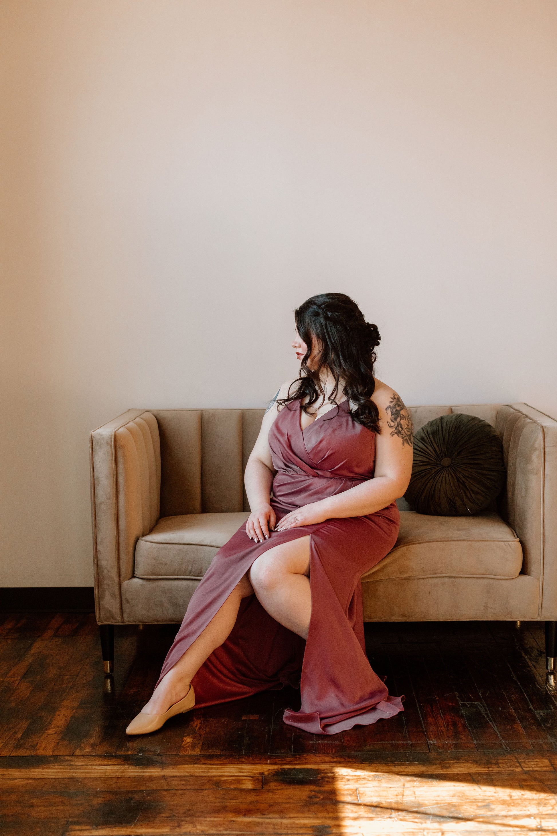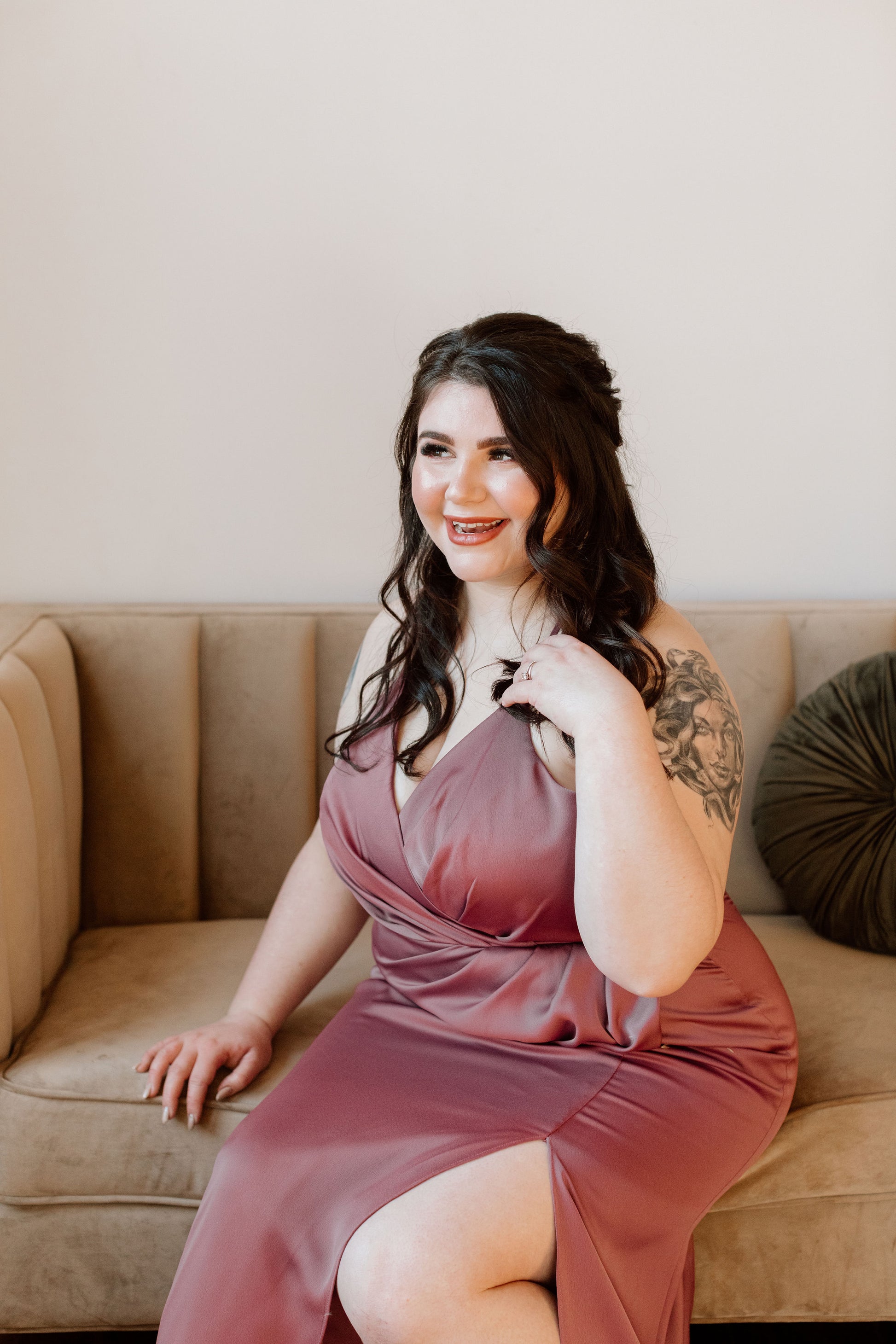 Satin v-neck, faux wrap draped bodice, adjustable spaghetti straps, draping at waist, faux wrap a-line skirt with slit at left leg