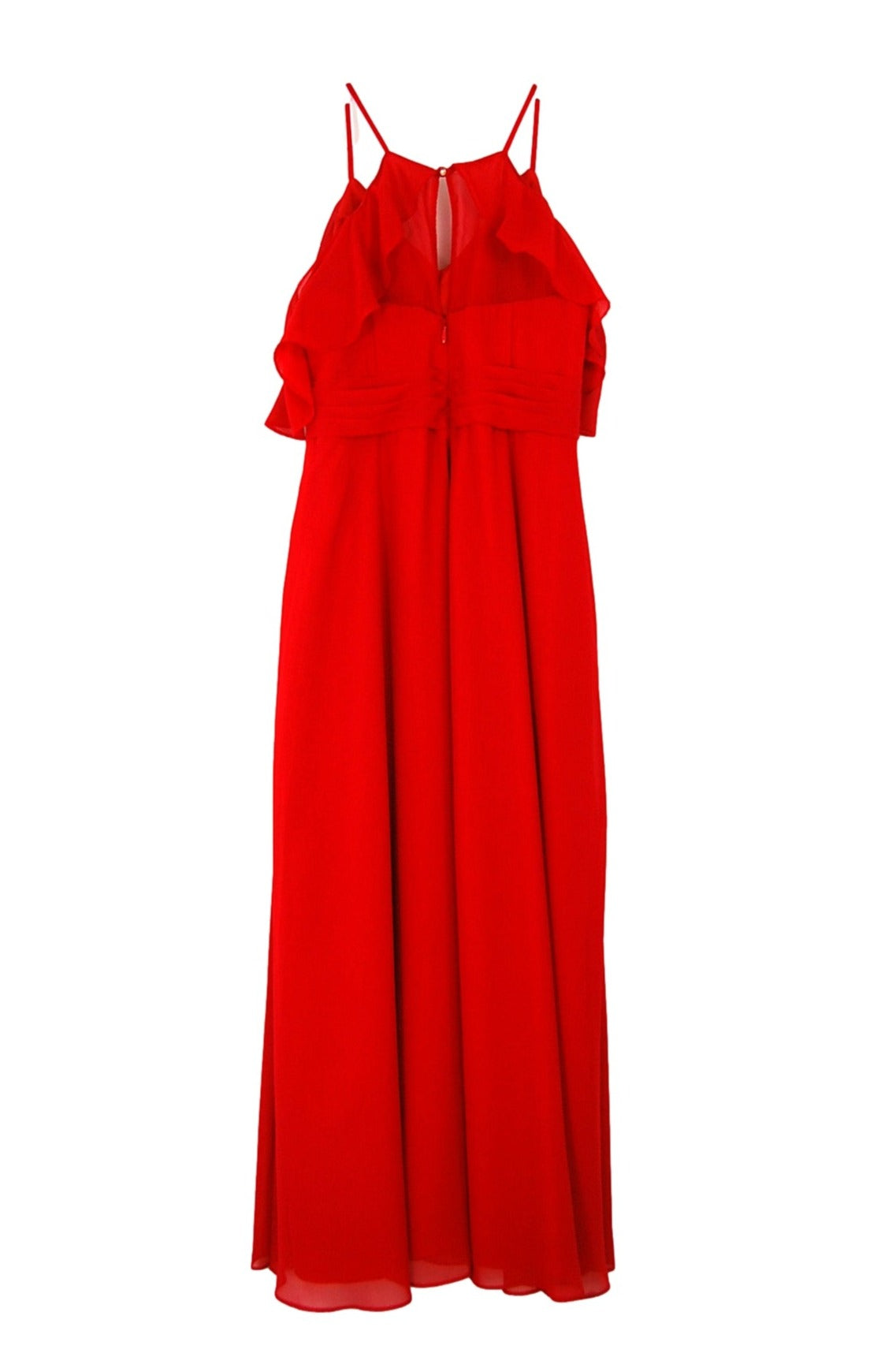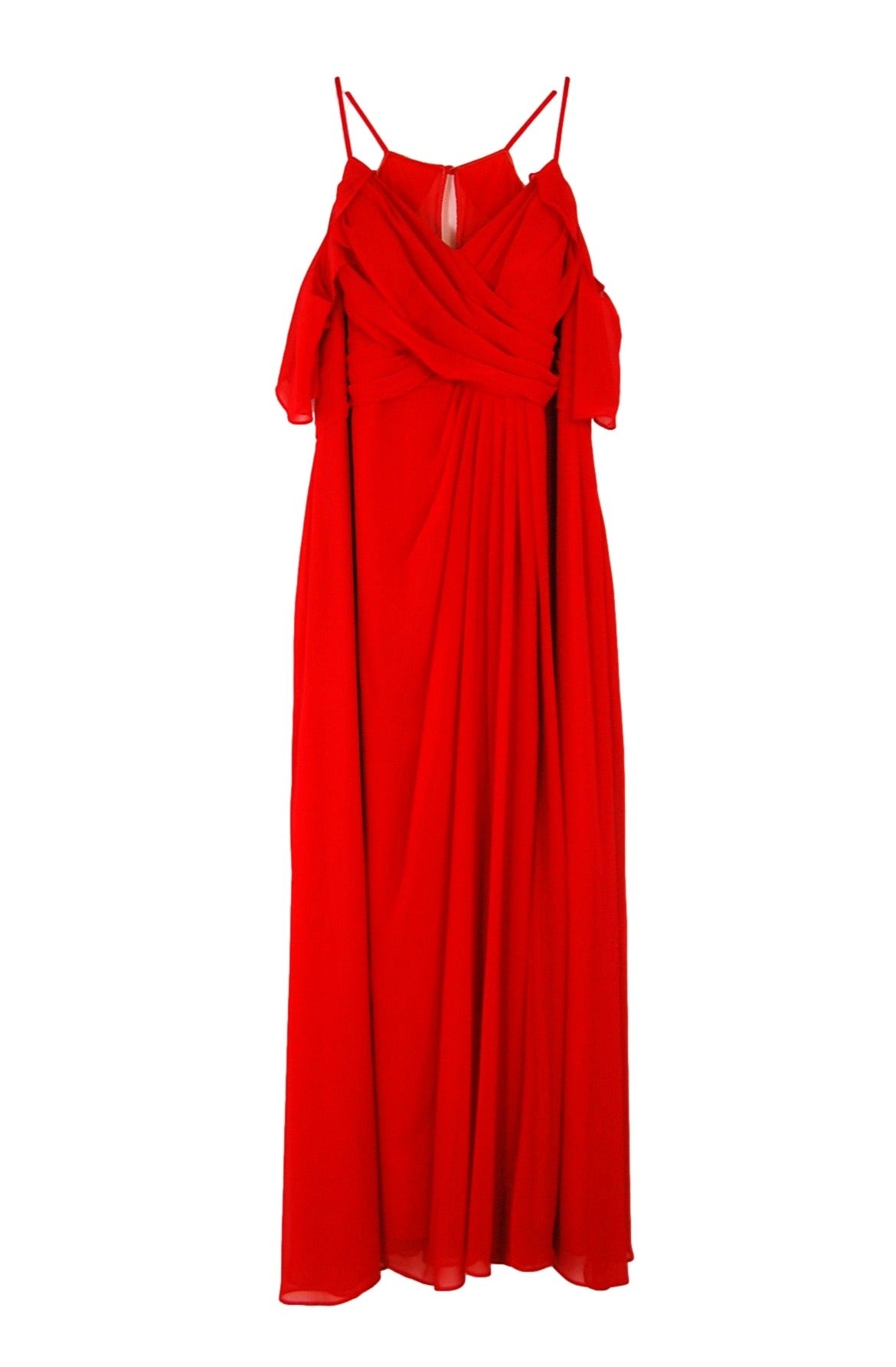 Chiffon draped v-neck bodice with boning and built-in bust padding, spaghetti straps with cold shoulder ruffles, center back w/ keyhole and crystal button, A-line skirt with pleats at left side of waist, slit at left leg.