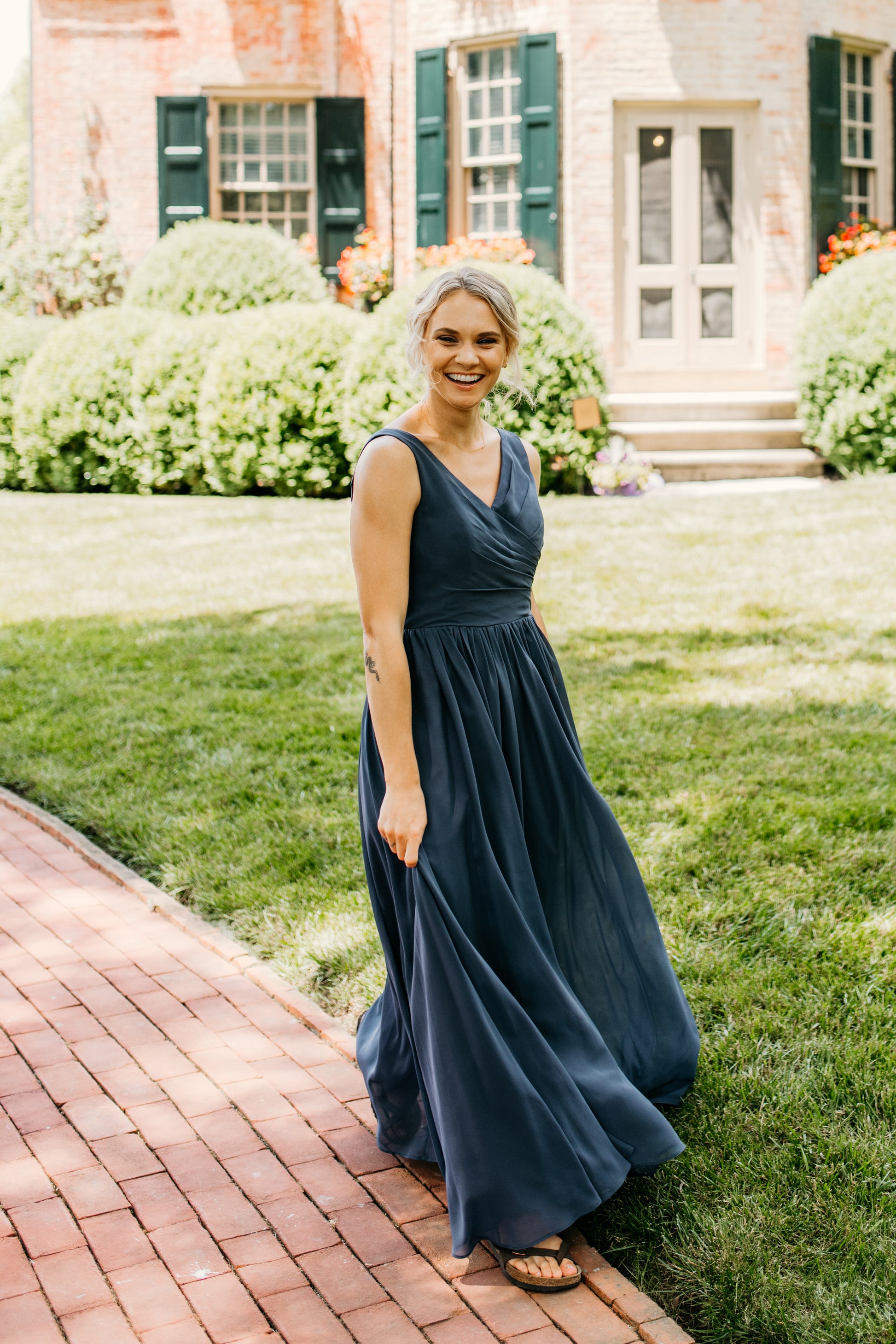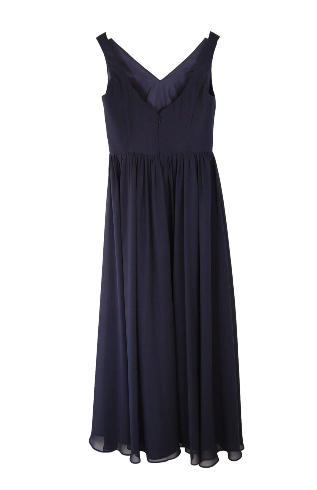 Chiffon v-neck faux wrap draped bodice with padded cups, v-back, gathered A line skirt