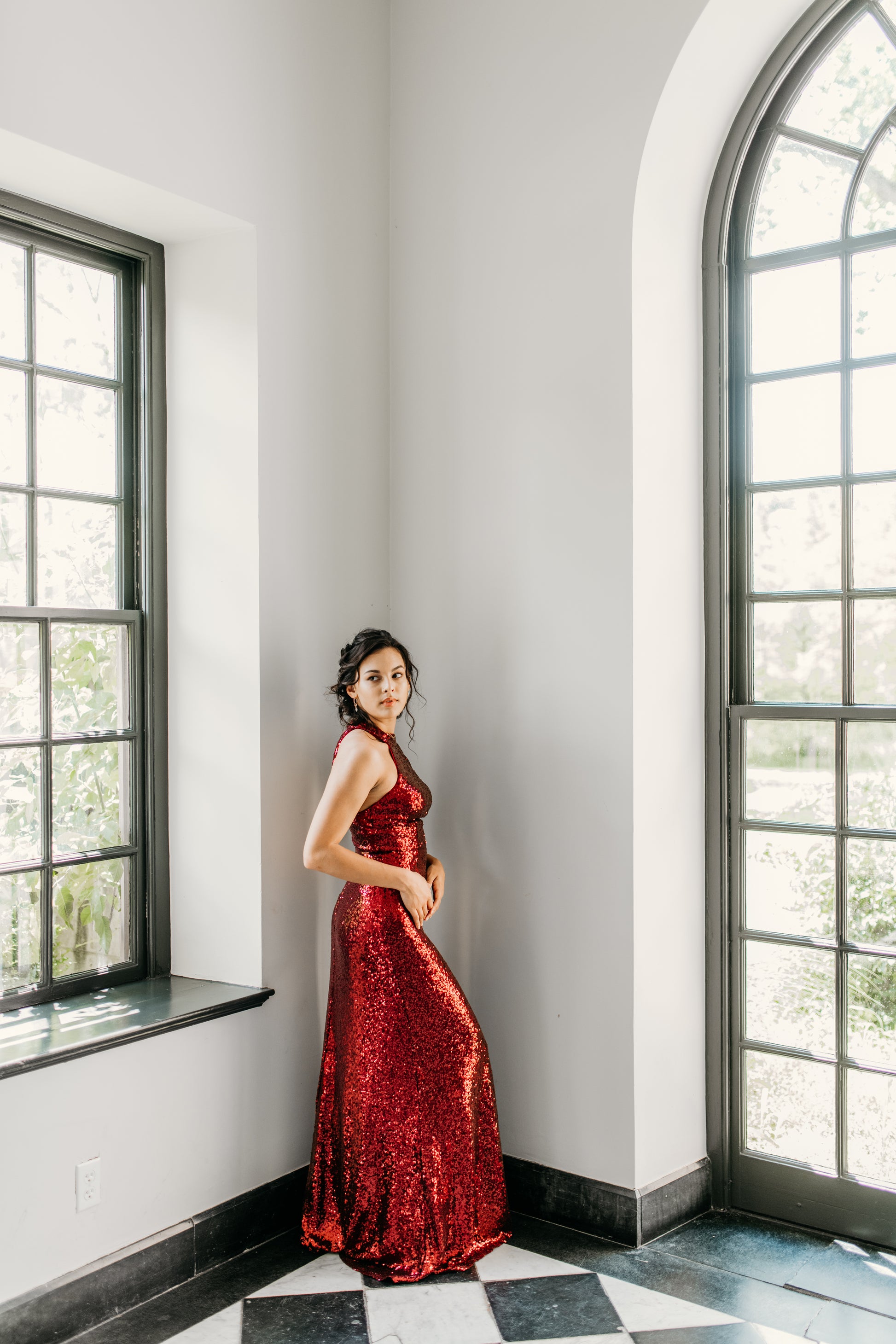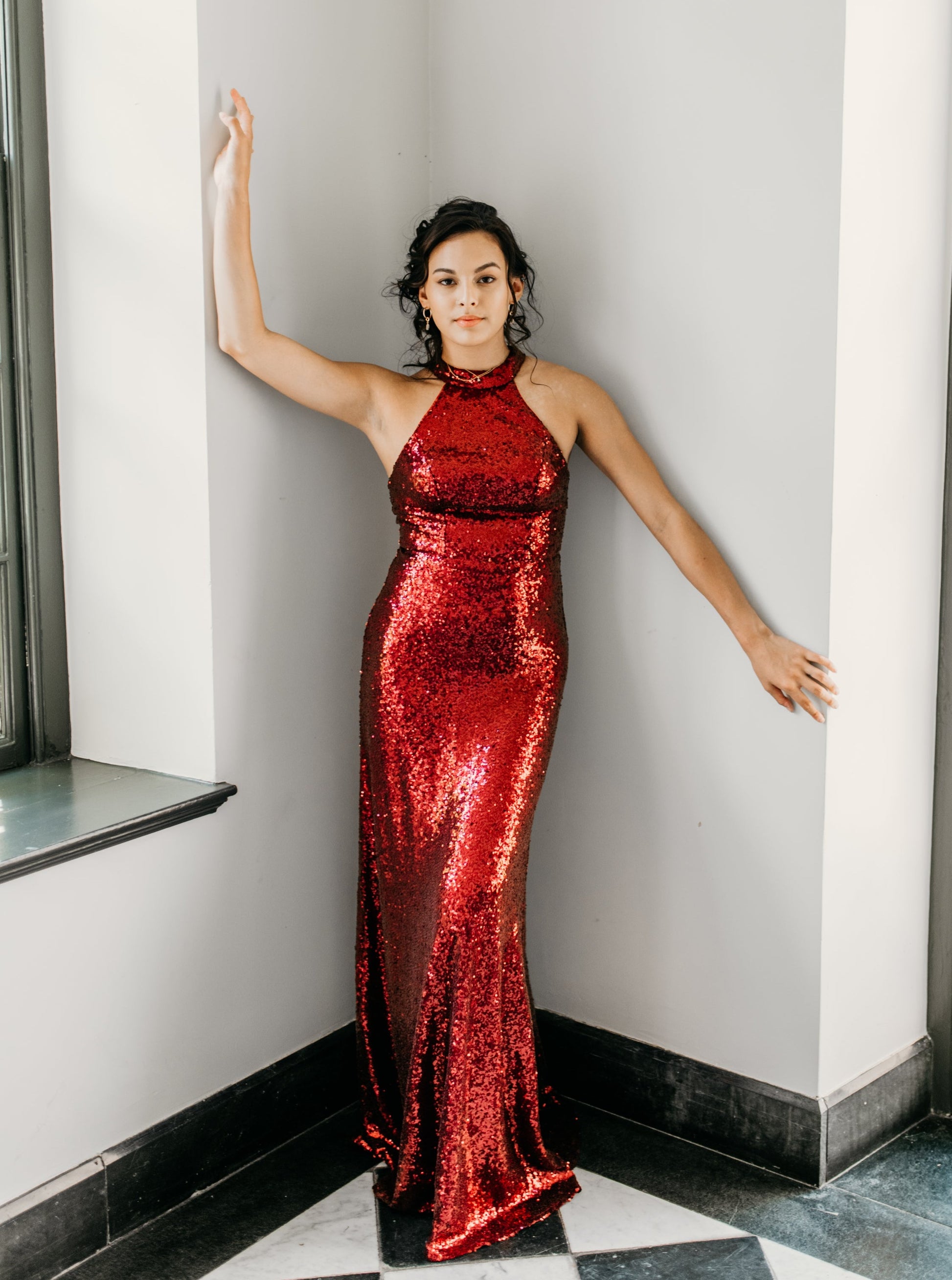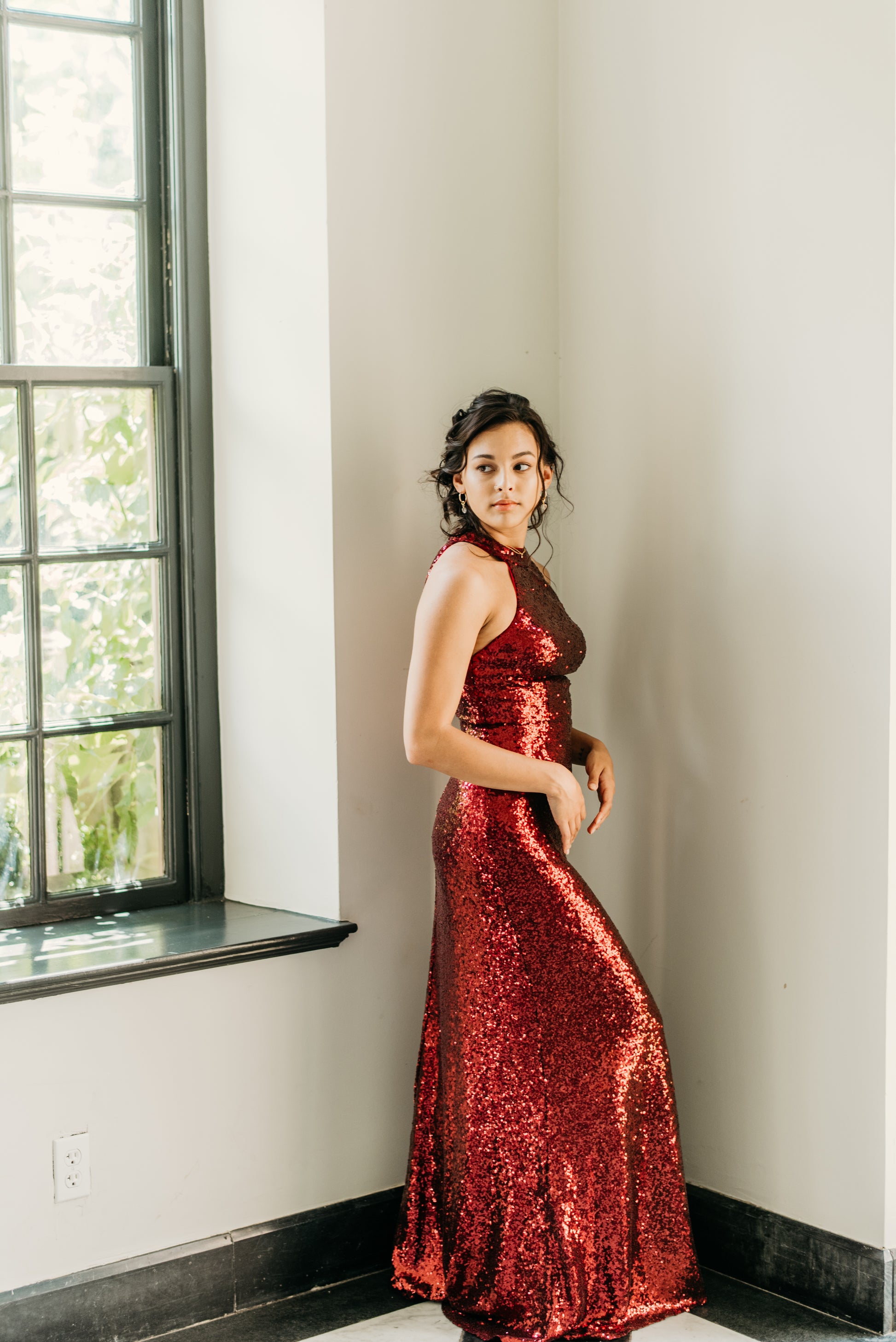 Shimmering red sequin high halter neckline with hook and eye closure at back neck, princess seam bodice with built-in bust padding, open back, A-line skirt