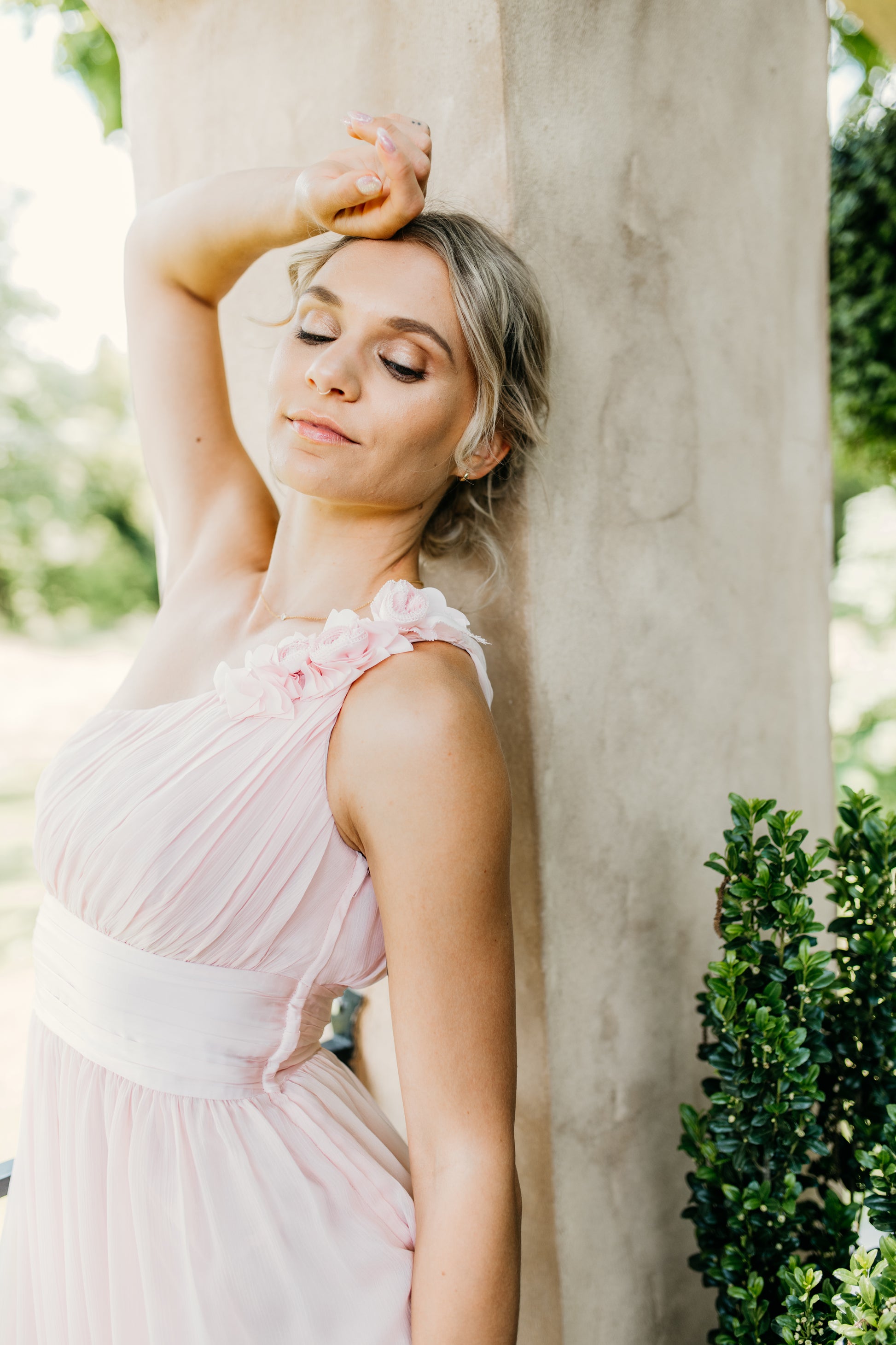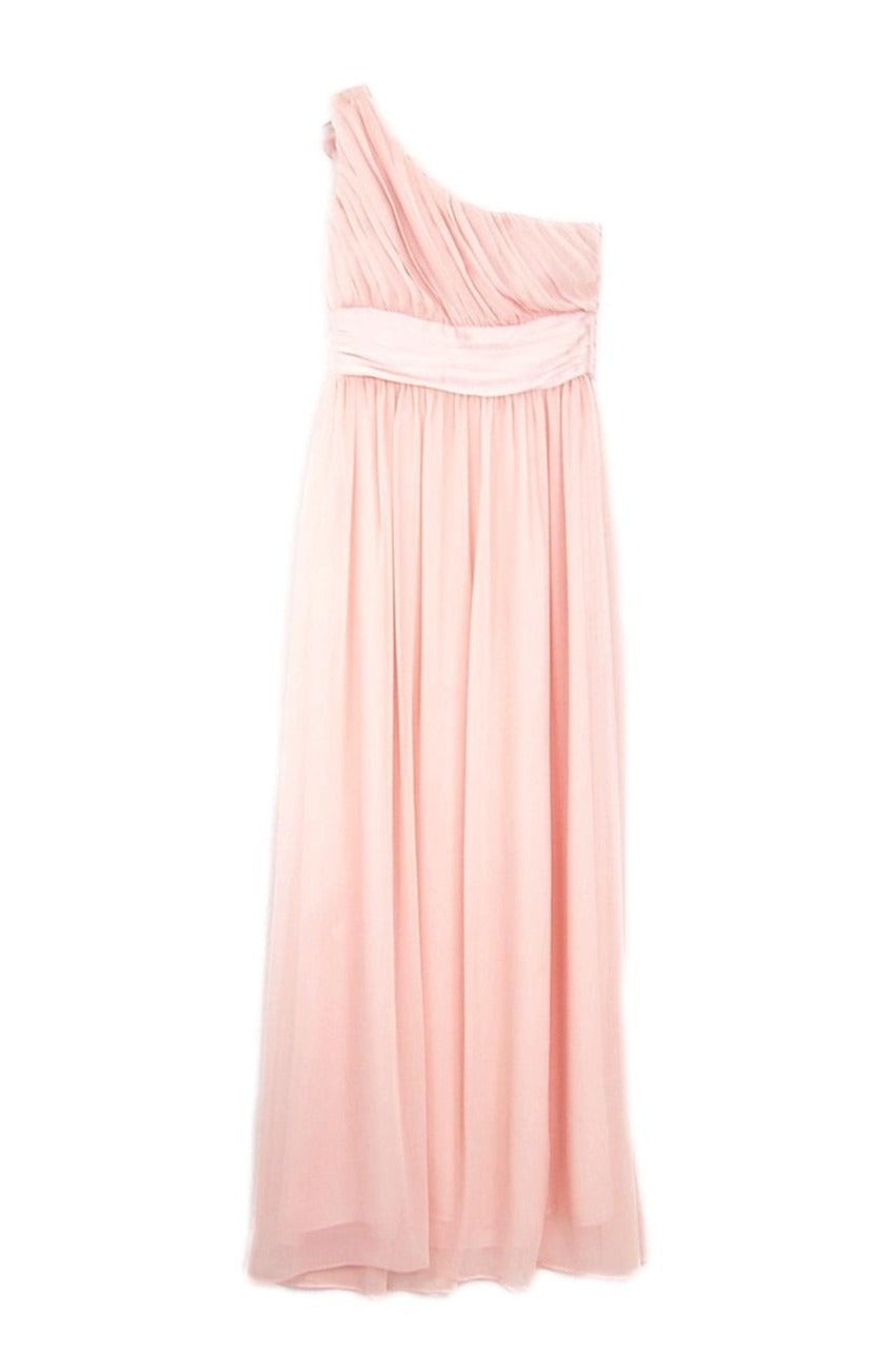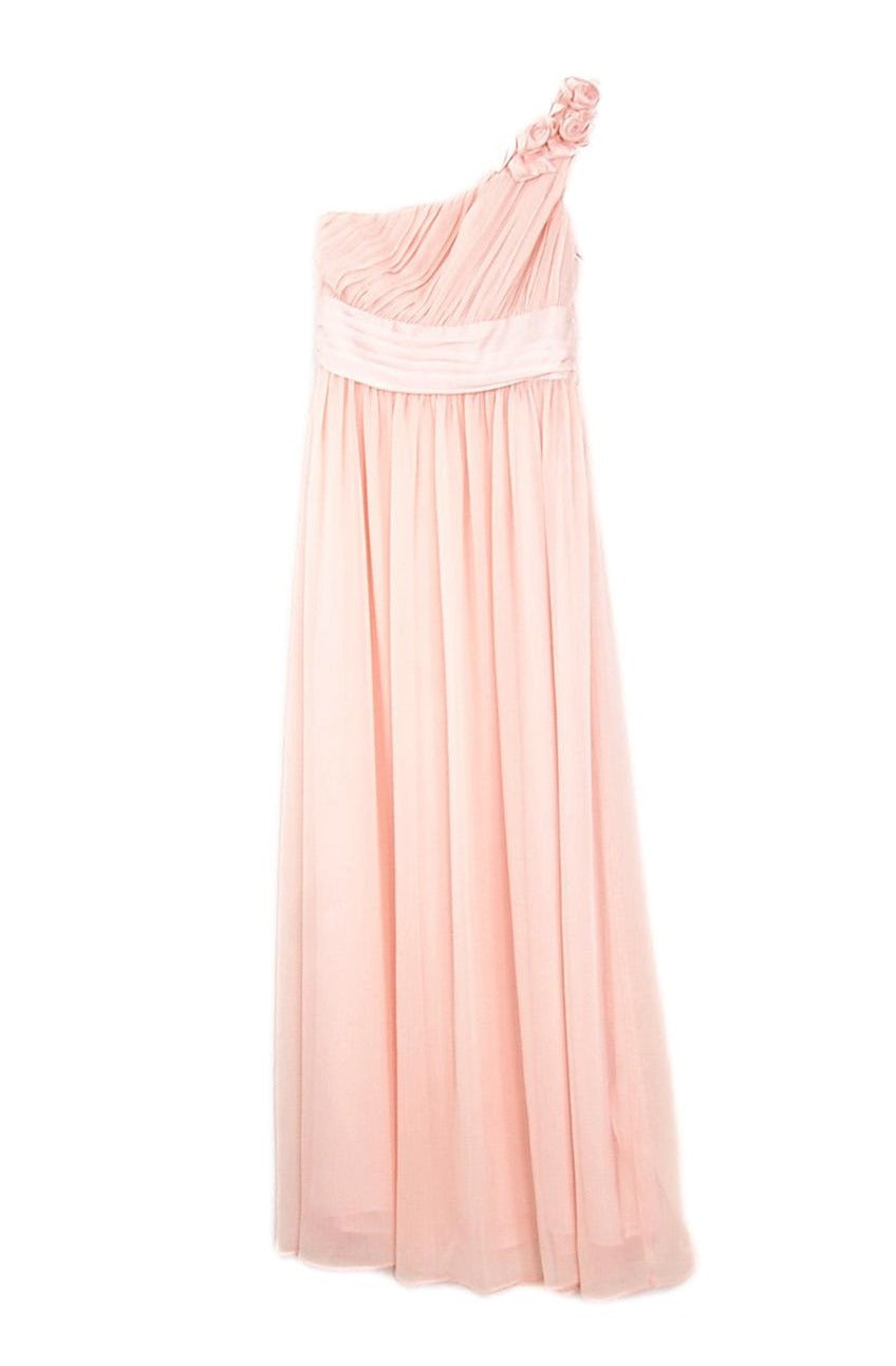 Chiffon one shoulder (left) asymmetric neckline, five floral embellishments at shoulder, gathered empire bodice with light bust padding, 4" pleated satin waistband, gathered a-line skirt.