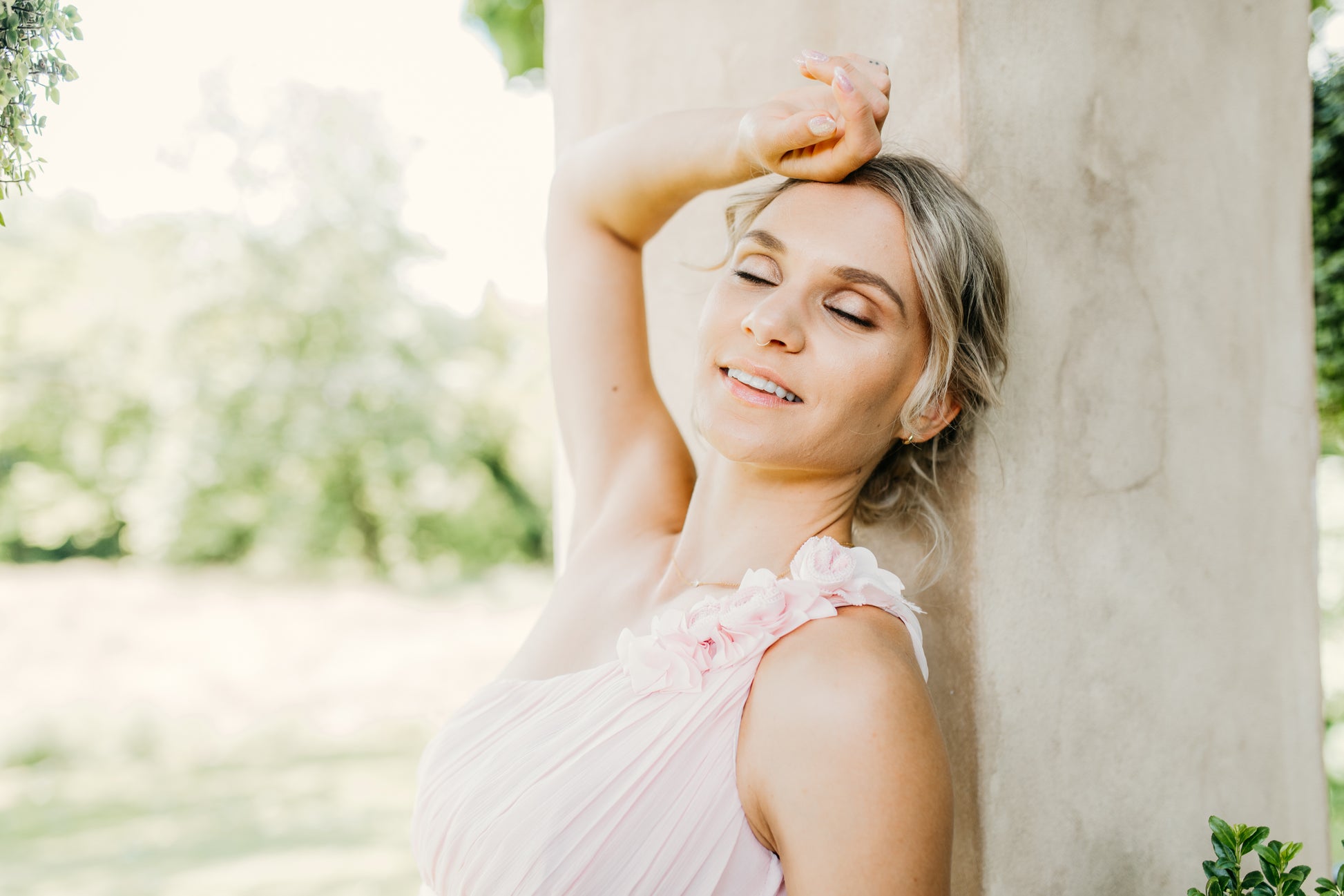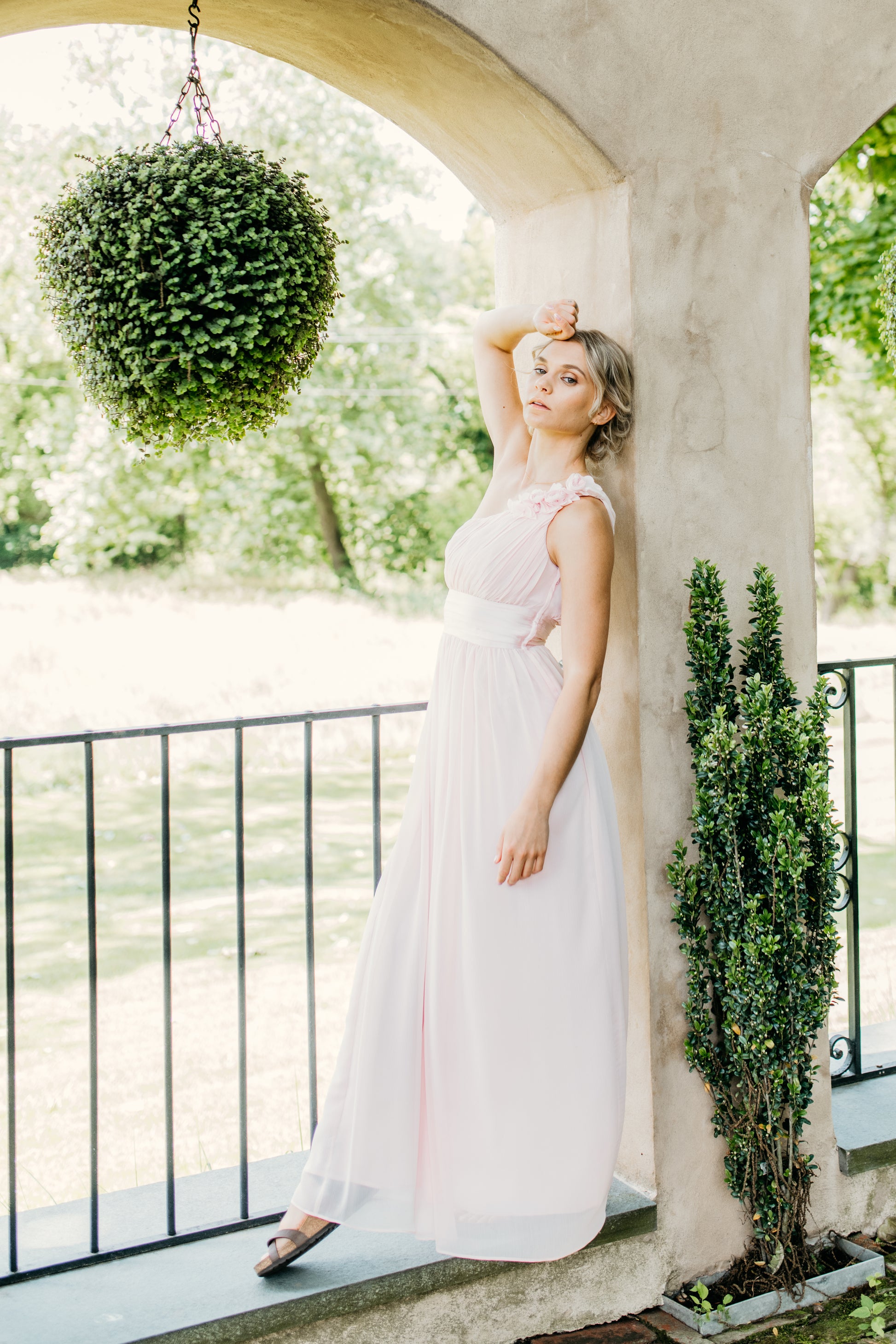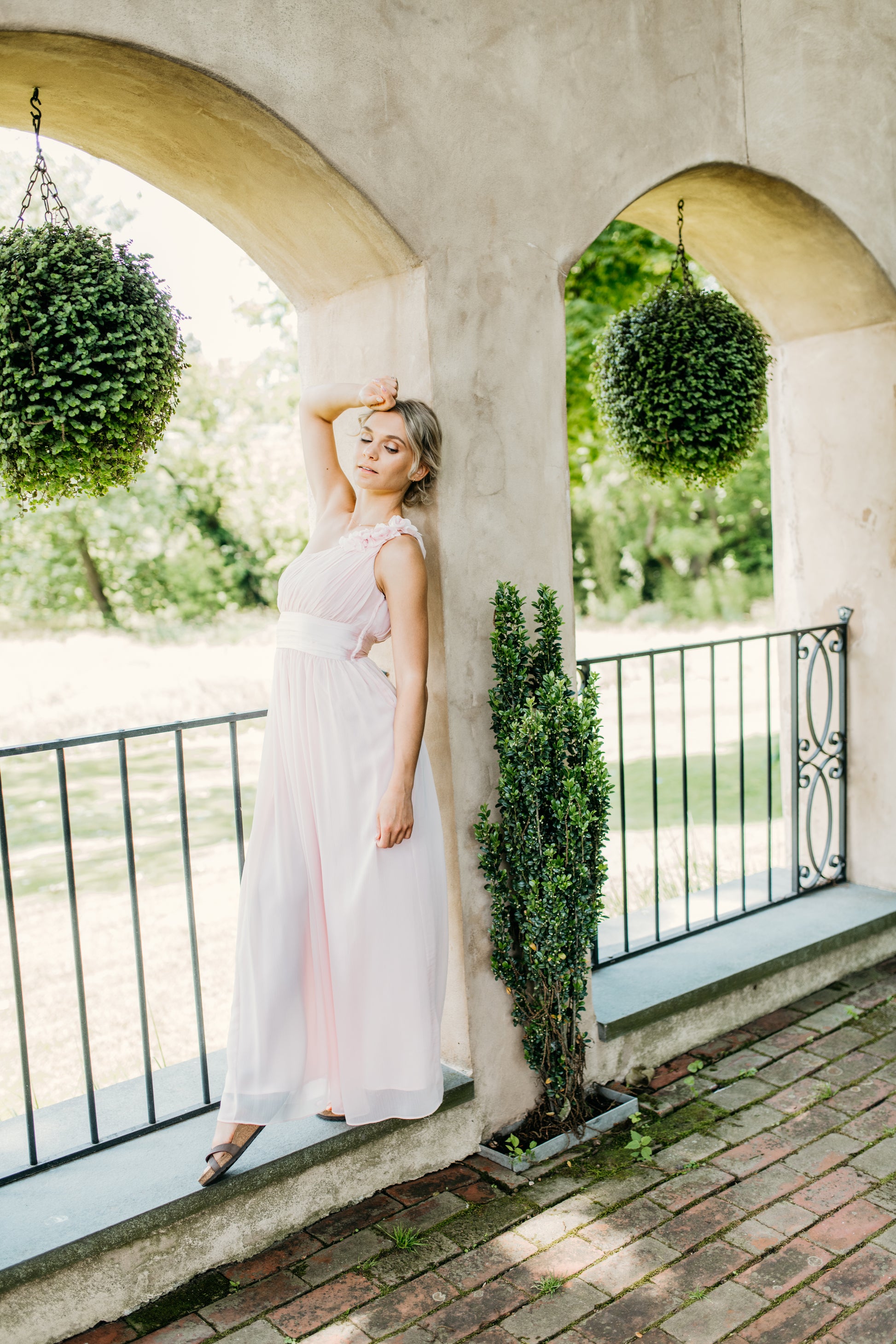 Chiffon one shoulder (left) asymmetric neckline, five floral embellishments at shoulder, gathered empire bodice with light bust padding, 4" pleated satin waistband, gathered a-line skirt.