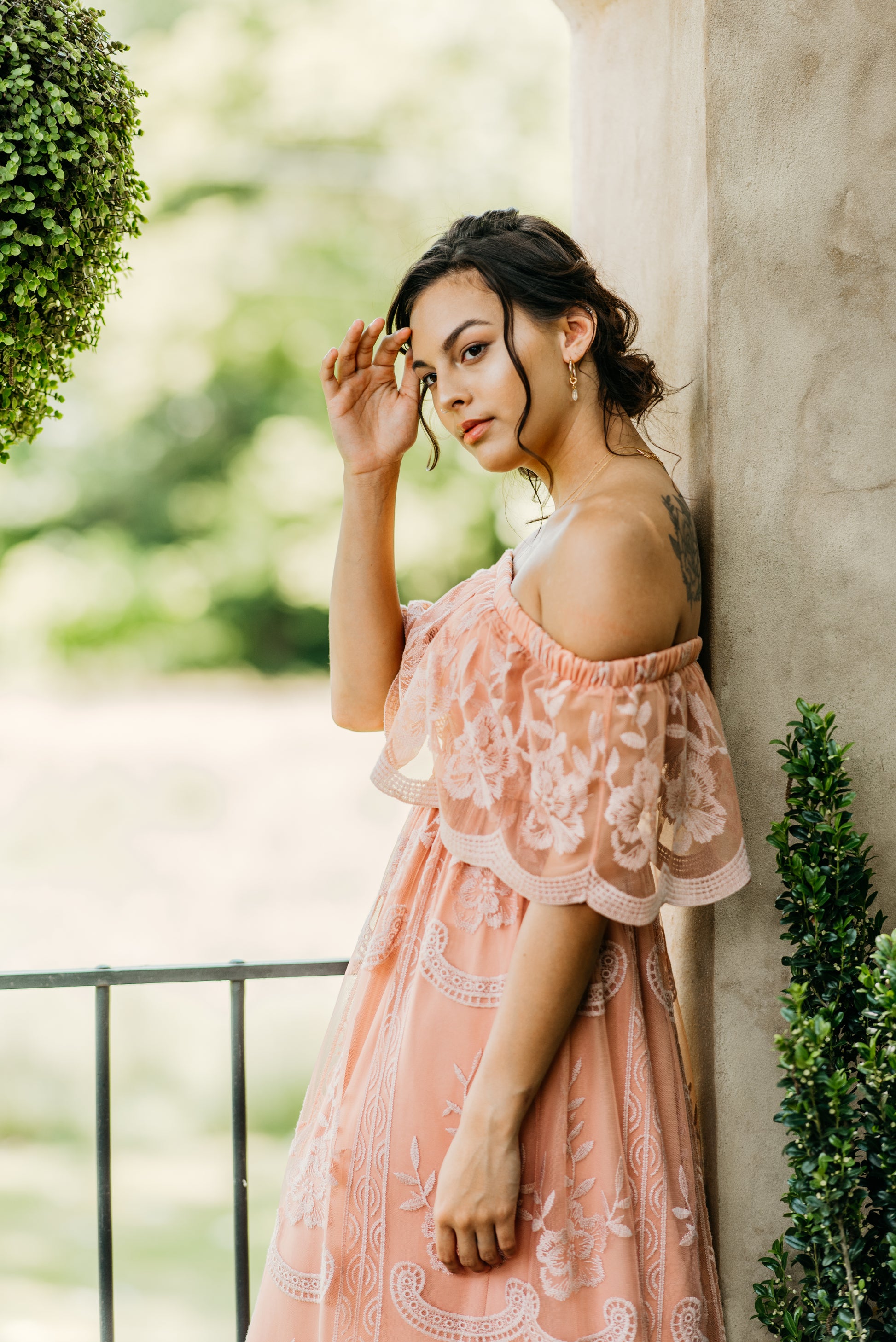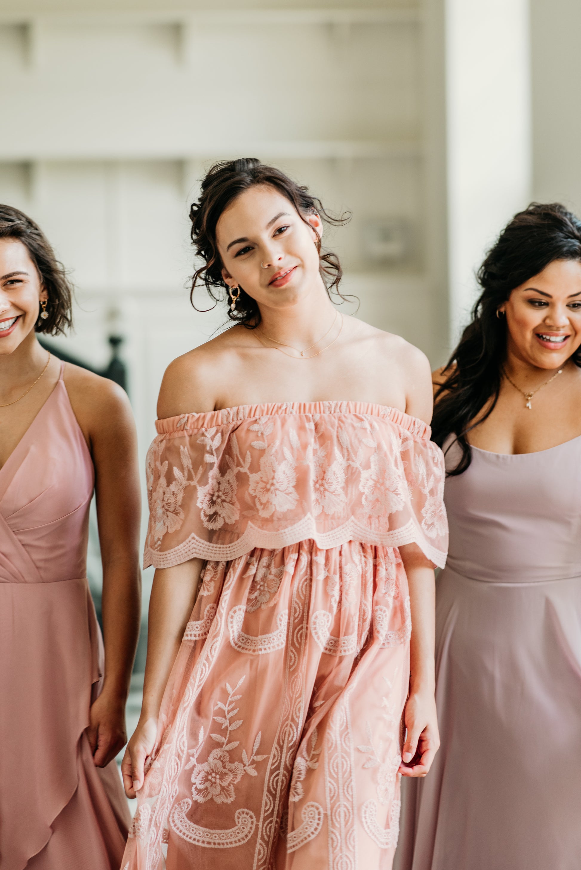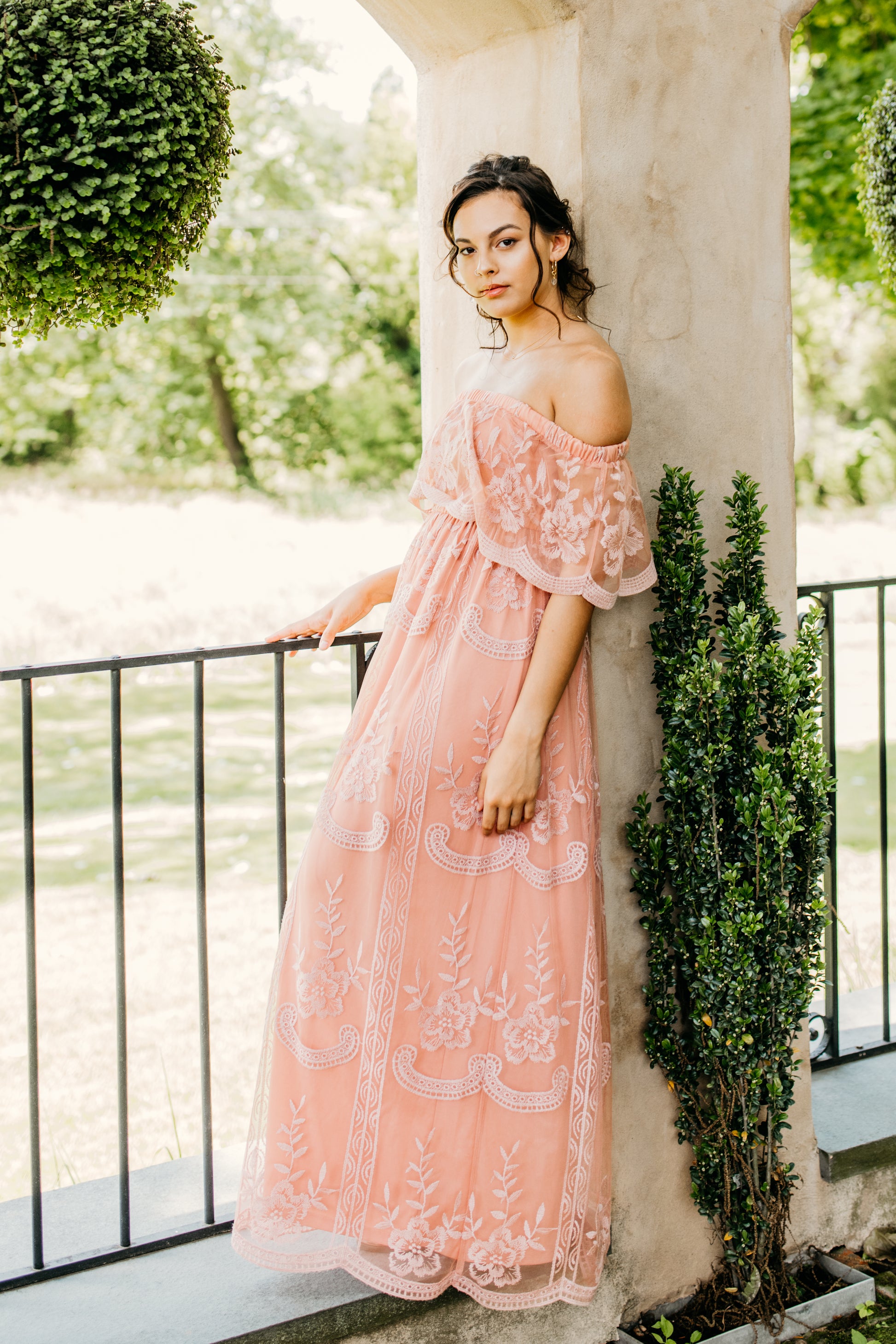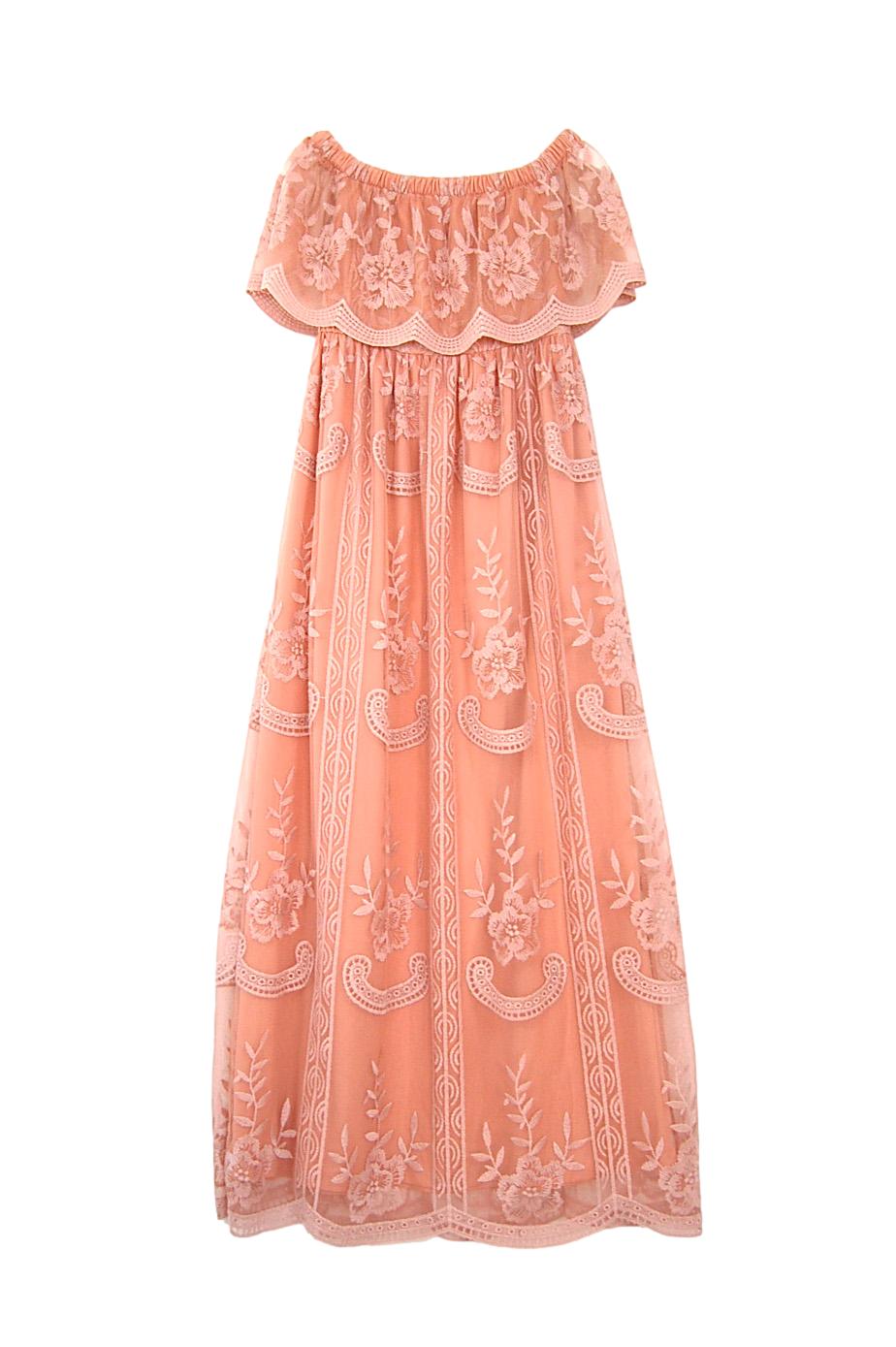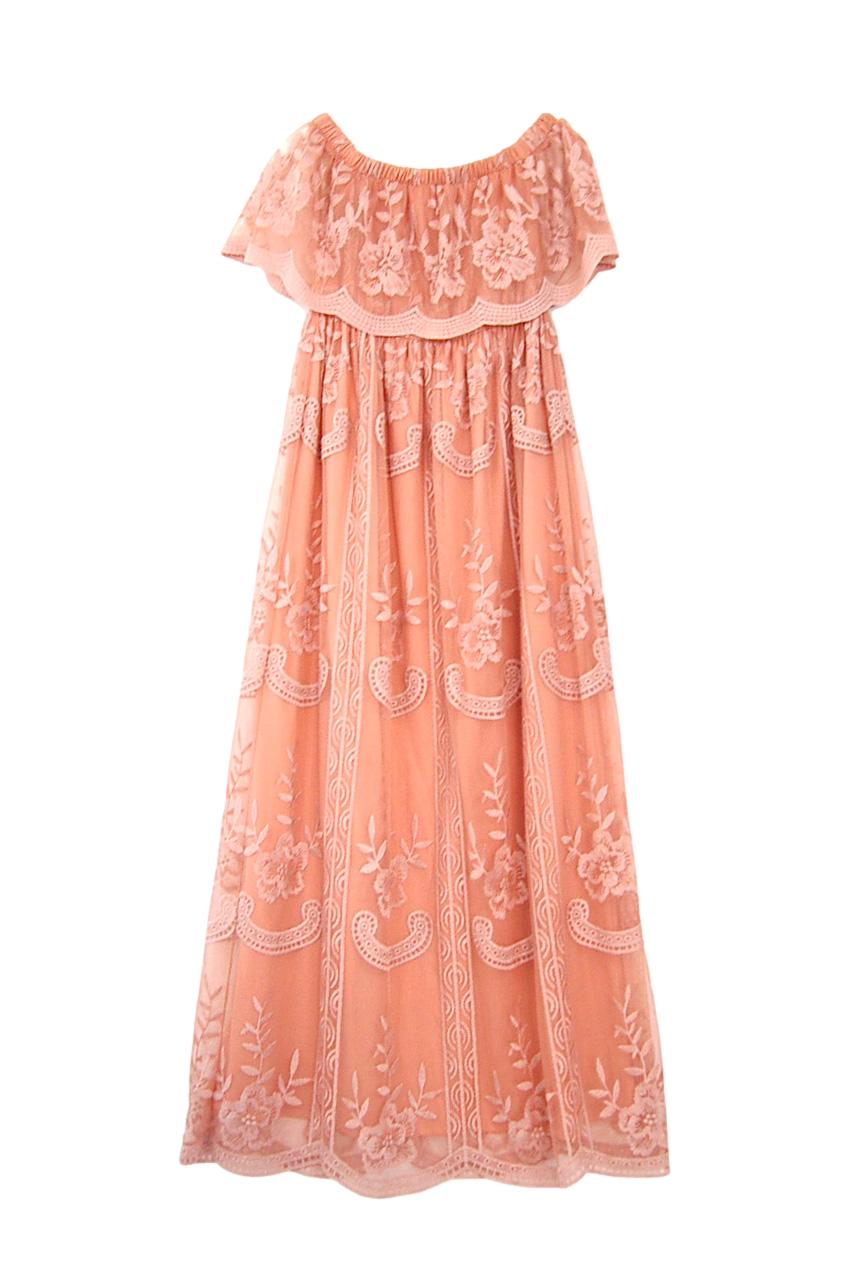 kEmbroidered mesh strapless, off-the-shoulder neckline with 10" wide scalloped ruffle bodice/sleeves, elasticized waistband, gathered a-line skirt, scalloped hem