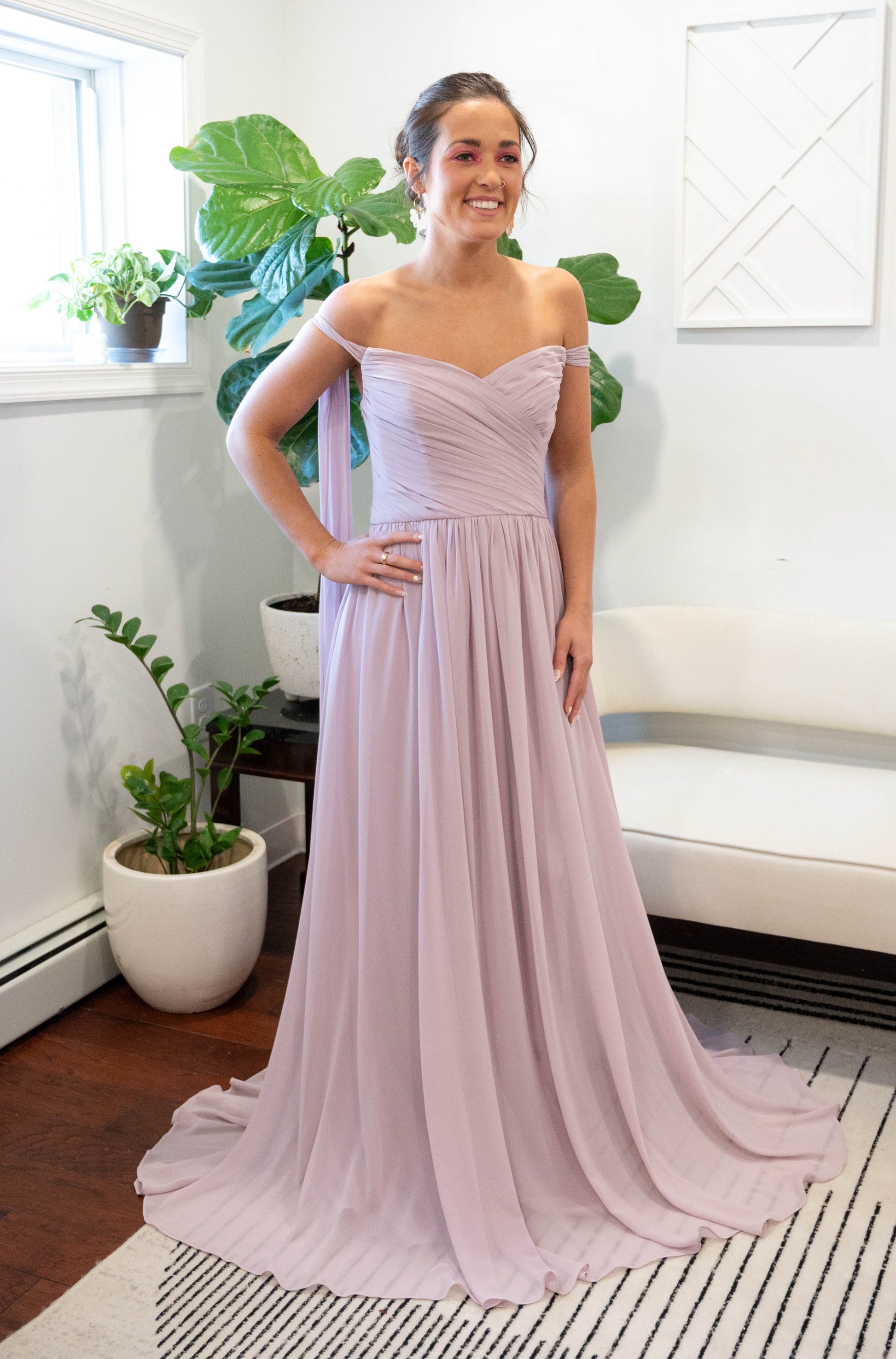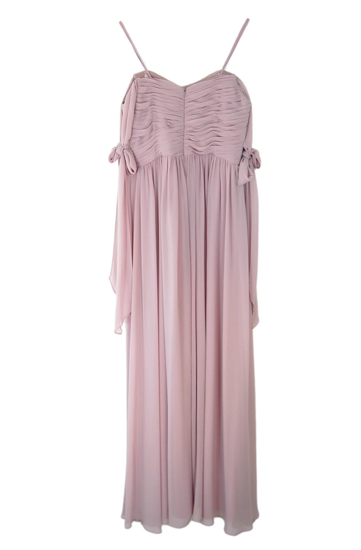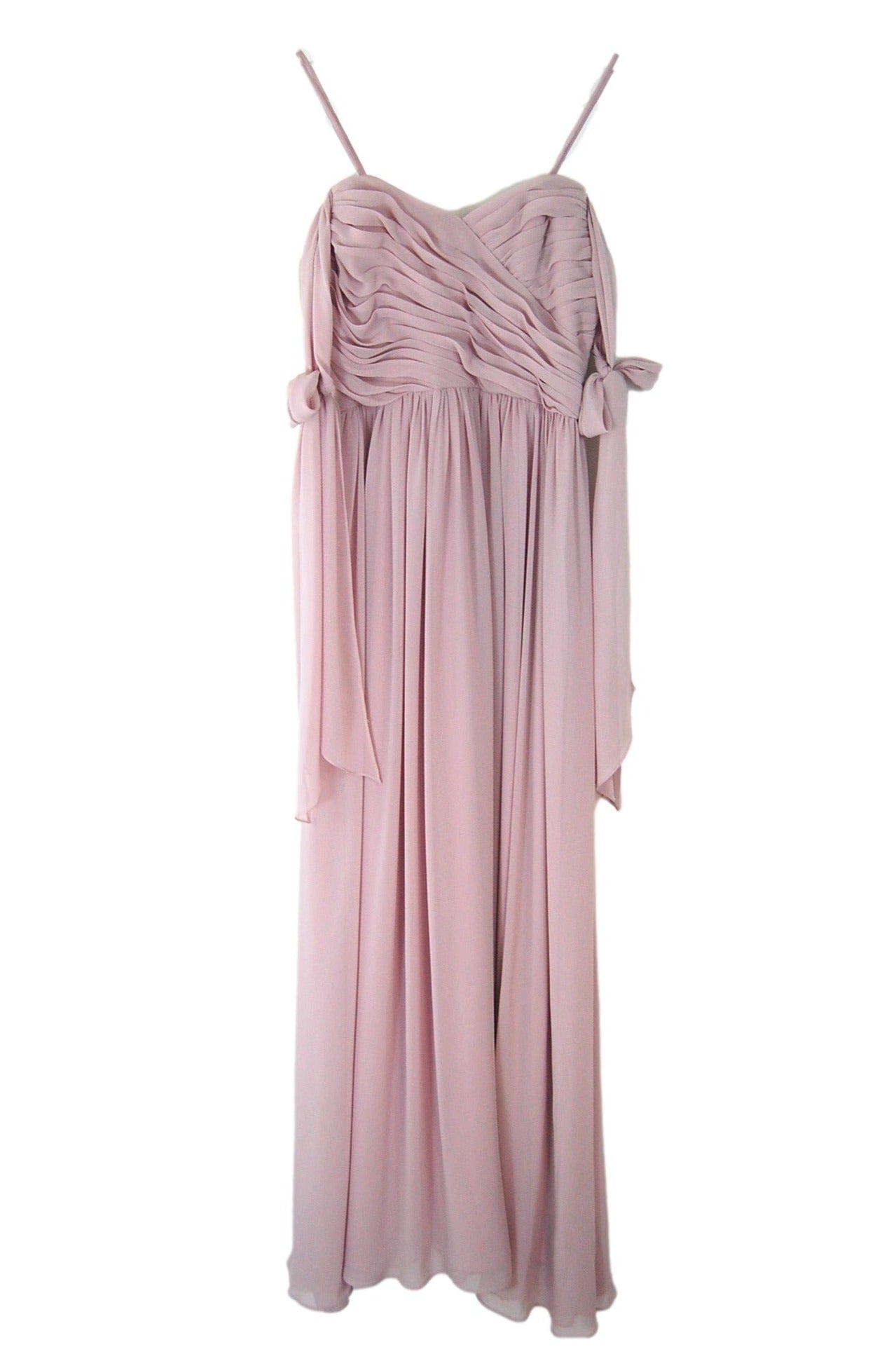 Chiffon sweetheart neckline, draped boned bodice with 7" wide shoulder streamers which can be tied in knots or bows at shoulders. Gathered A-line skirt.