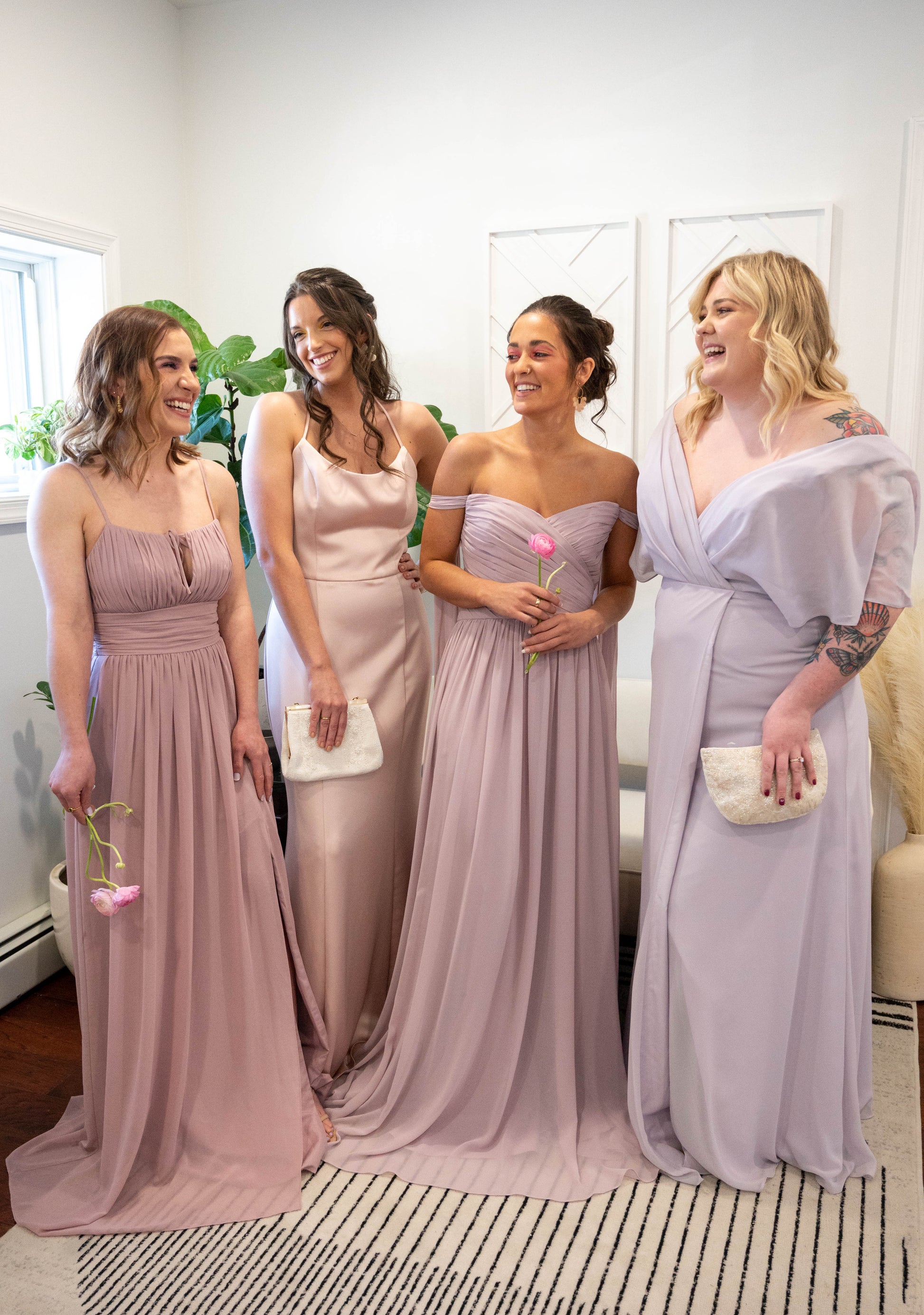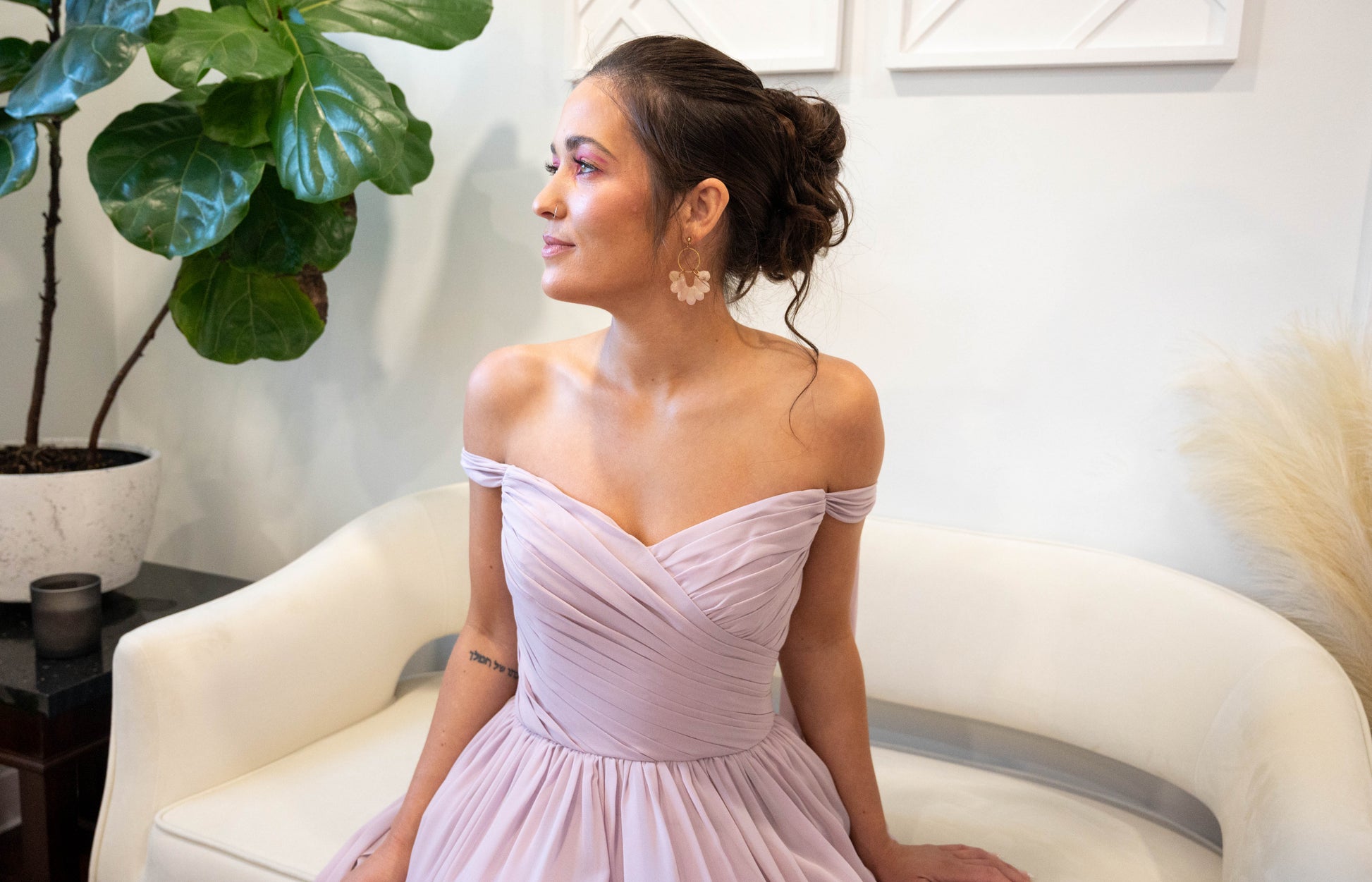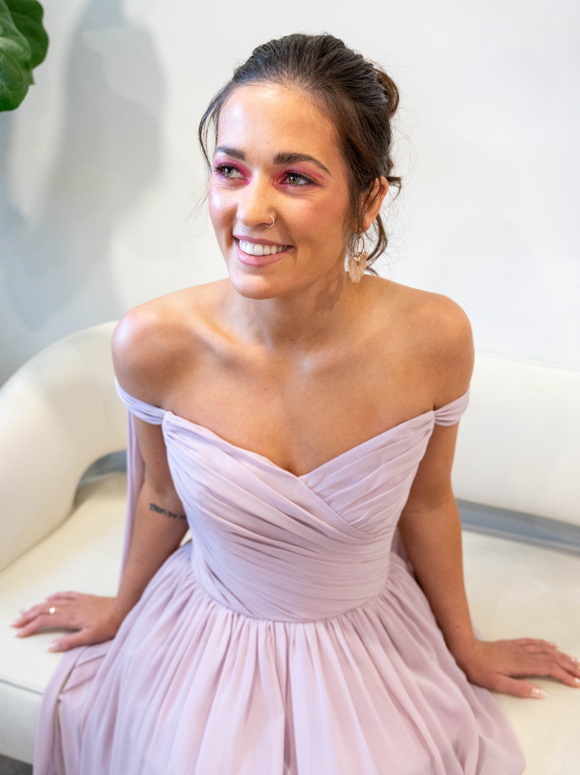 Chiffon sweetheart neckline, draped boned bodice with 7" wide shoulder streamers which can be tied in knots or bows at shoulders. Gathered A-line skirt.