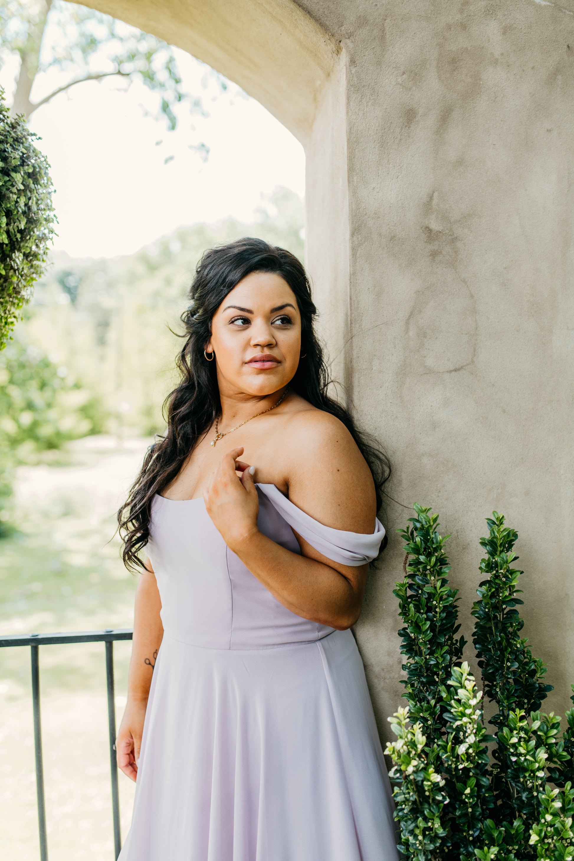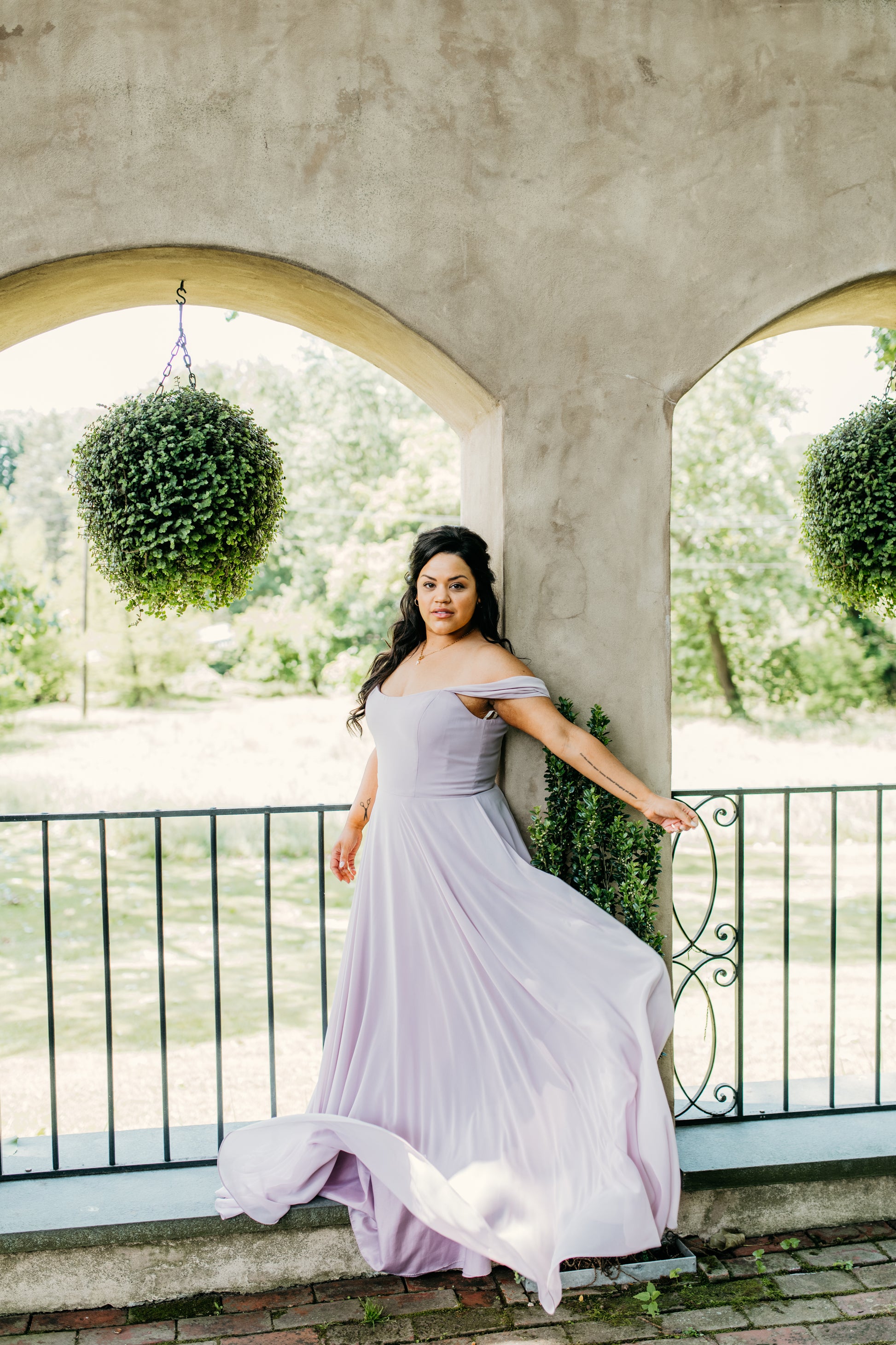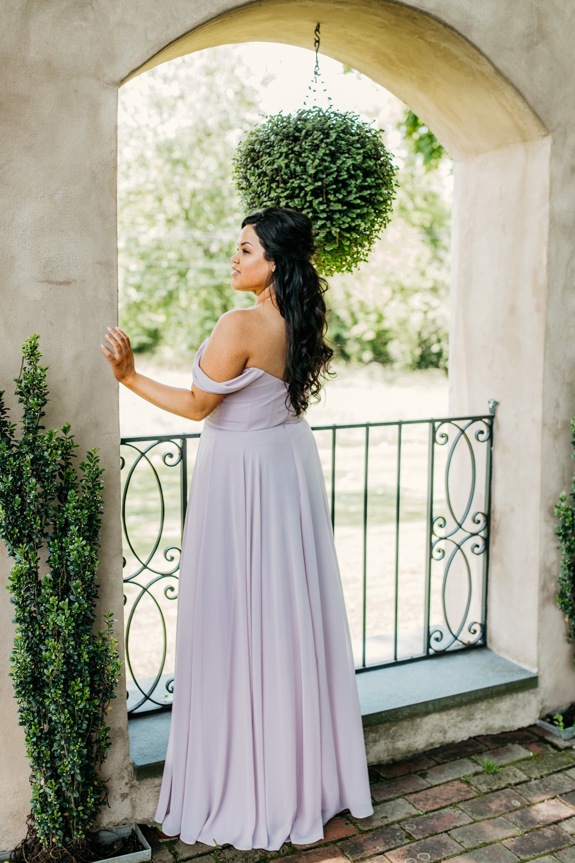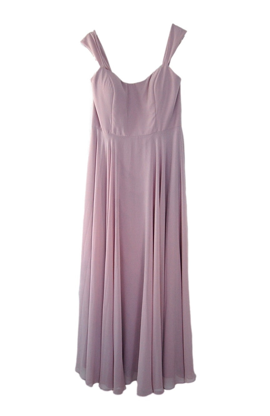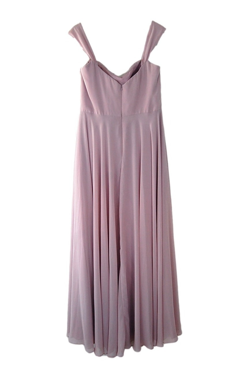 Chiffon princess seam boned bodice with sweetheart neckline, 2" gathered straps can be worn on or off the shoulder, natural waist, a-line princess seam skirt.