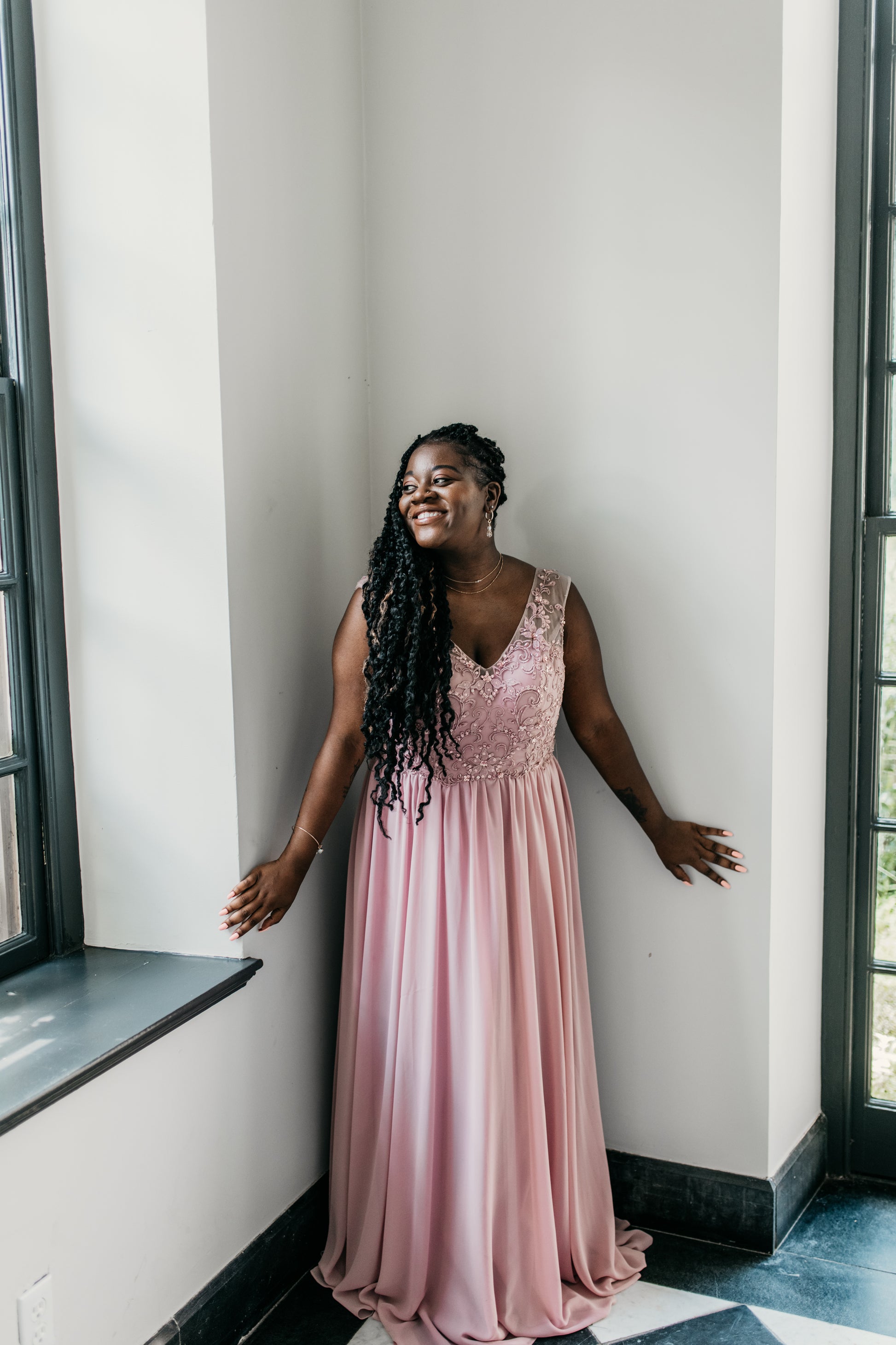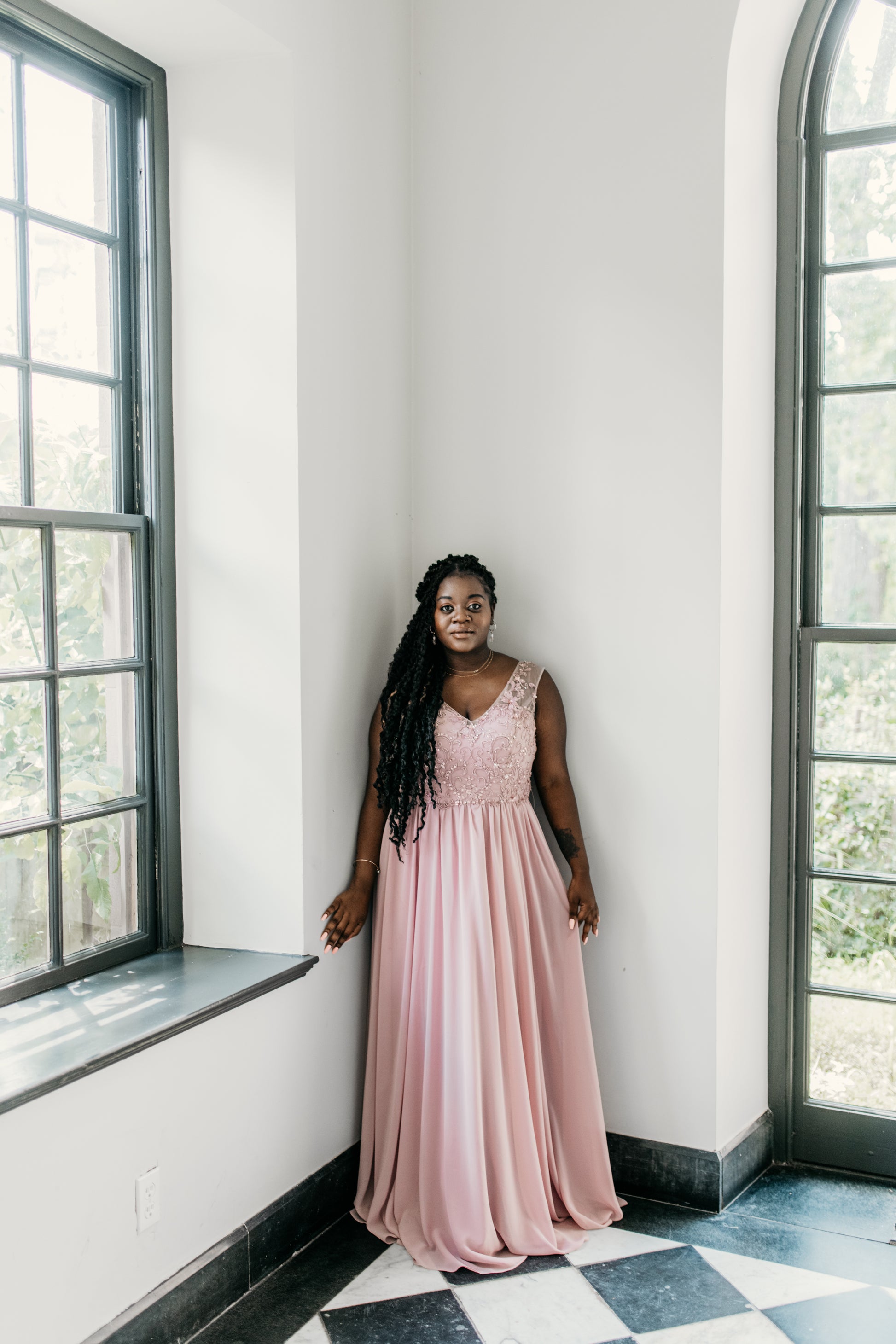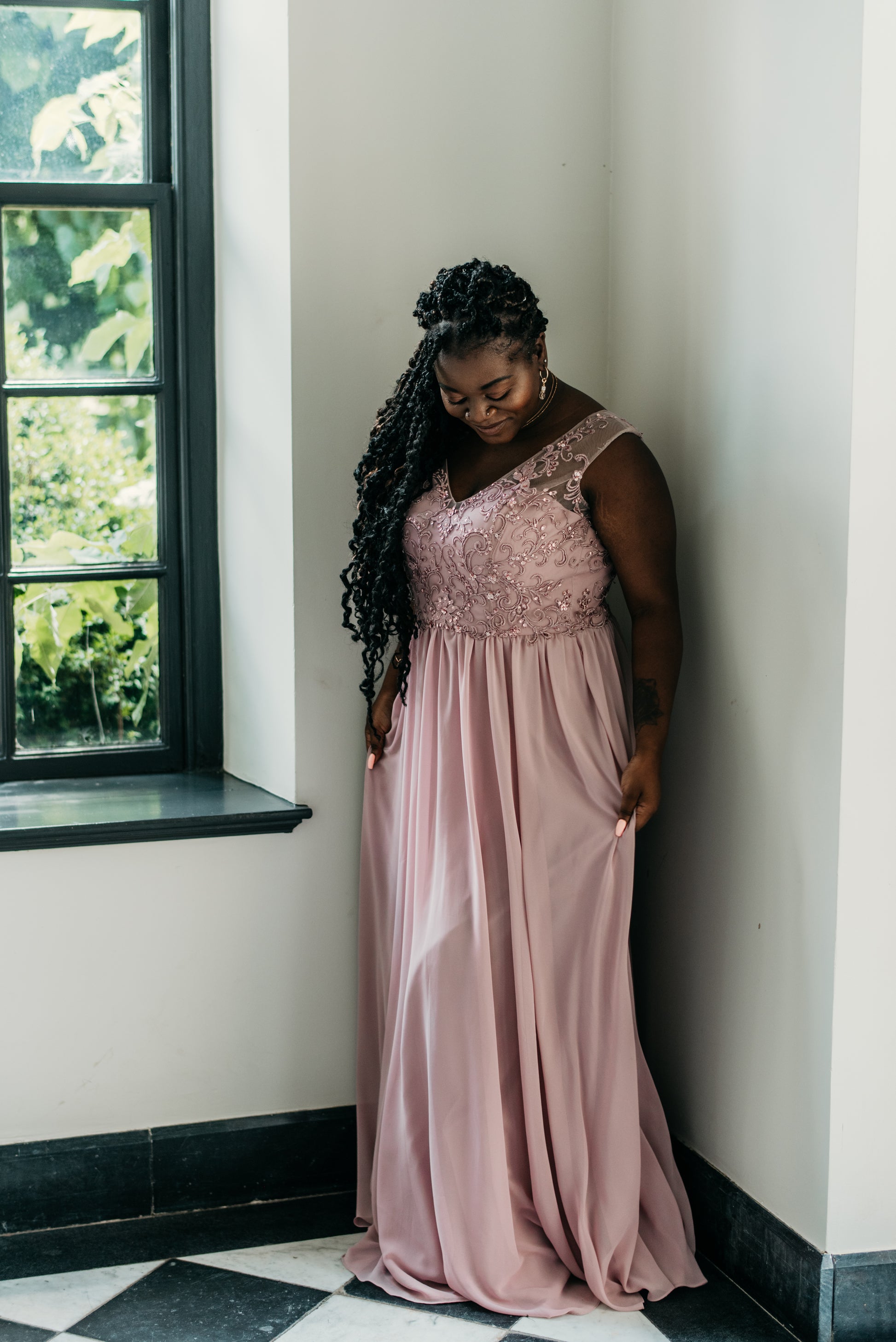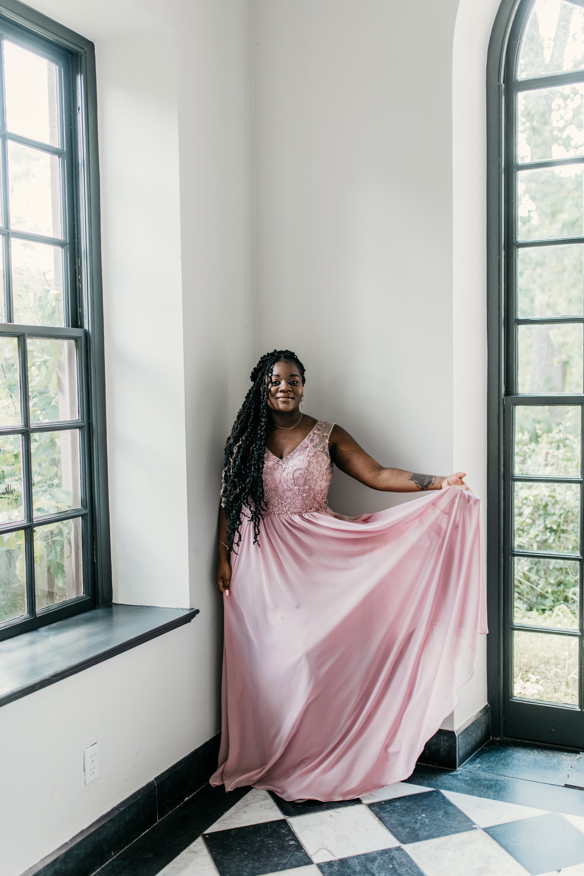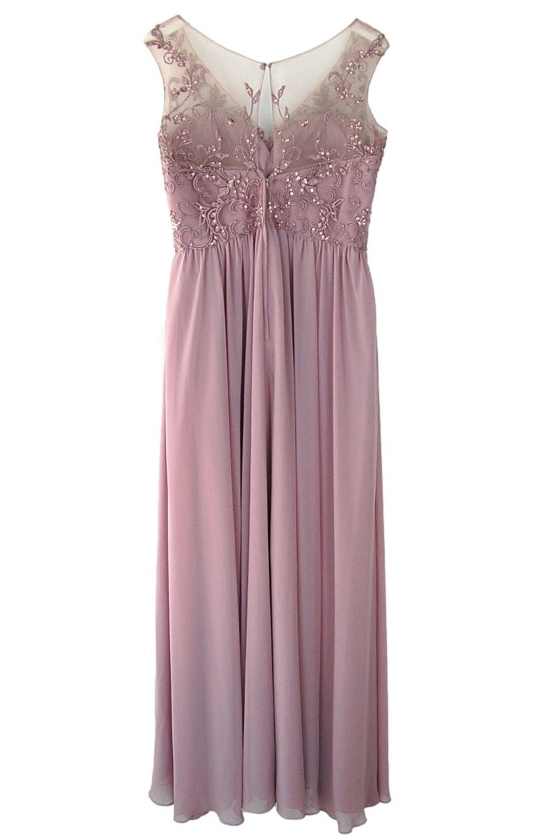 Embroidered chiffon with beading and sequins, scoop neck illusion bodice with beading and sequins, boned bodice underlay with built-in bust padding, keyhole at back neck. Gathered A-line chiffon skirt with side seam pockets.