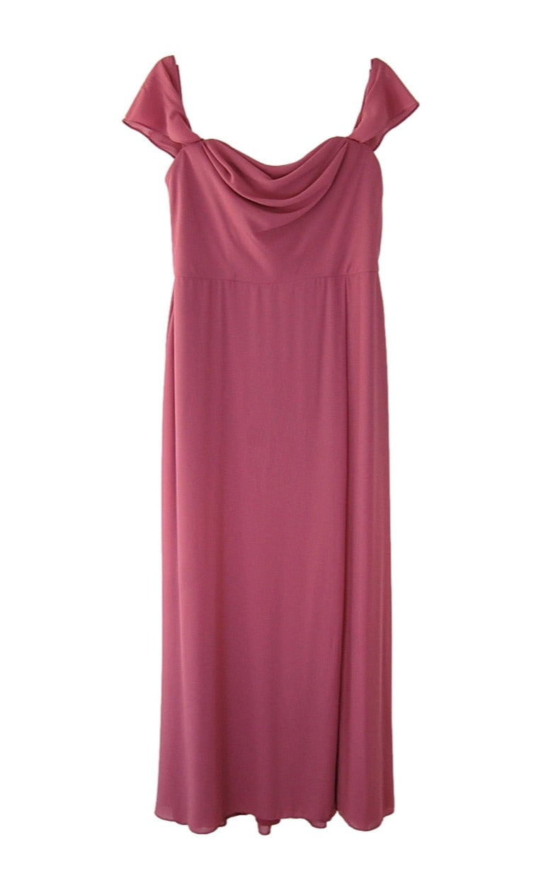 Chiffon sweetheart neckline boned bodice with cowl neck draping at bust, 3" draped straps can be worn on or off-shoulder, a-line skirt with slit at left leg
