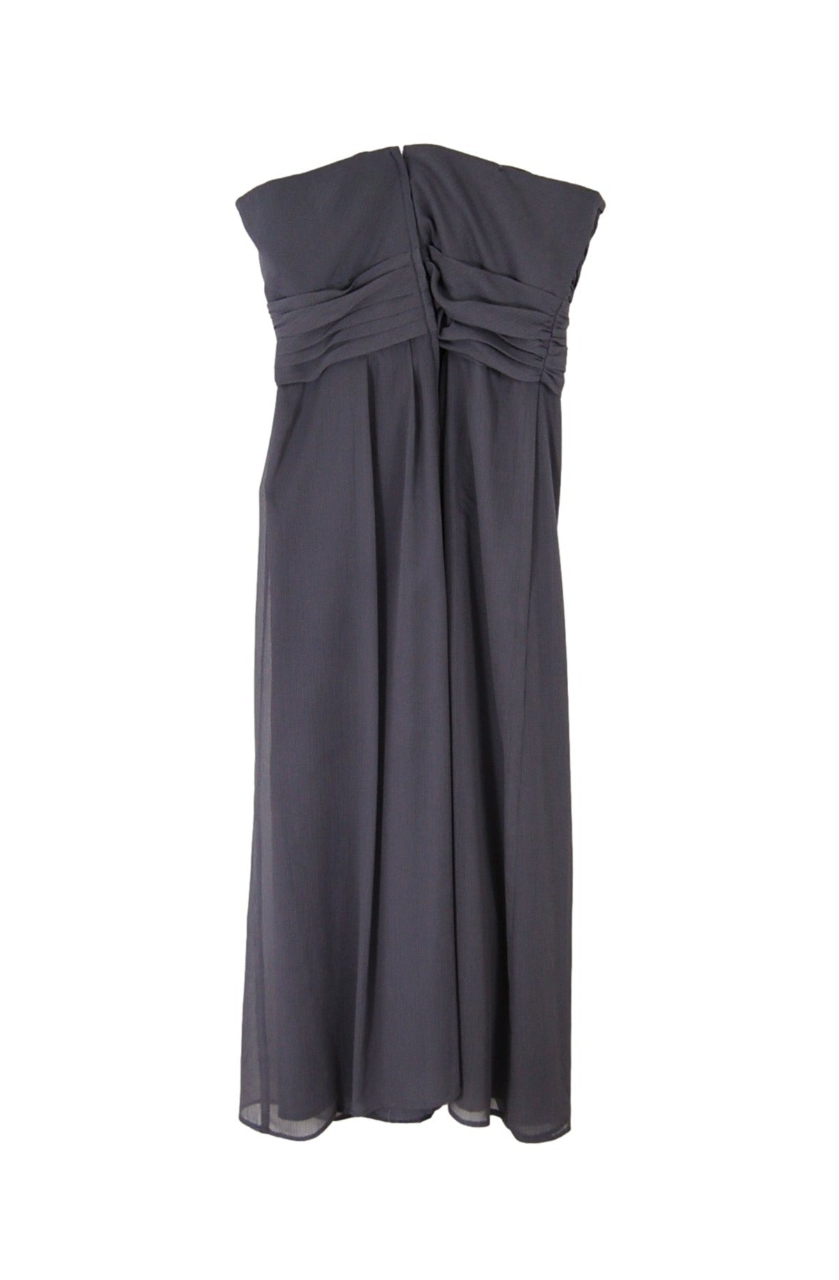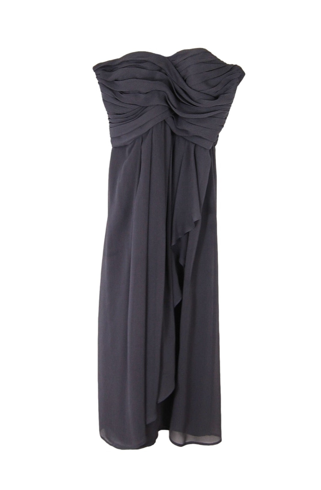 Crinkle chiffon strapless boned bodice with pleated, draped detail, a-line skirt with pleats at waistband, fabric flounce and cascade at left side of skirt