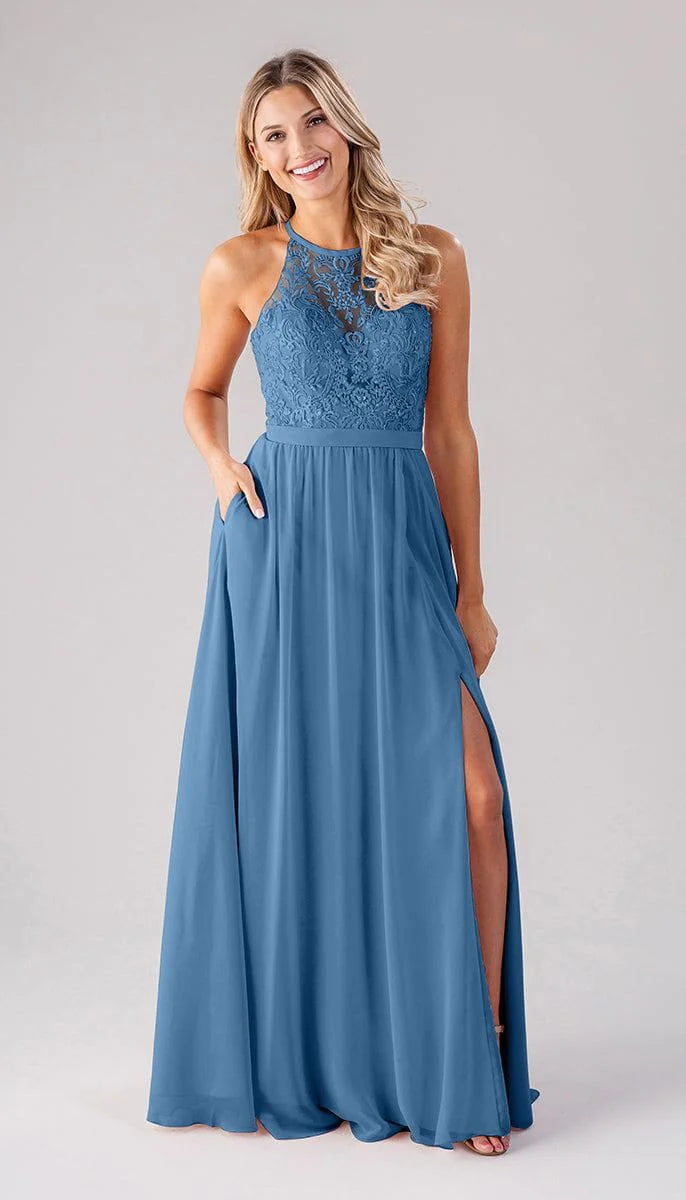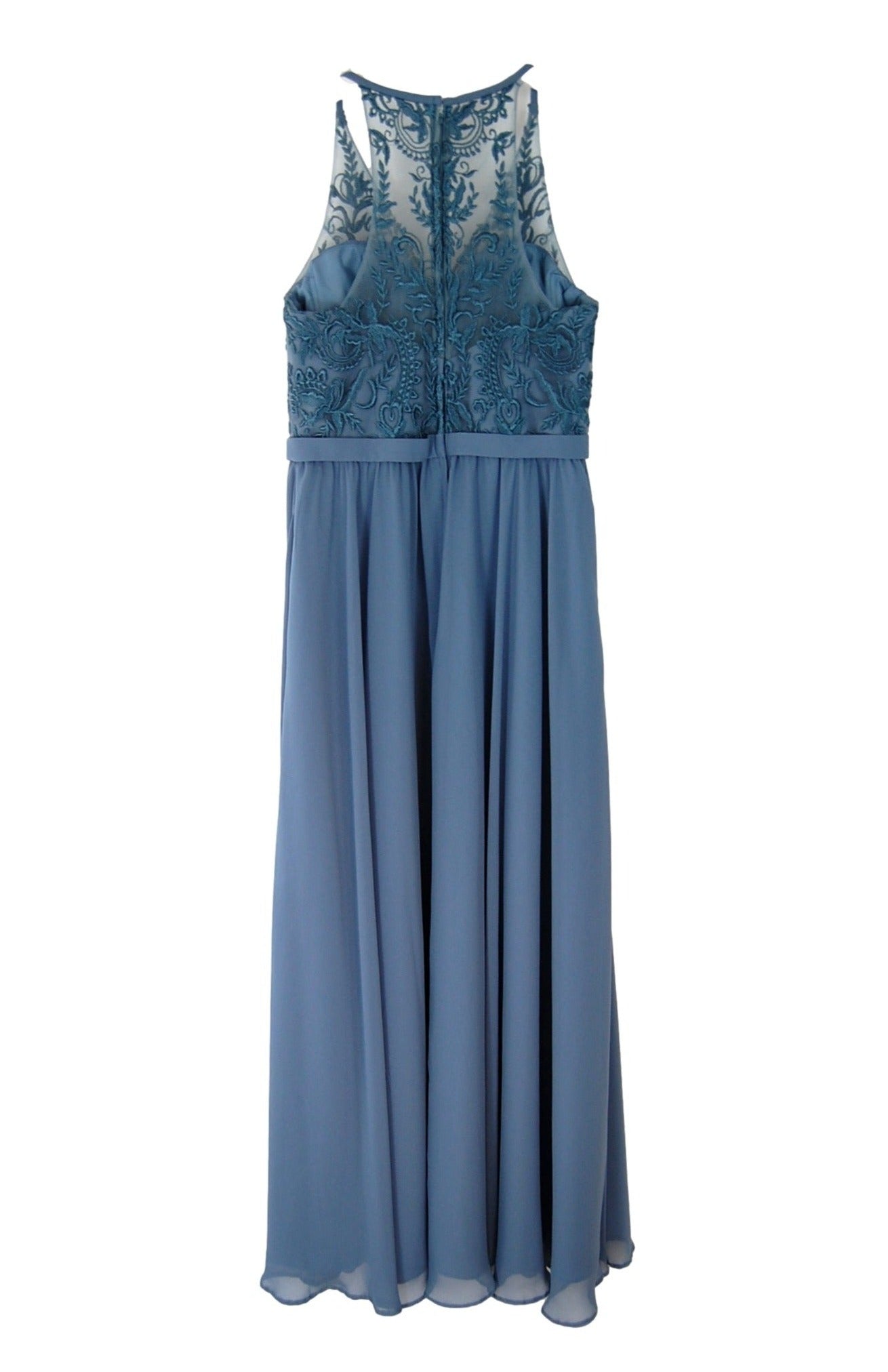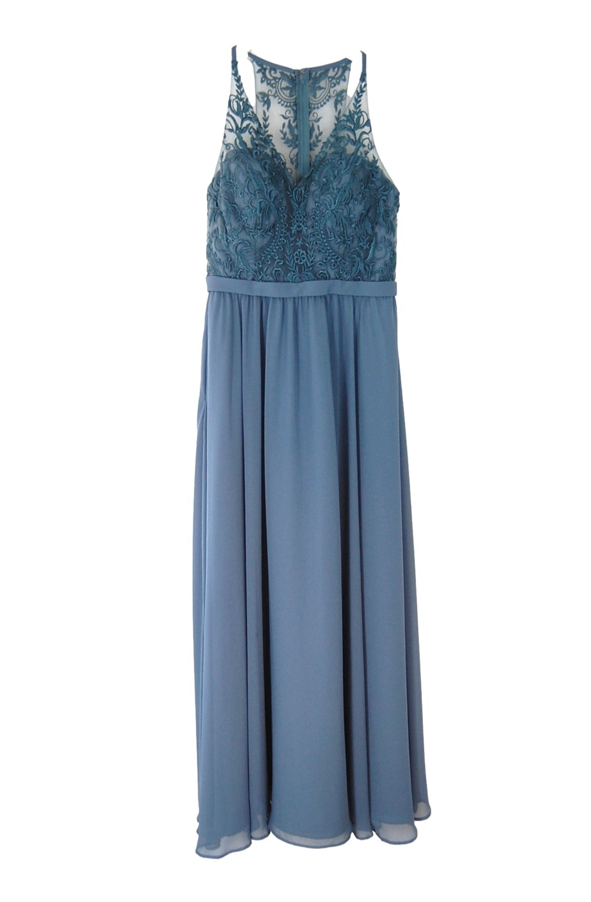 Chiffon and embroidered lace sweetheart boned bodice with built-in bust padding, floral embroidered mesh overlay with spaghetti straps, 1" self waistband, gathered a-line skirt, side seam pockets