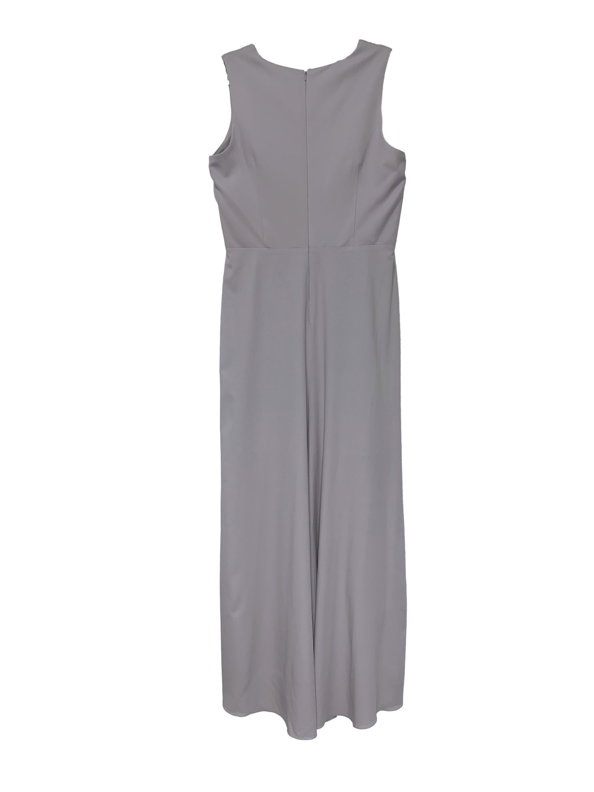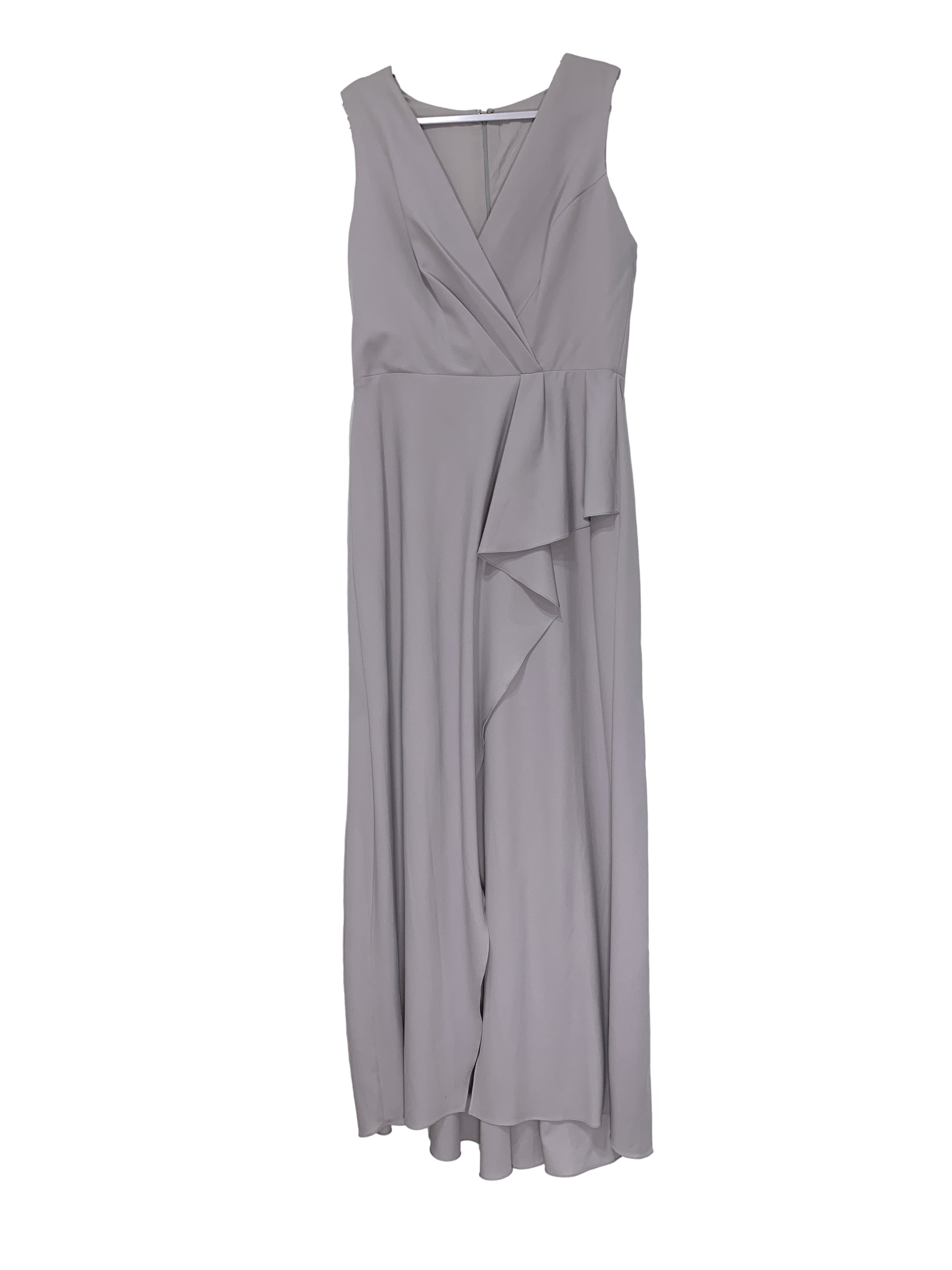 Elegant crepe surplice bodice, 3" straps, flounce at left front skirt with slight cascade, slit at right leg