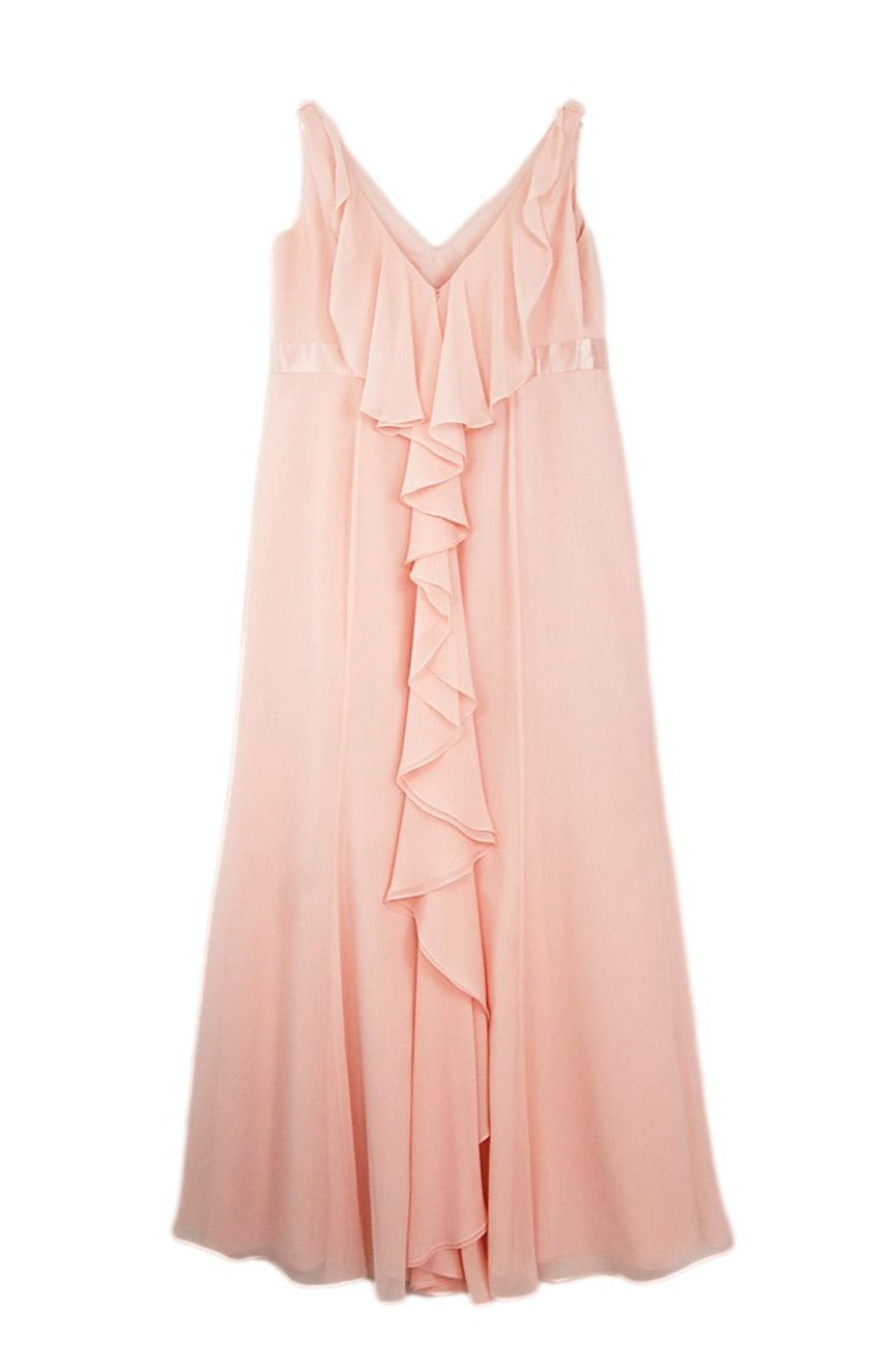 Chiffon v-neck extended empire bodice with ruffle flounce down front, 1.5" straps, 1.5" satin waistband, v-back with ruffles flounces at back neckline, traveling down CB seam, a-line skirt with gathers at center front