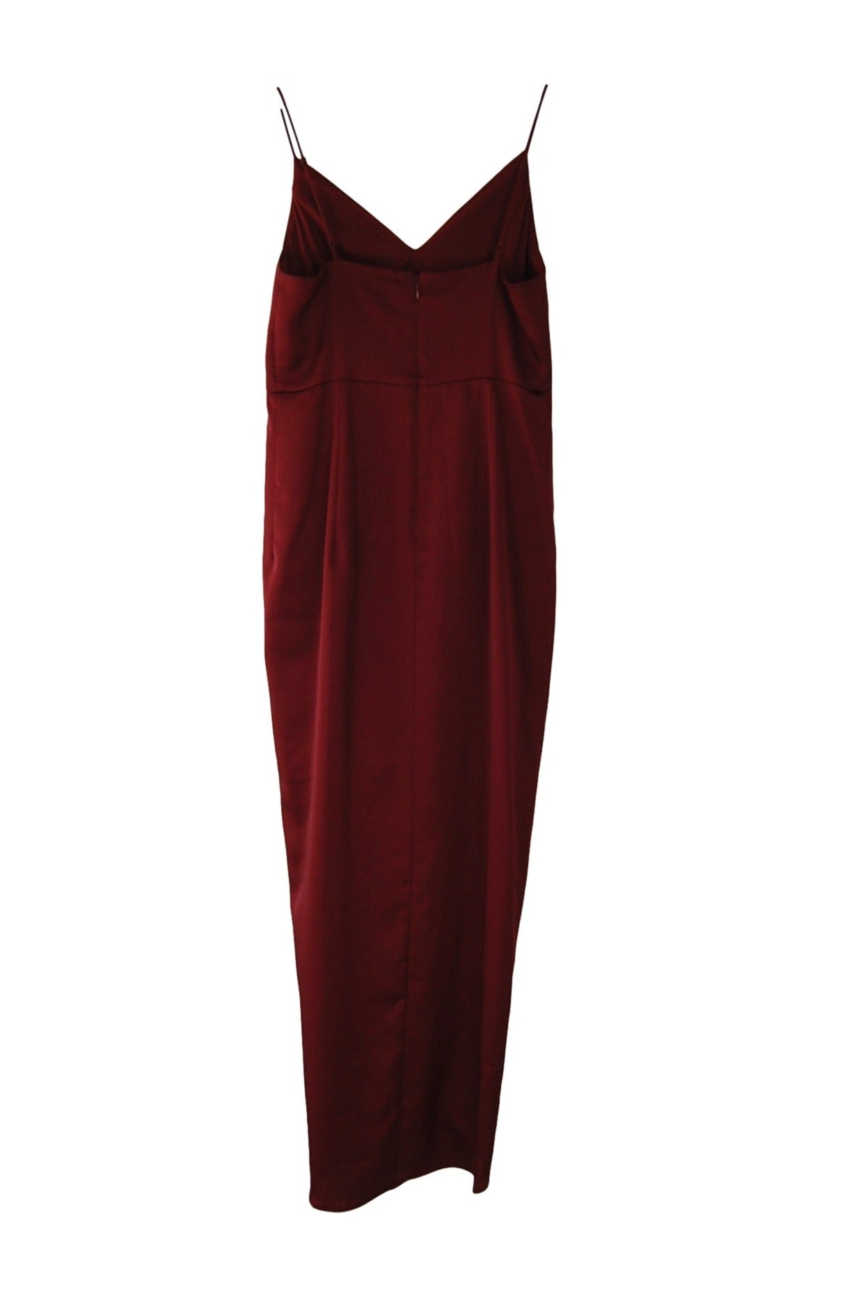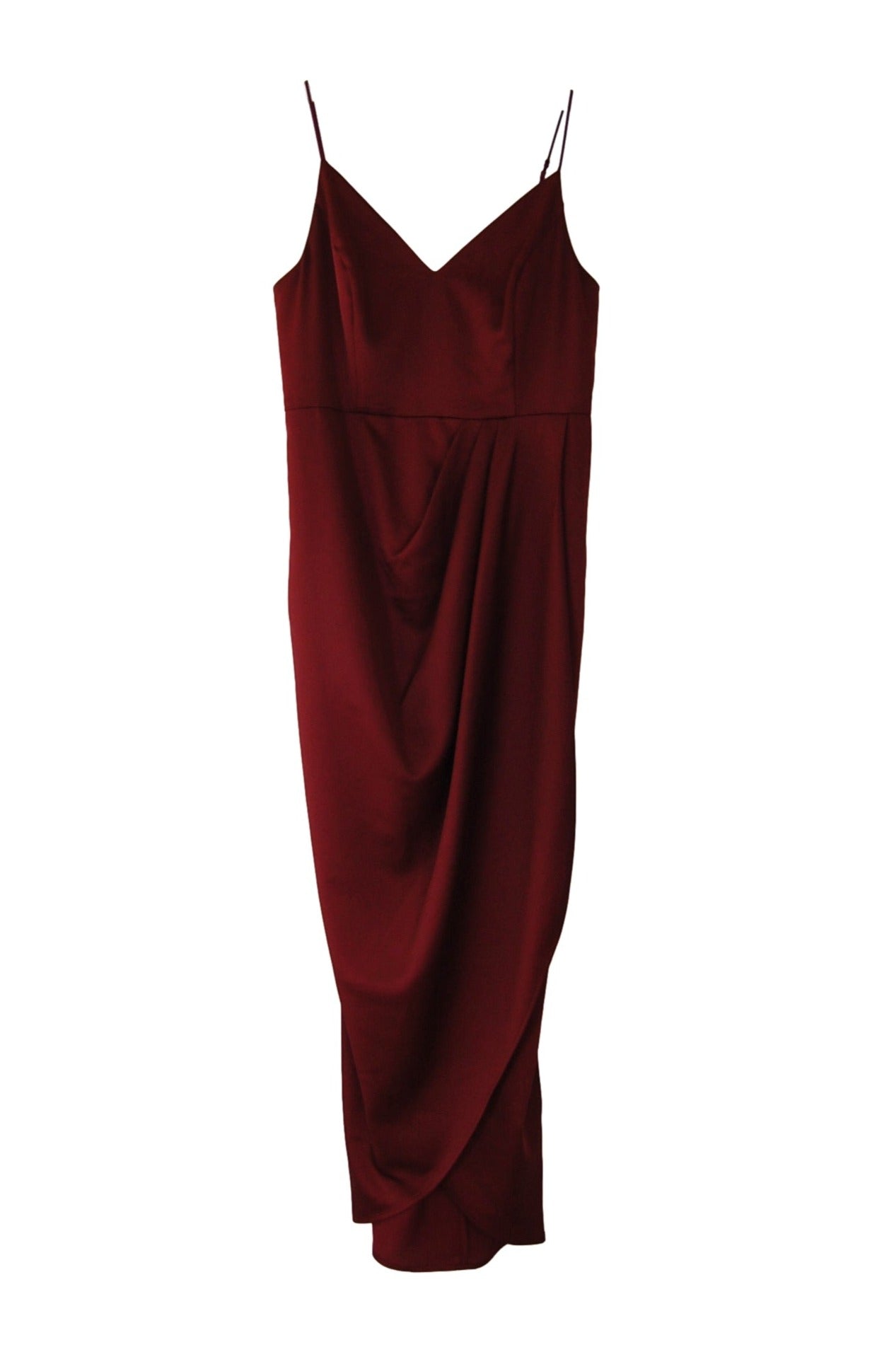 Satin princess seamed bodice with adjustable spaghetti straps, draping detail at front waist, tulip wrap skirt