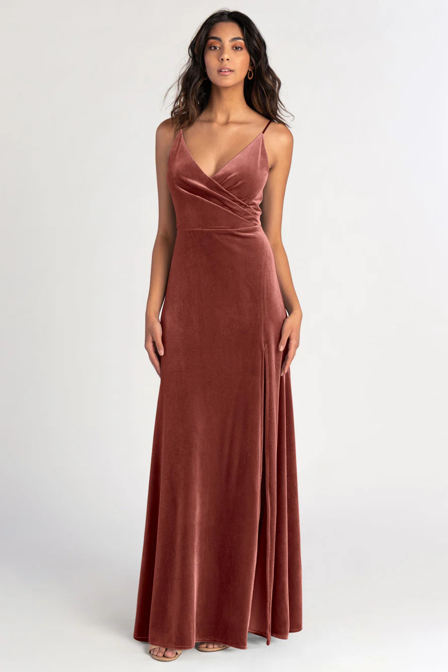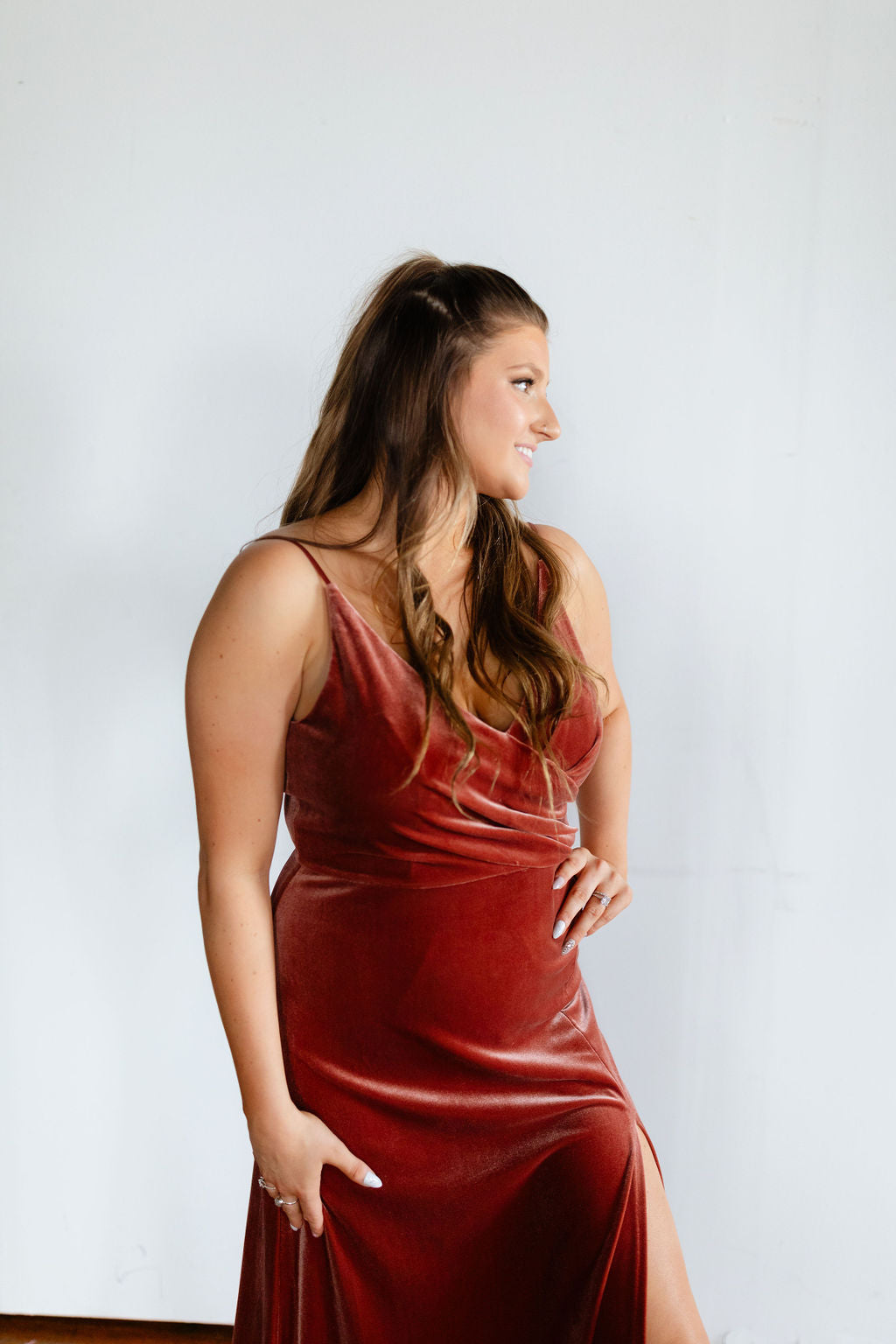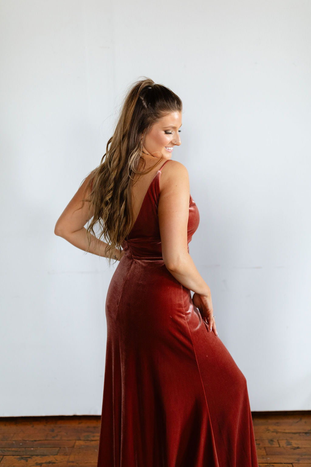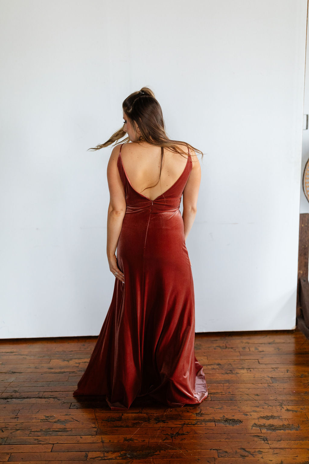 Deep terracotta stretch velvet, v-neckline surplice bodice, spaghetti straps, deep v back, a-line skirt, slit at left leg