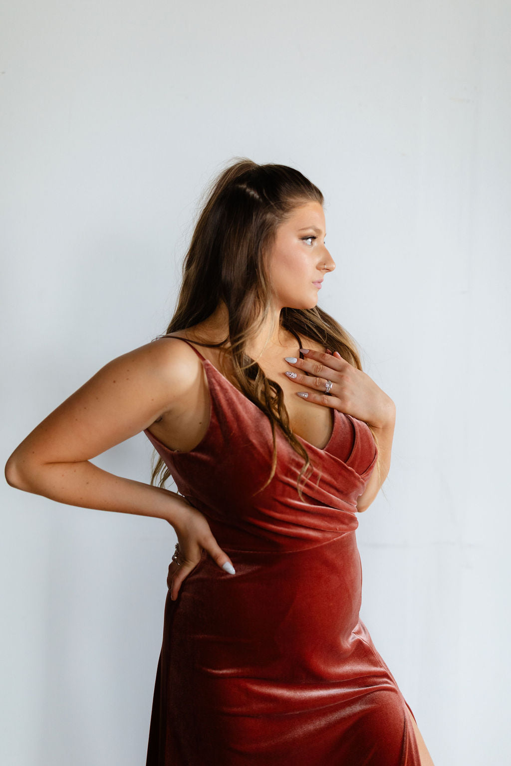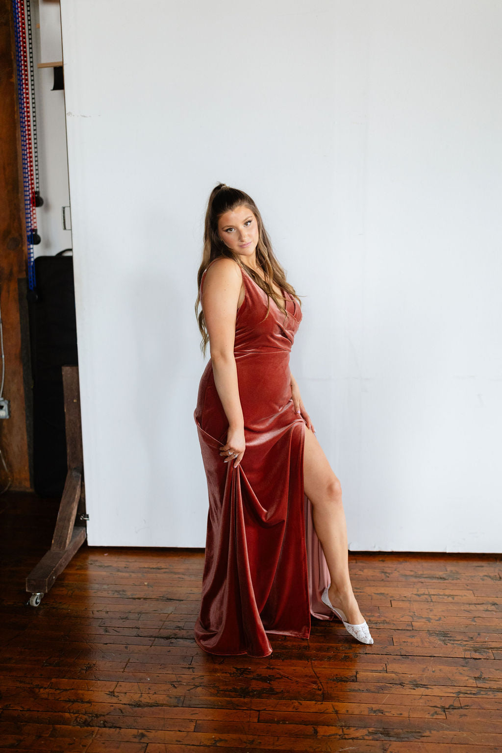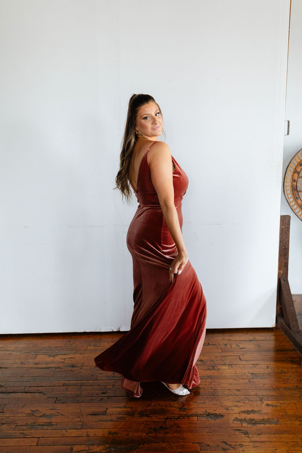 Deep terracotta stretch velvet, v-neckline surplice bodice, spaghetti straps, deep v back, a-line skirt, slit at left leg