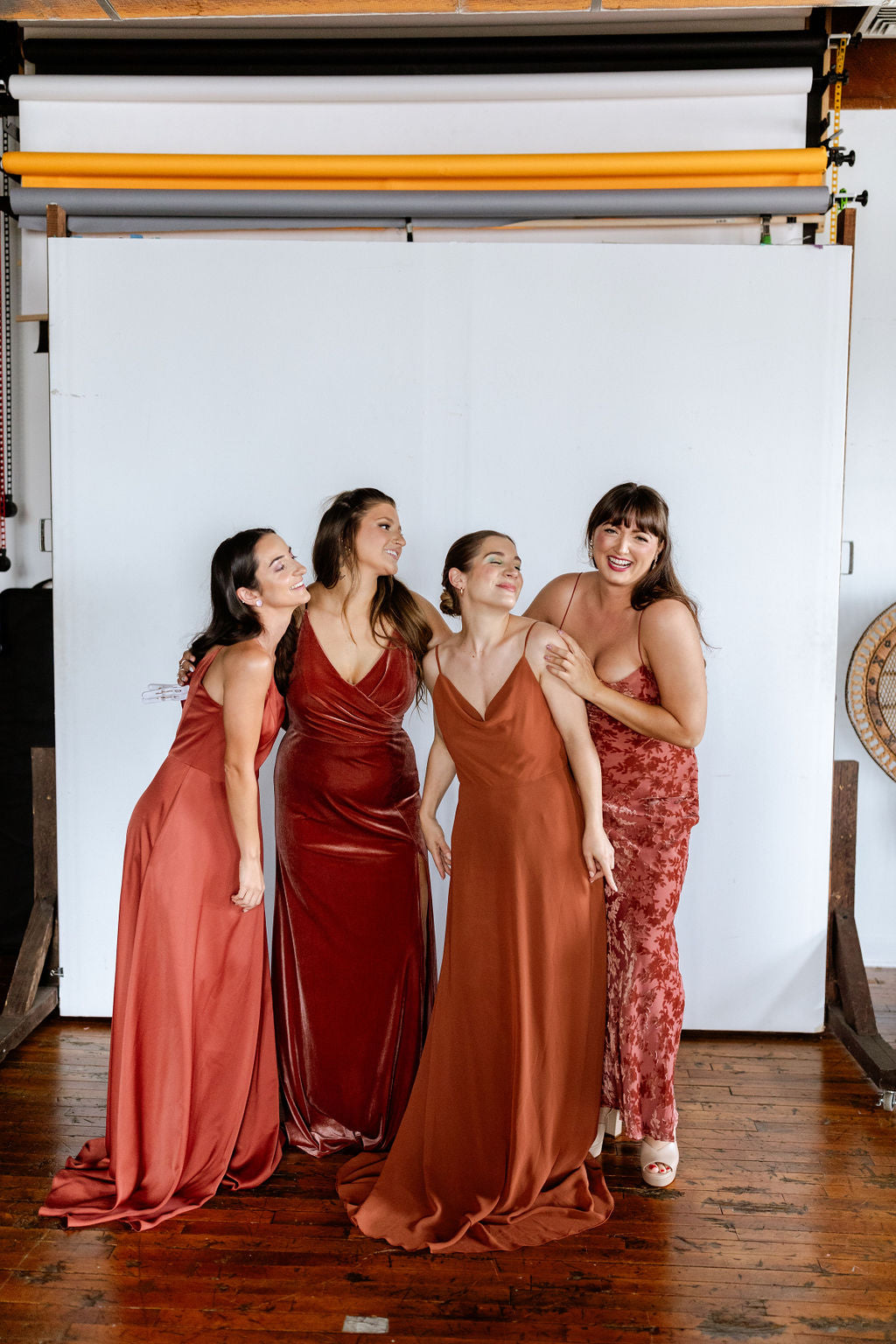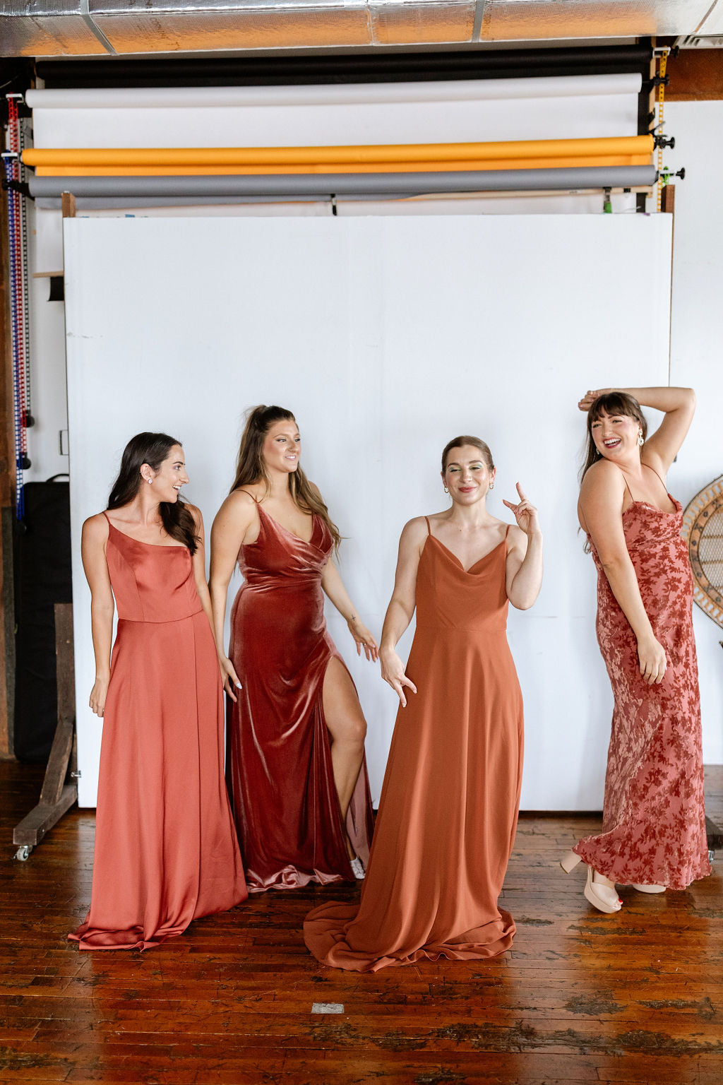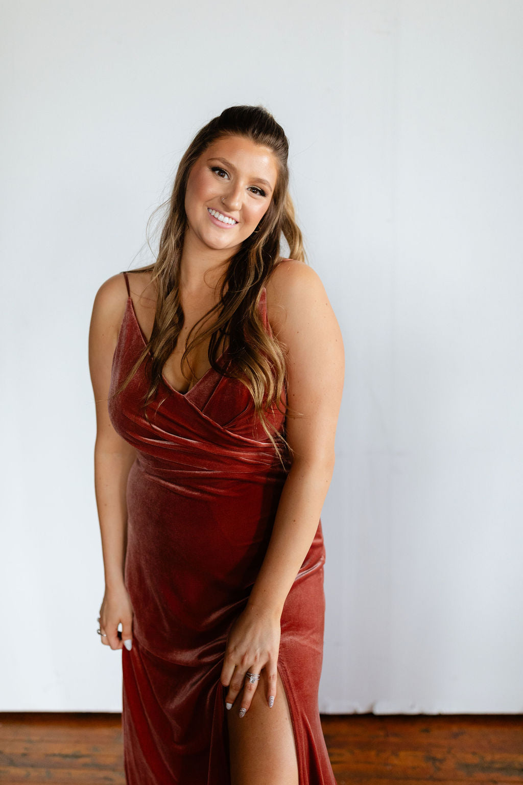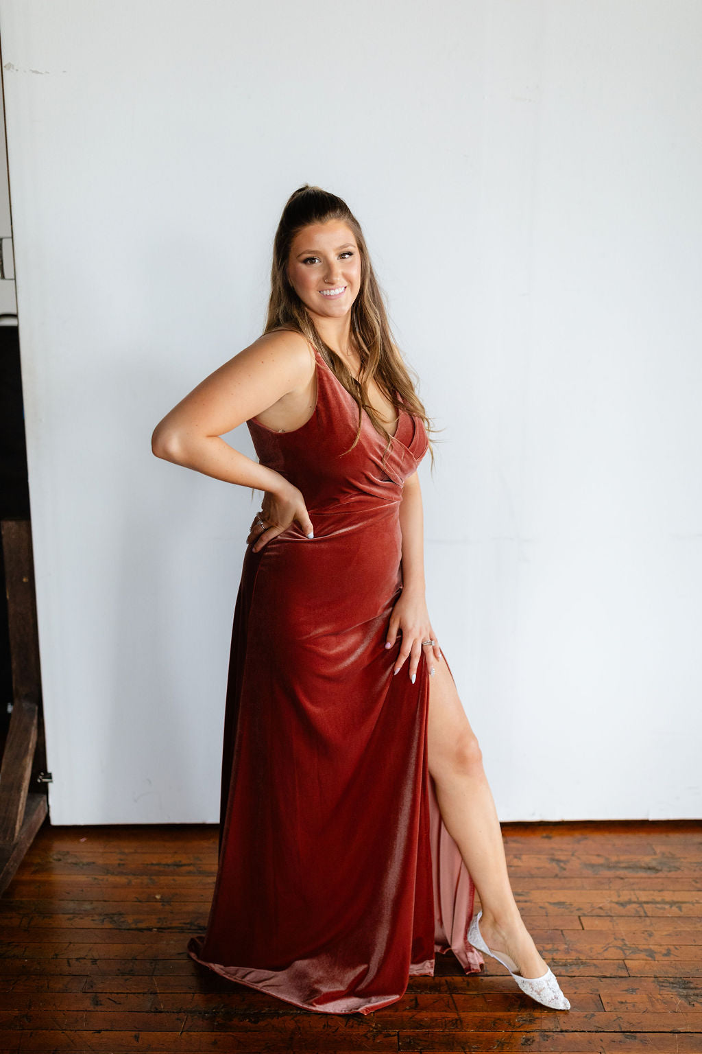 Deep terracotta stretch velvet, v-neckline surplice bodice, spaghetti straps, deep v back, a-line skirt, slit at left leg