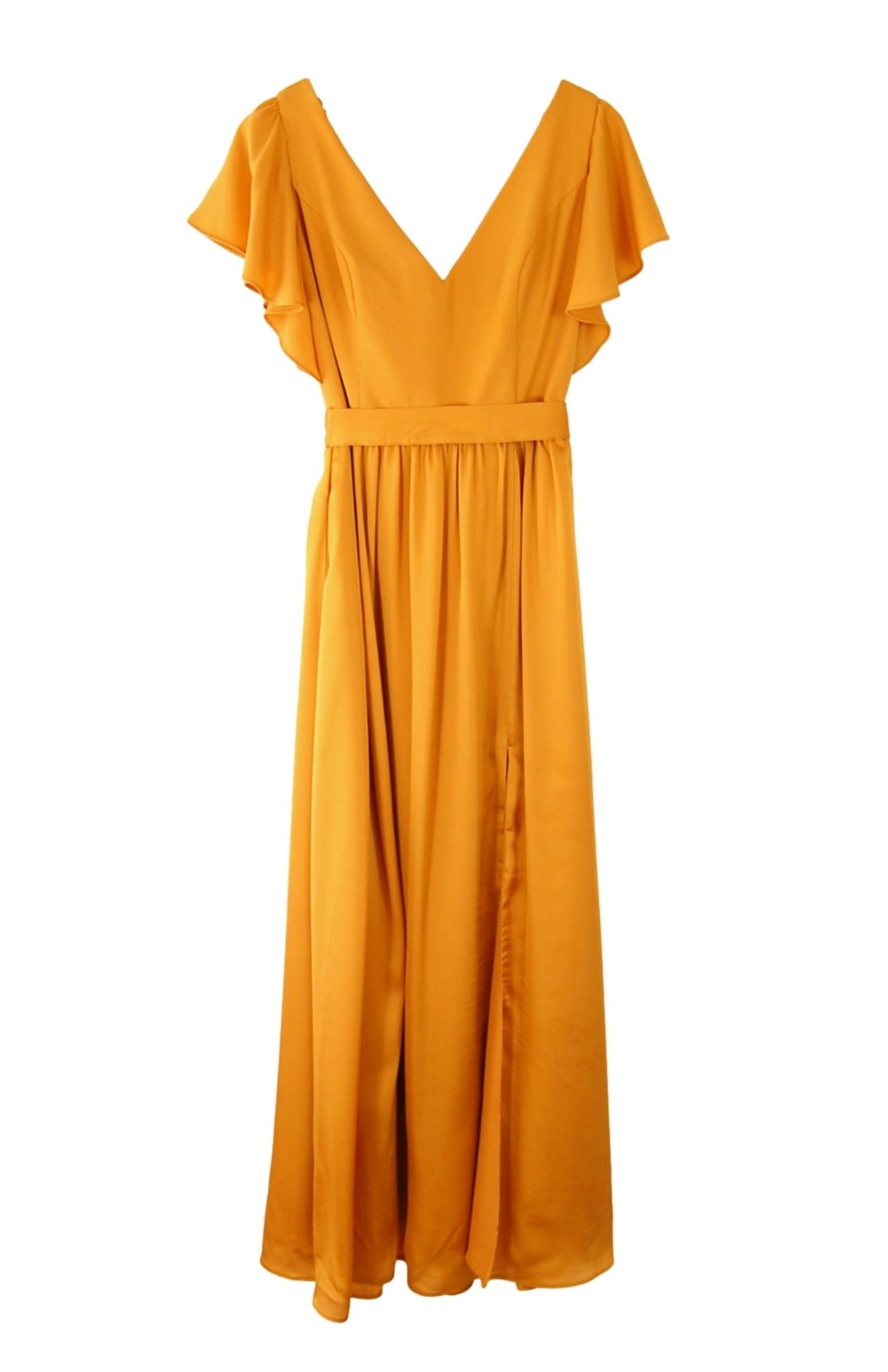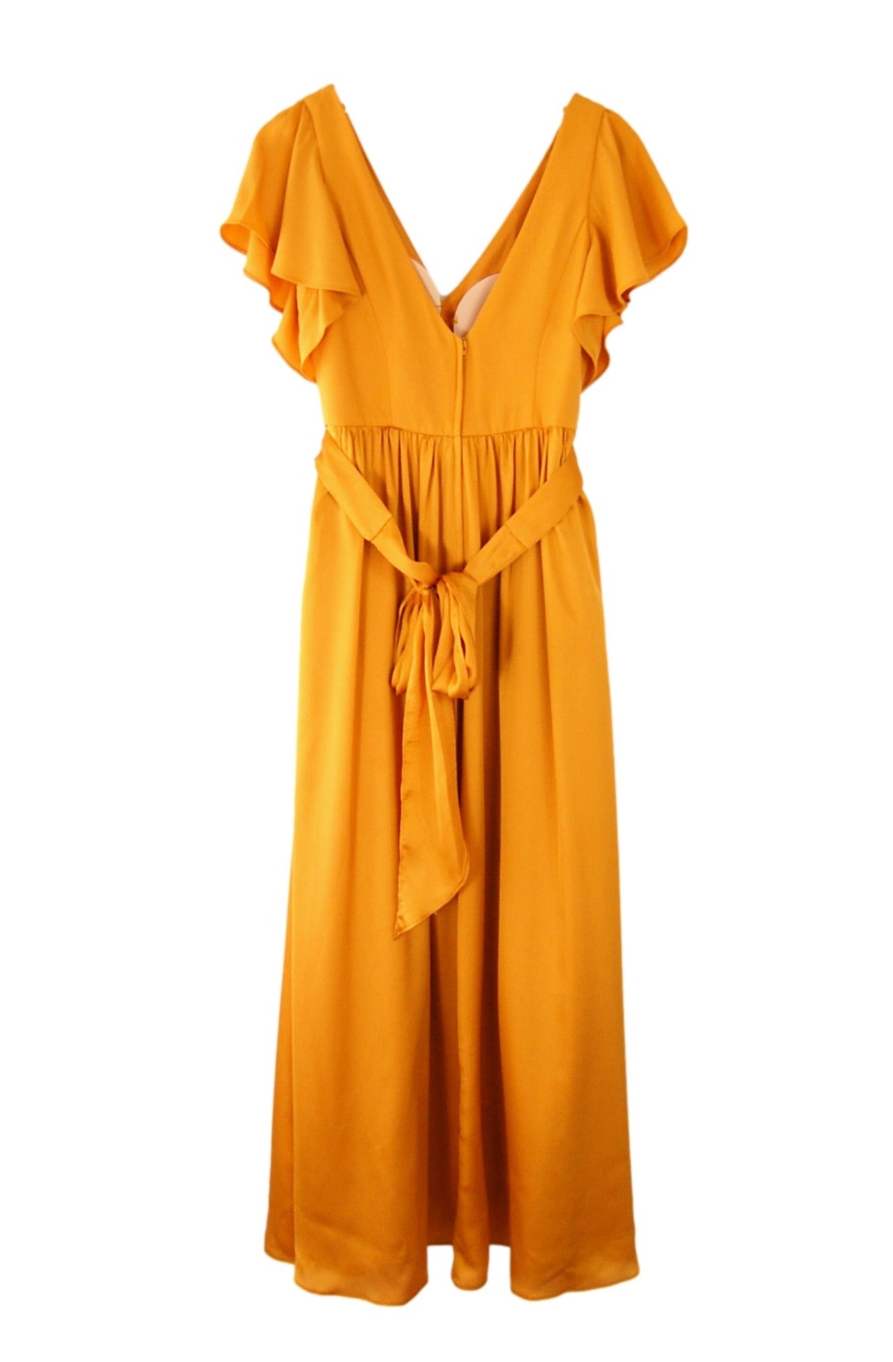 Satin princess seamed v-neck bodice with built-in bust padding, deep v at back with spaghetti strap at back neck, gathered flutter sleeves, optional 1.75" wide belt at waistband with streamers tying at back, gathered a-line skirt with side seam pockets