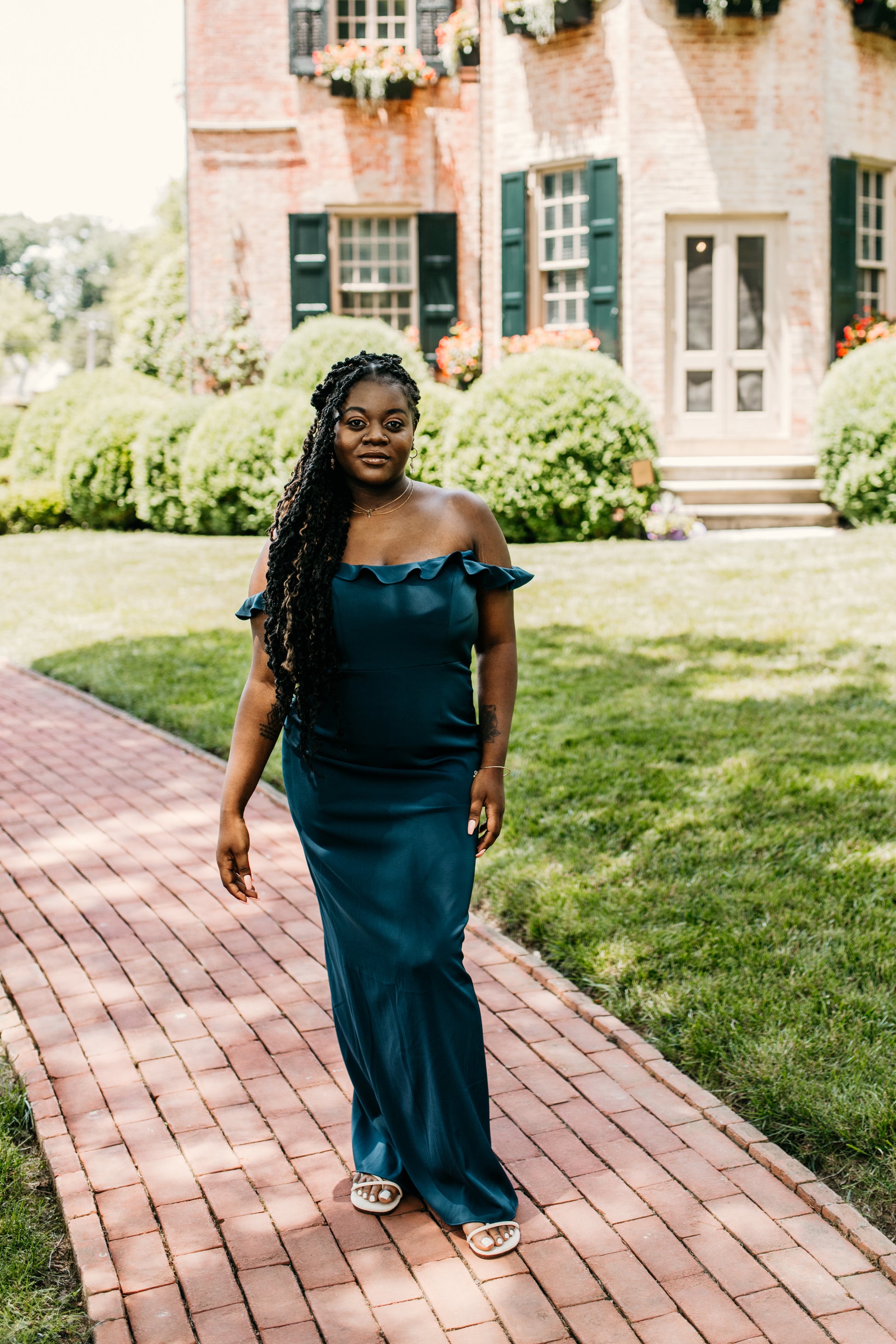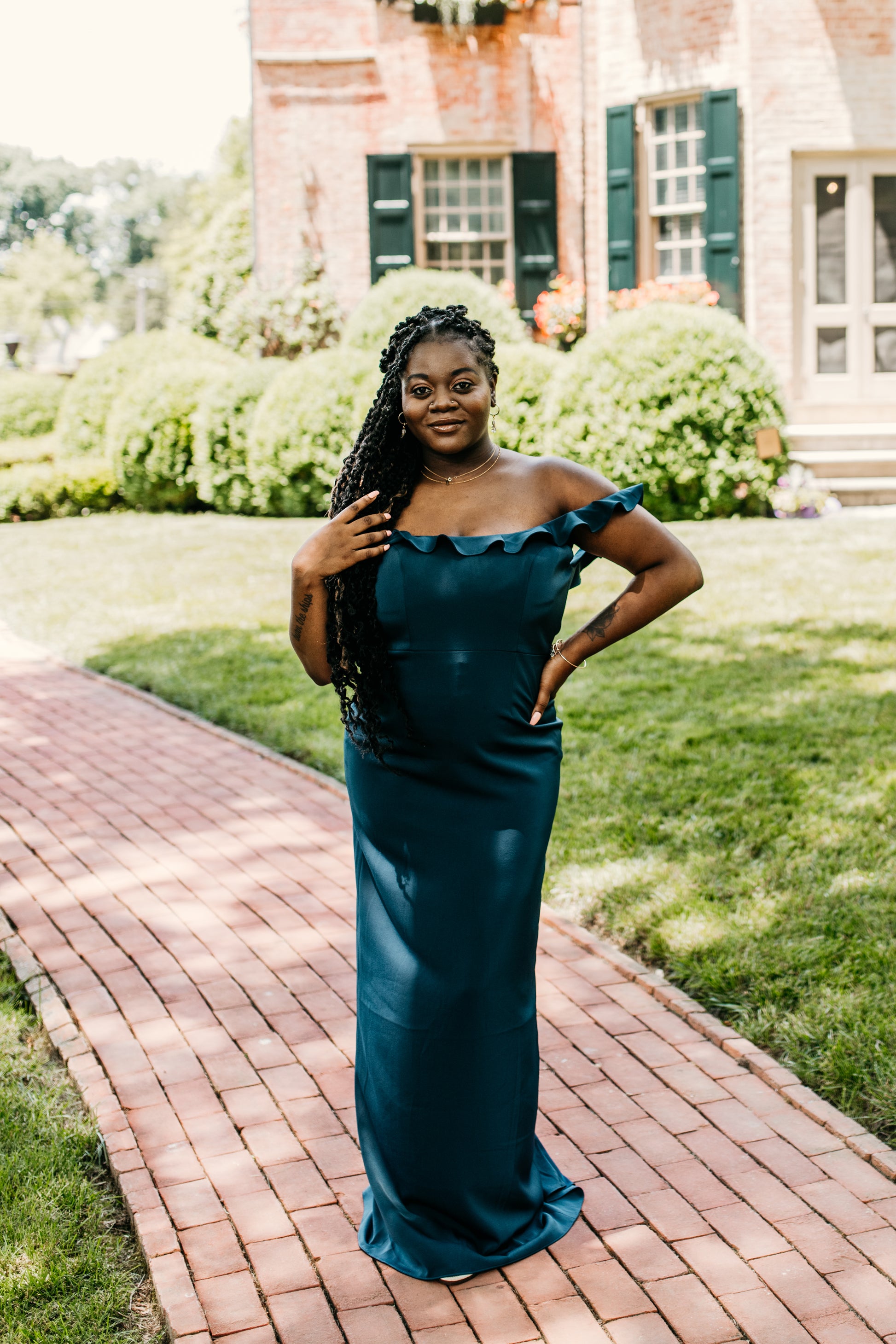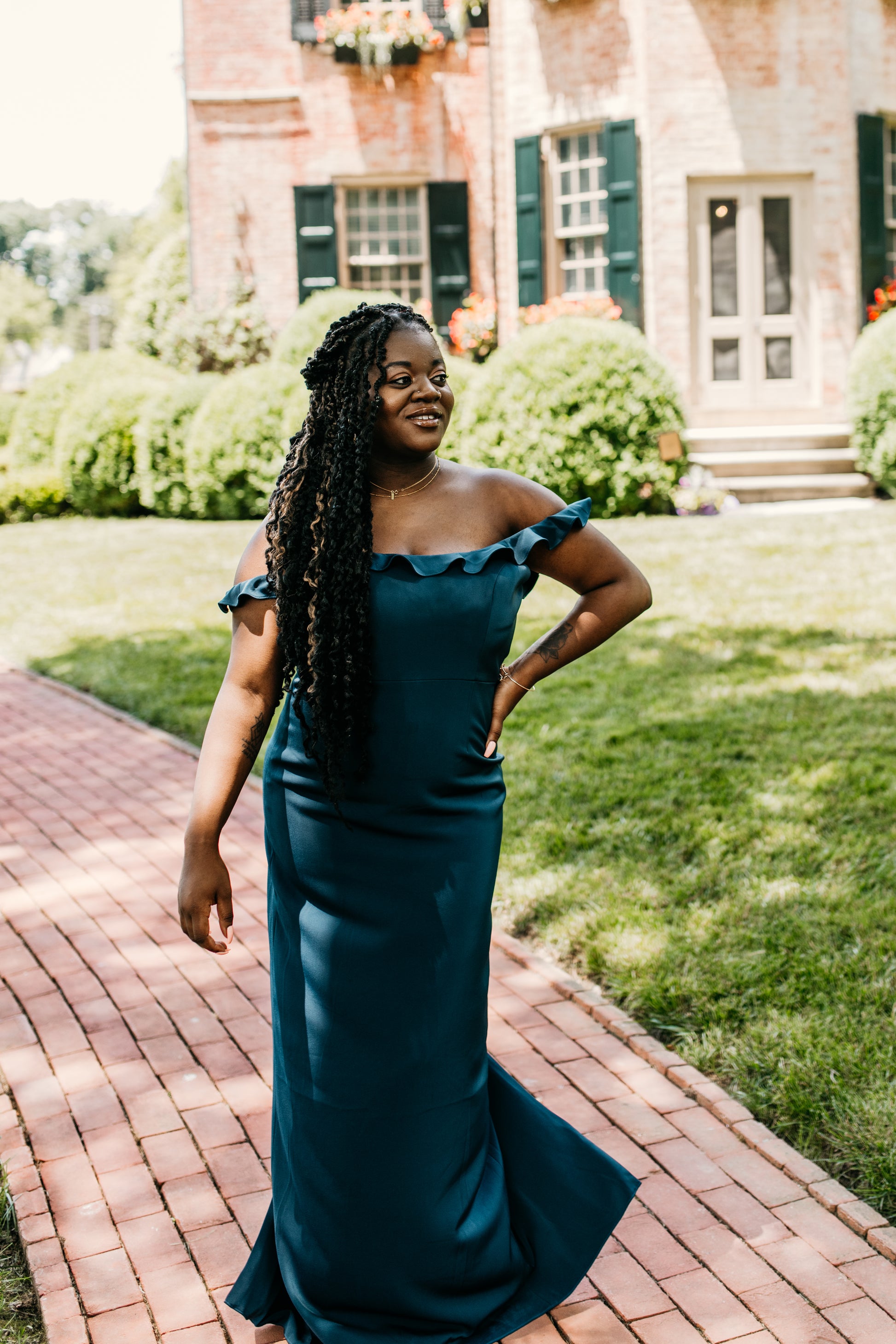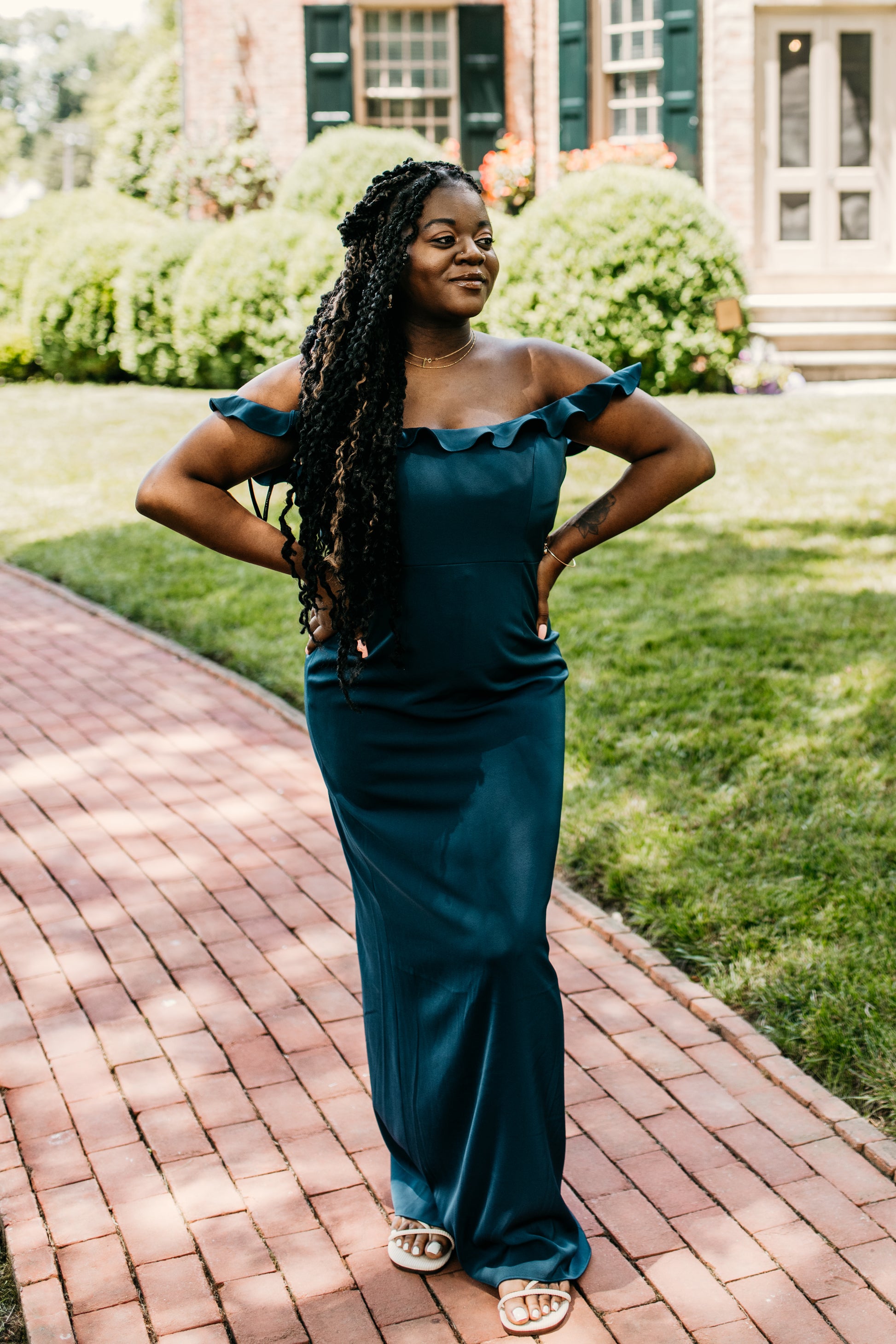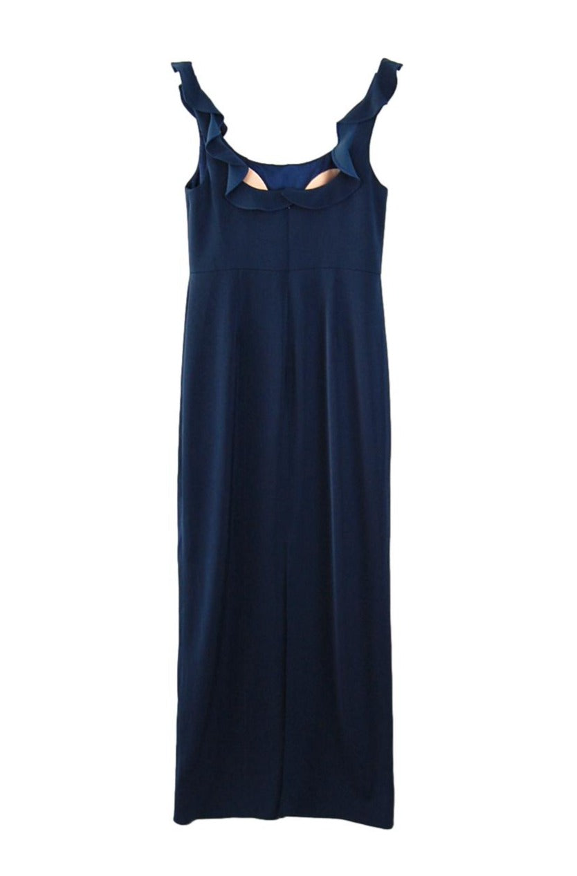 Crepe scoop neck, princess seamed, extended empire bodice with 1.5" wide straps, ruffles wrapping from front bodice, to straps, all the way around center back neckline, princess seam column skirt with slit at center back hem.