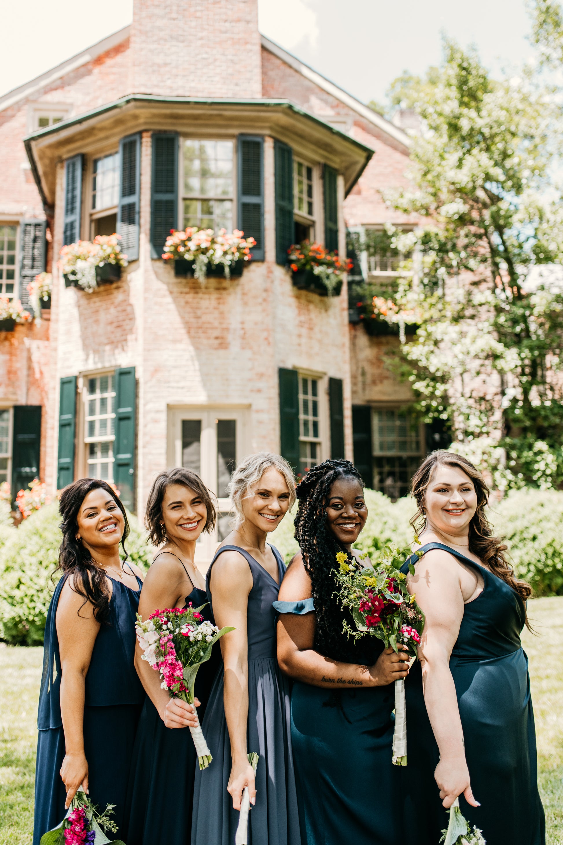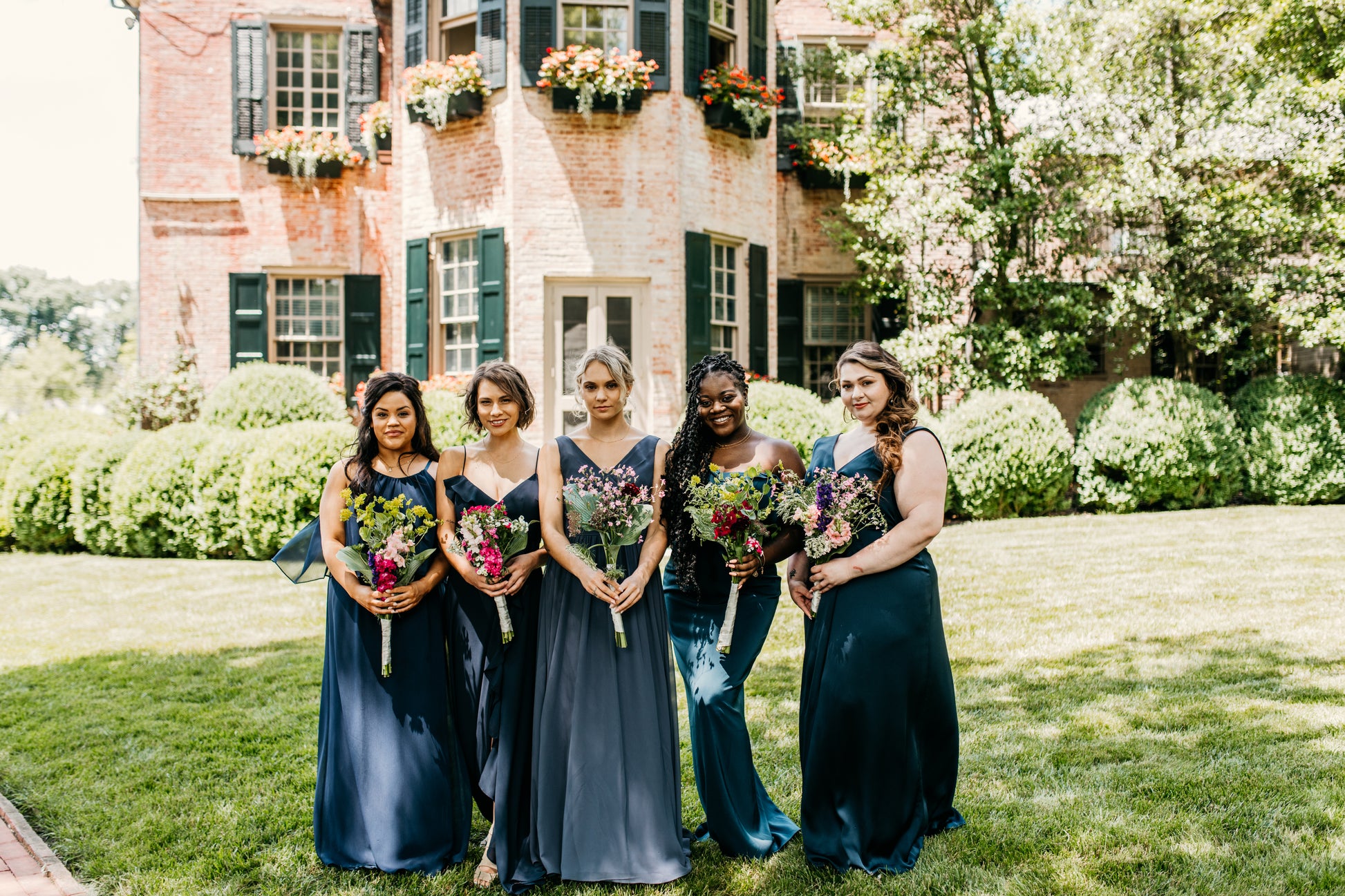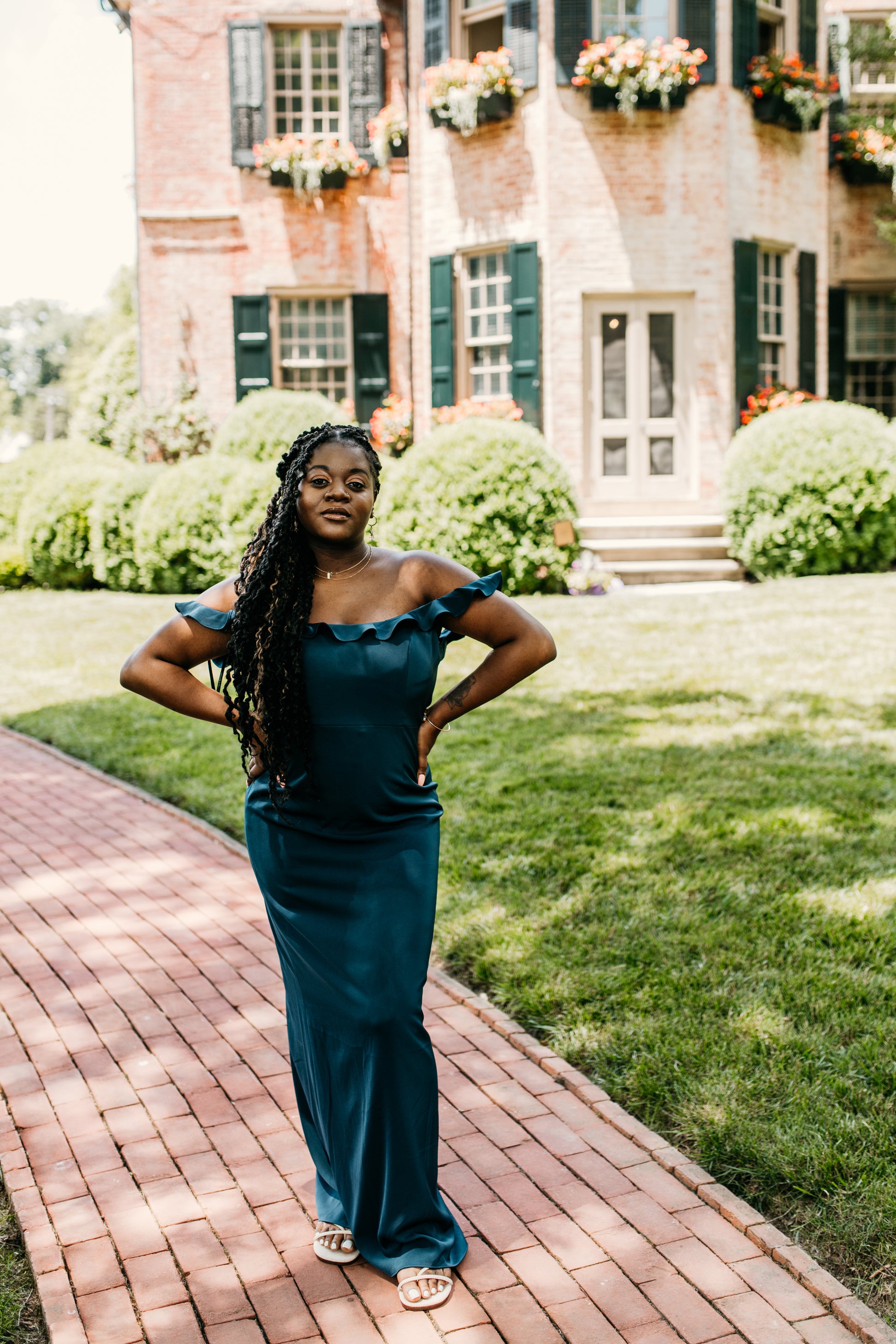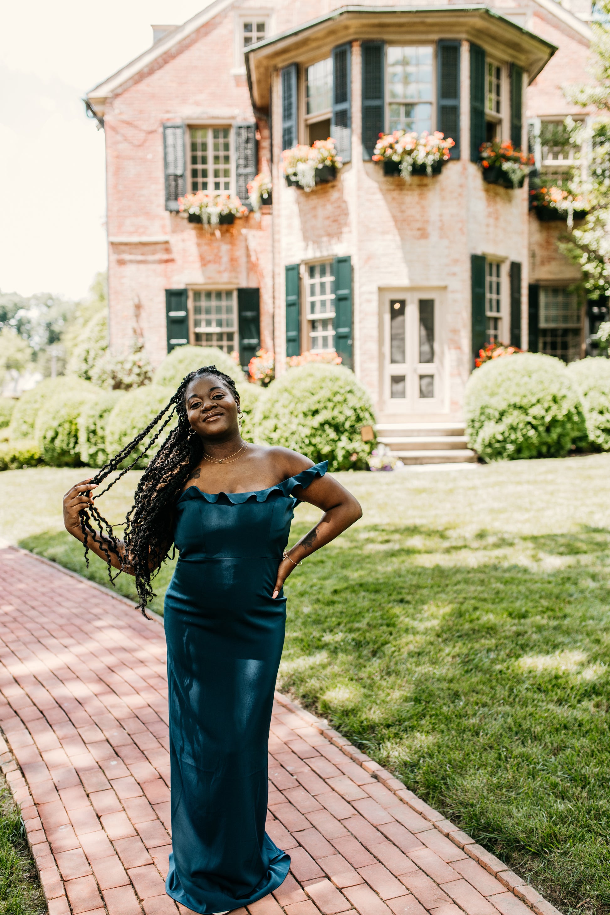 Crepe scoop neck, princess seamed, extended empire bodice with 1.5" wide straps, ruffles wrapping from front bodice, to straps, all the way around center back neckline, princess seam column skirt with slit at center back hem.