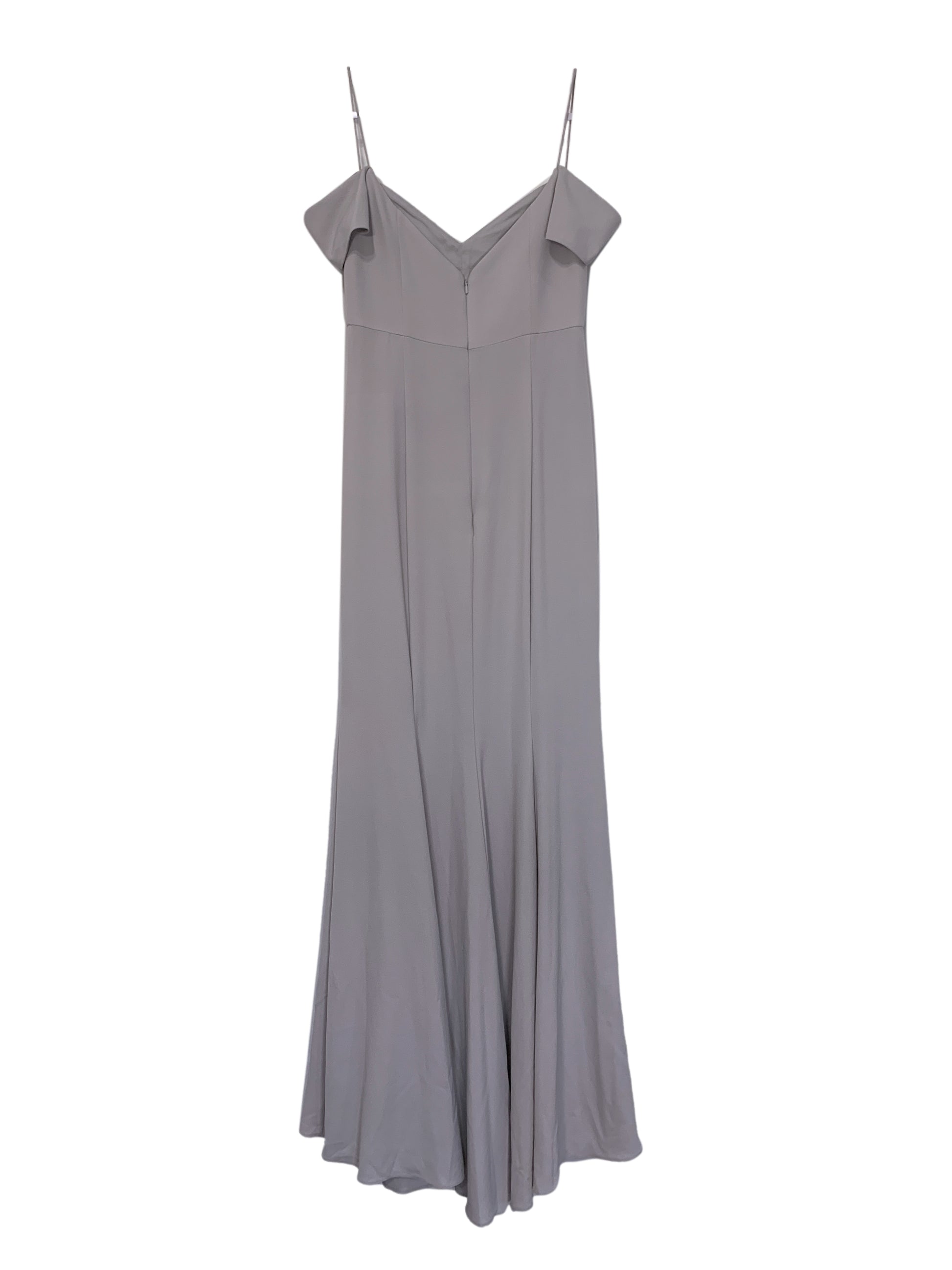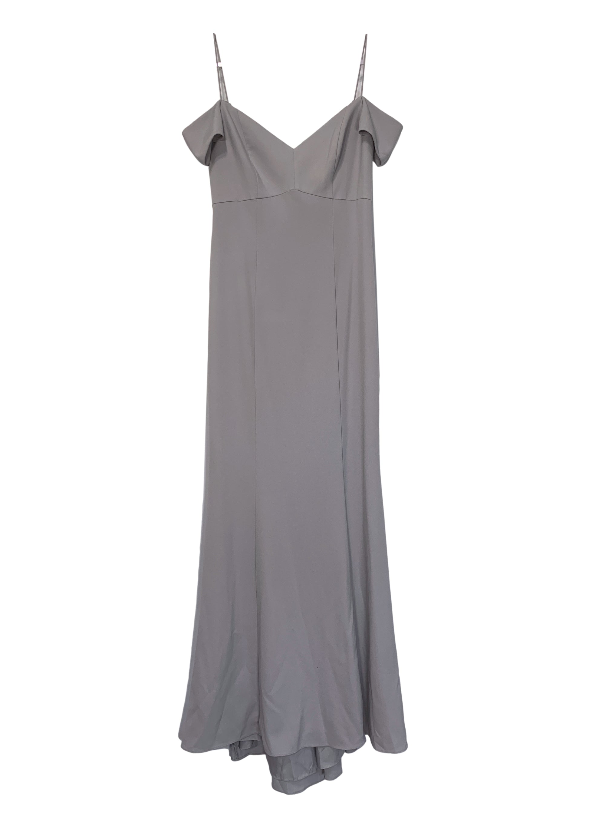 Soft grey crepe dress with v-neck empire princes seam bodice, spaghetti straps with off-shoulder sleeves, sleek princess seam a-line skirt.