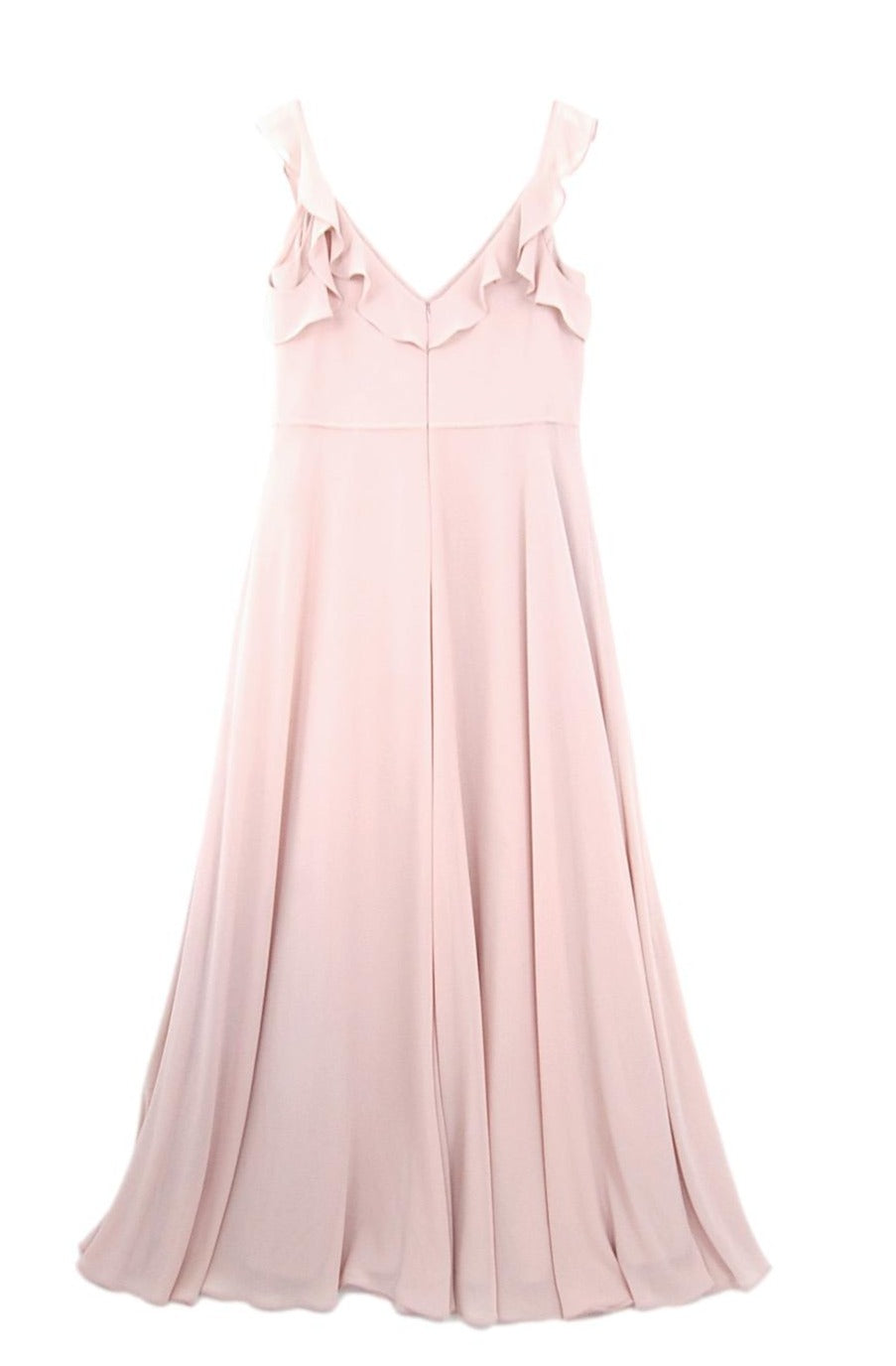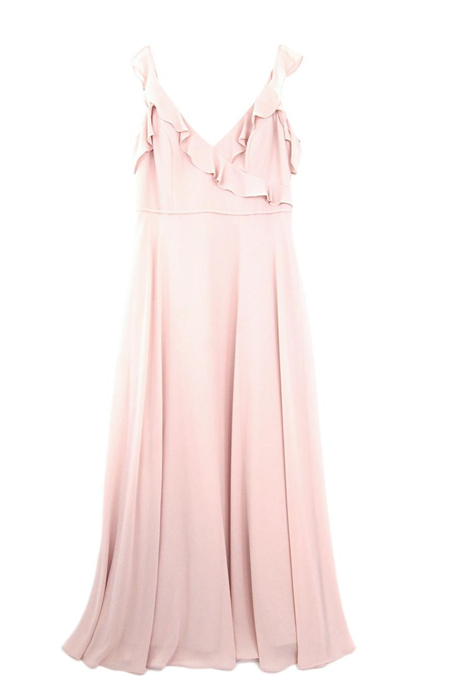 Chiffon v-neck princess seamed bodice with 3" ruffles at neckline, continuing on to strap. Double spaghetti straps with ruffles, can be positioned atop shoulders or off shoulder, 1/4" belt at waist, princess seam A-line skirt