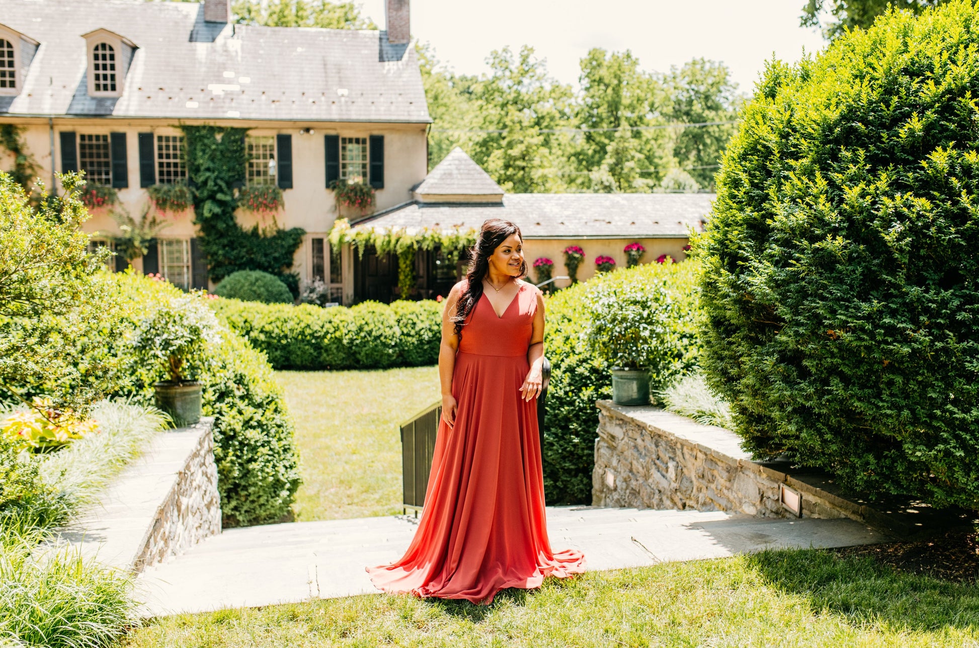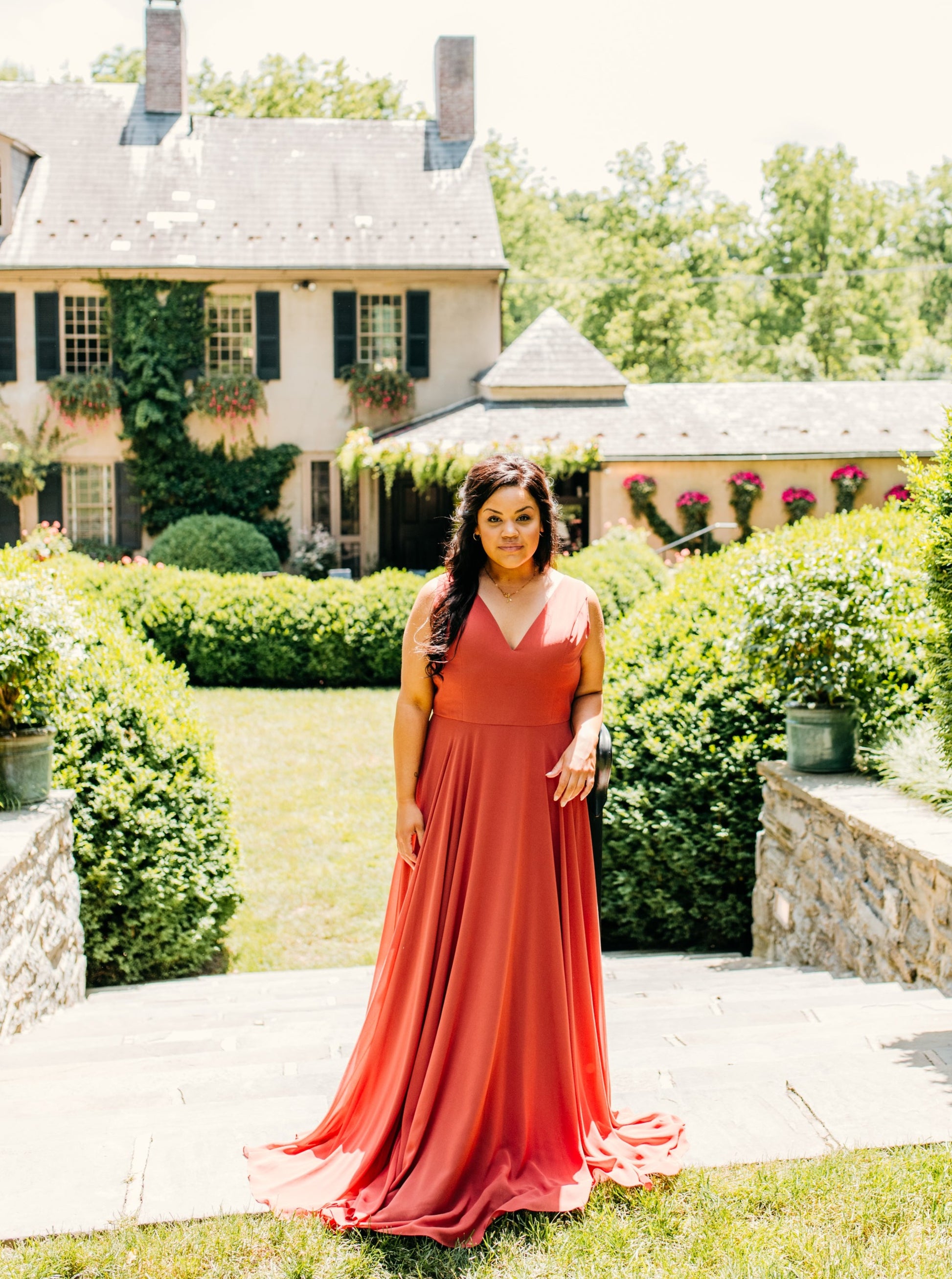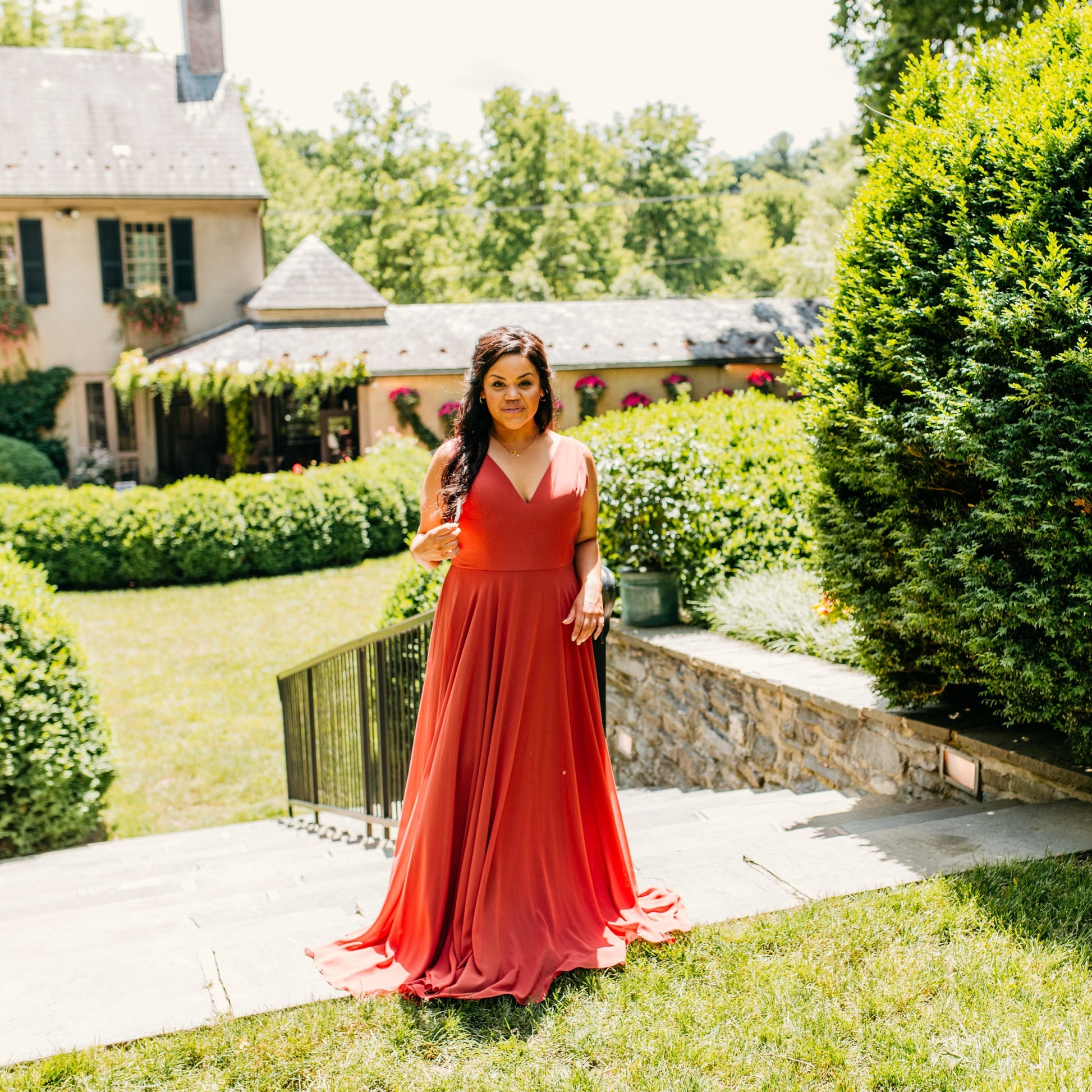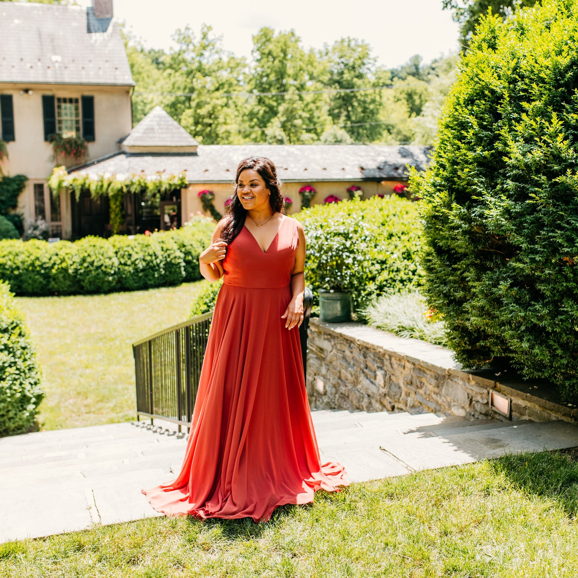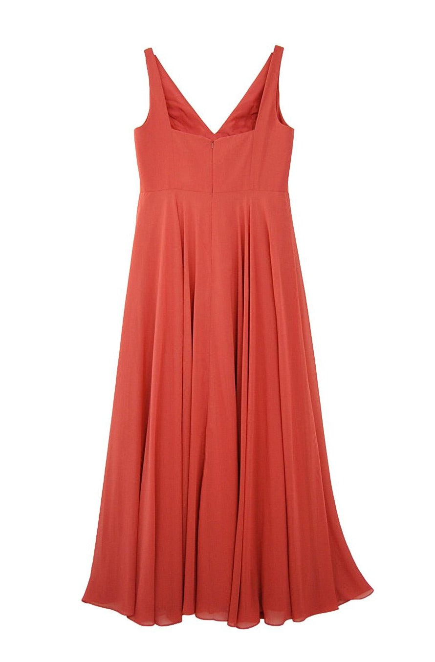 Chiffon v-neck princess seam bodice with 1" straps, square back neck, circle skirt.