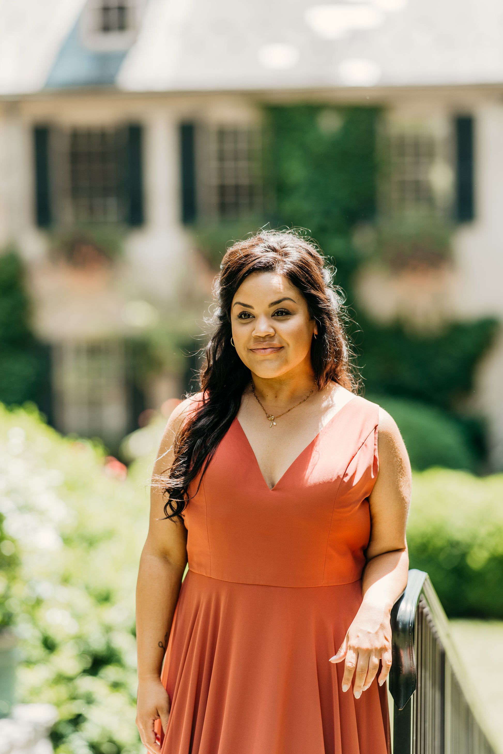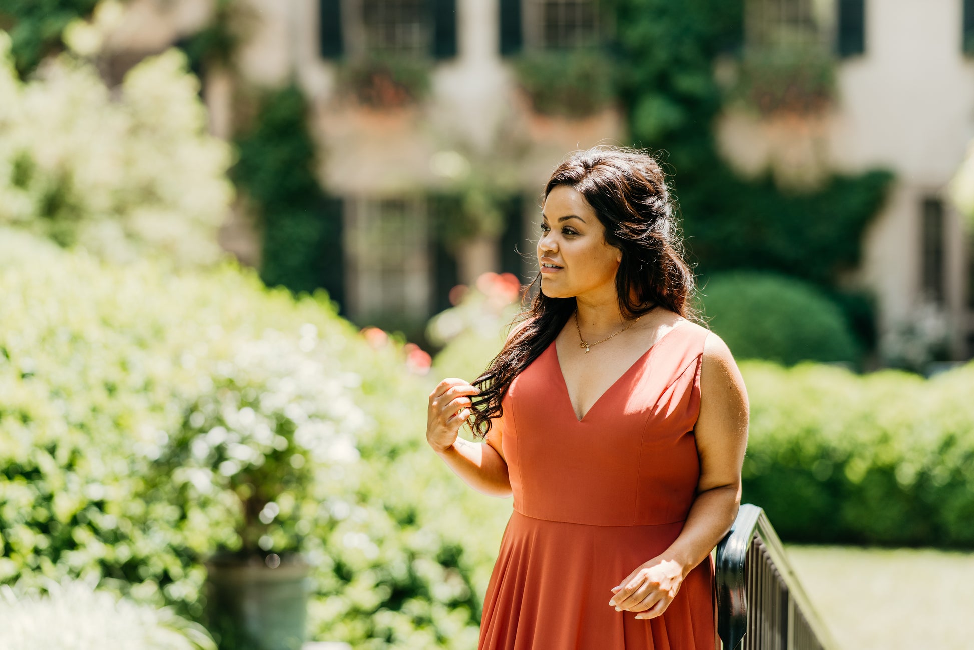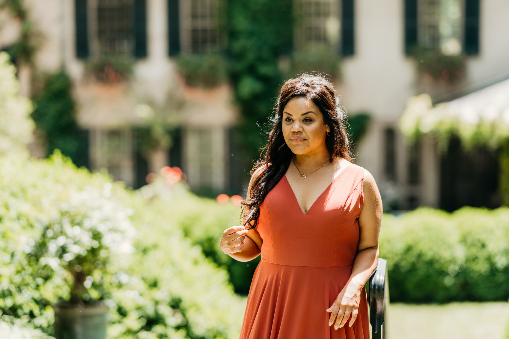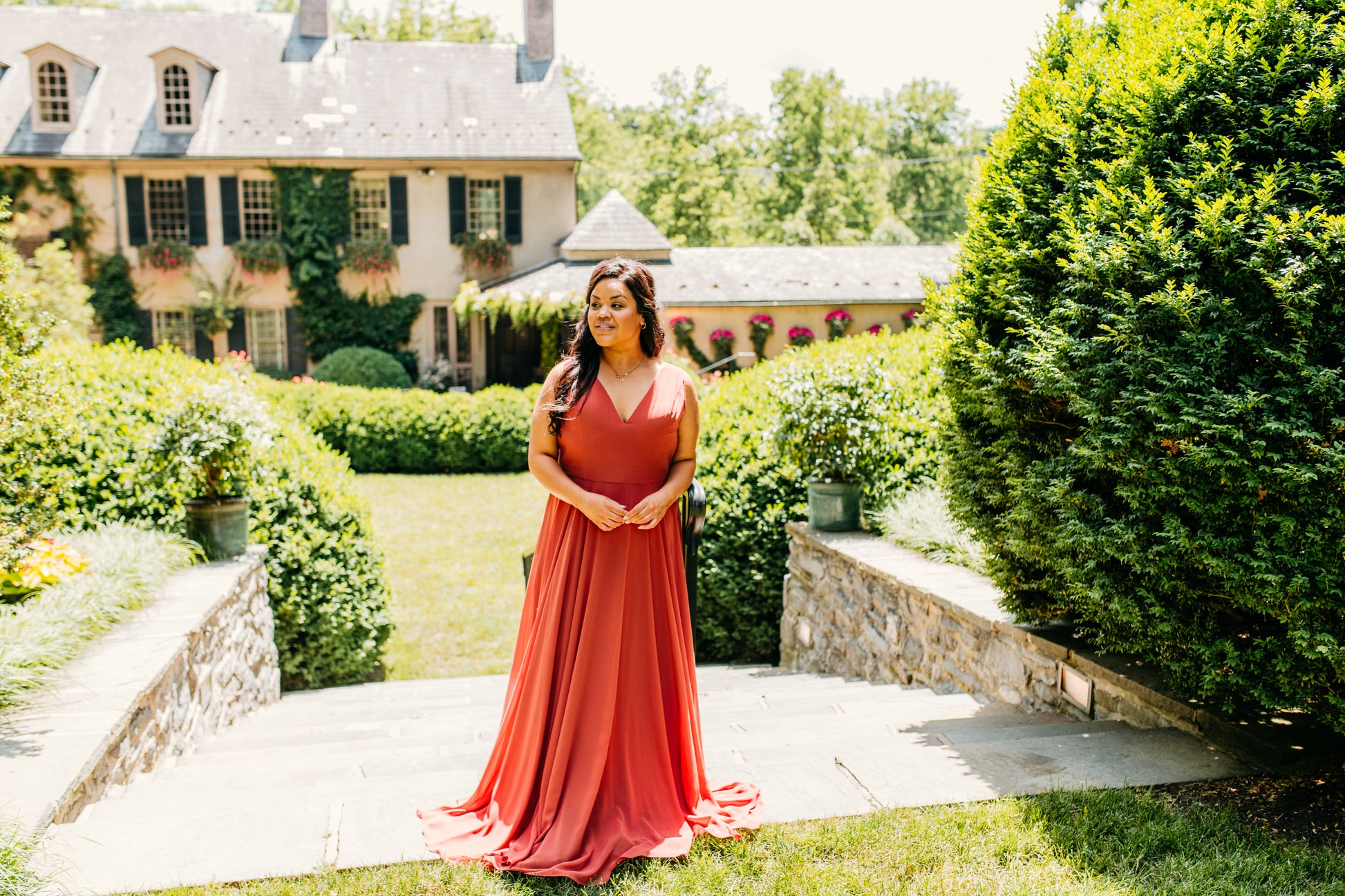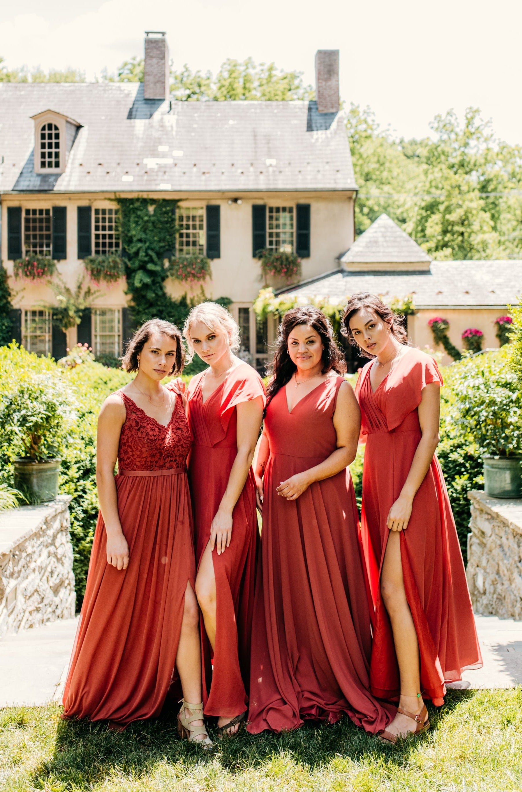 Chiffon v-neck princess seam bodice with 1" straps, square back neck, circle skirt.