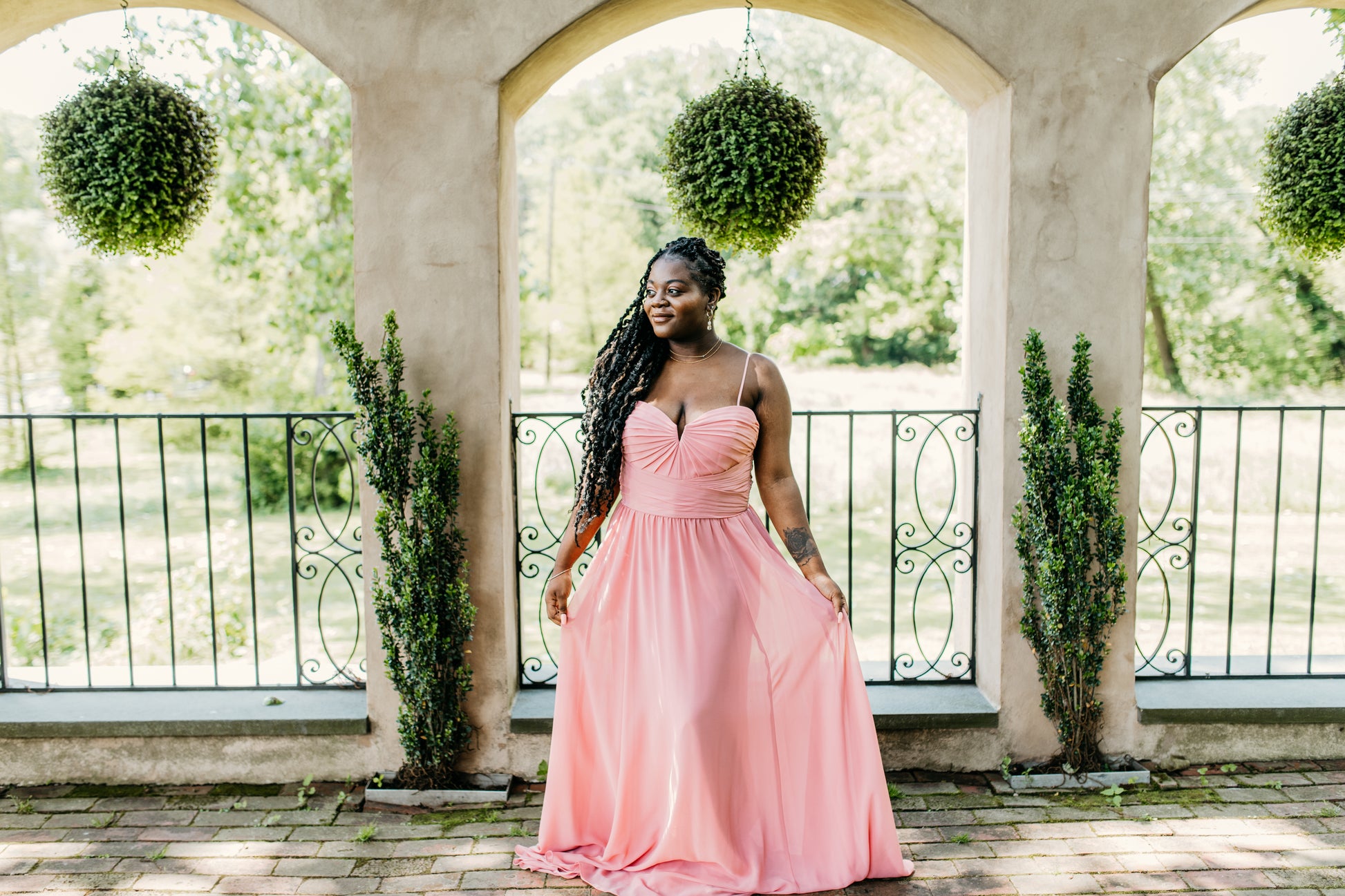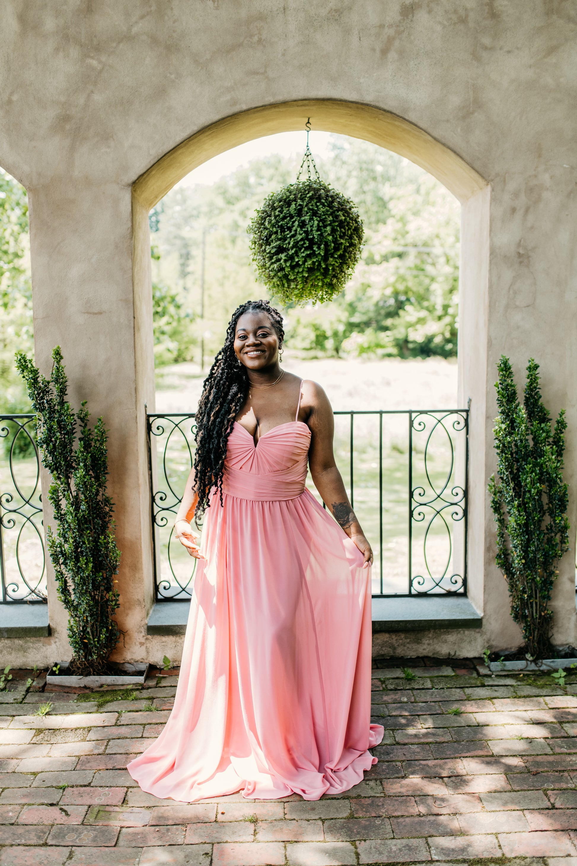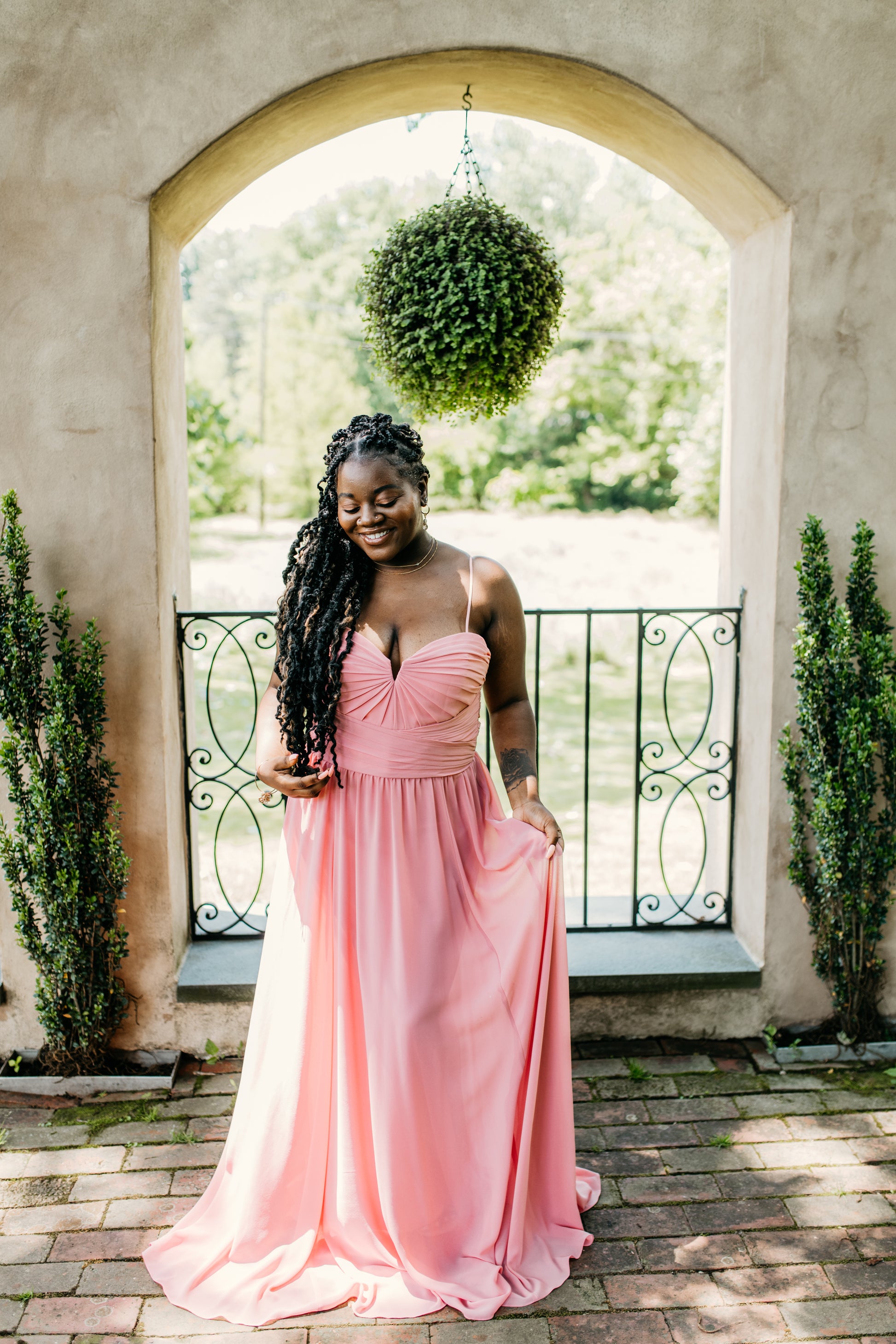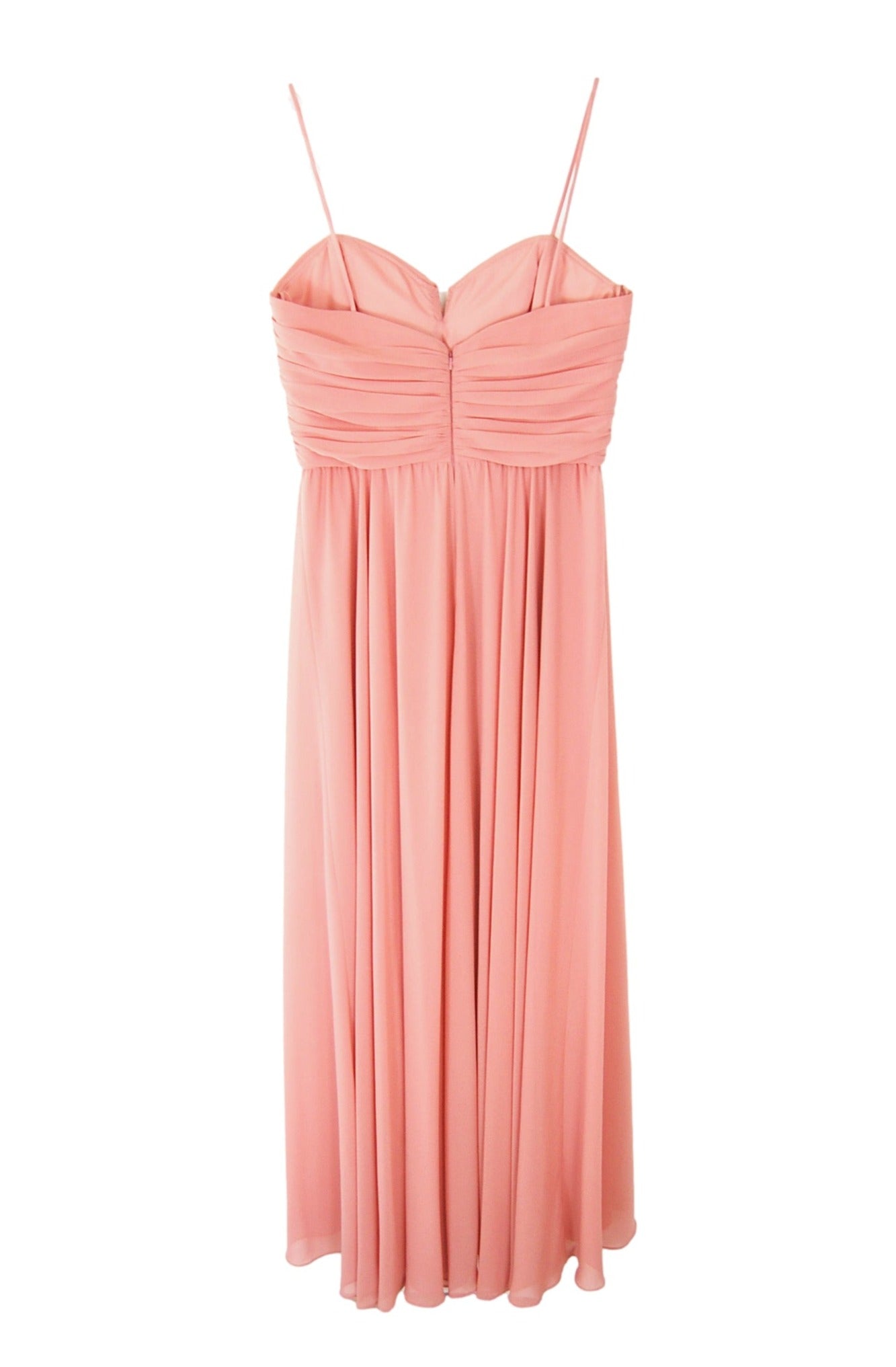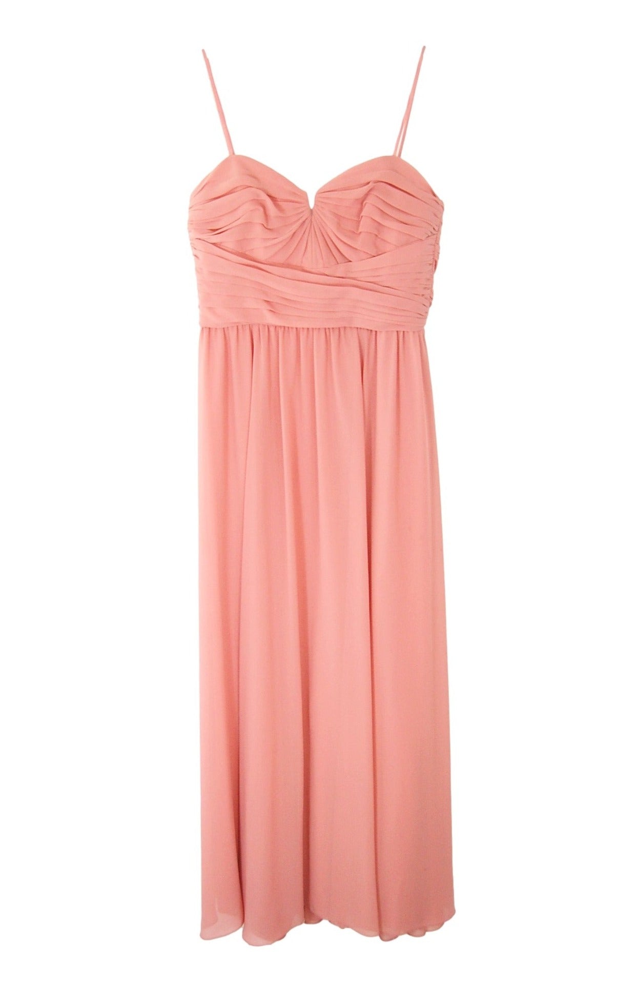 Chiffon beautifully draped and pleated extended empire boned bodice with 4" wide pleated waistband, spaghetti straps (could be worn as strapless), gathered A-line skirt