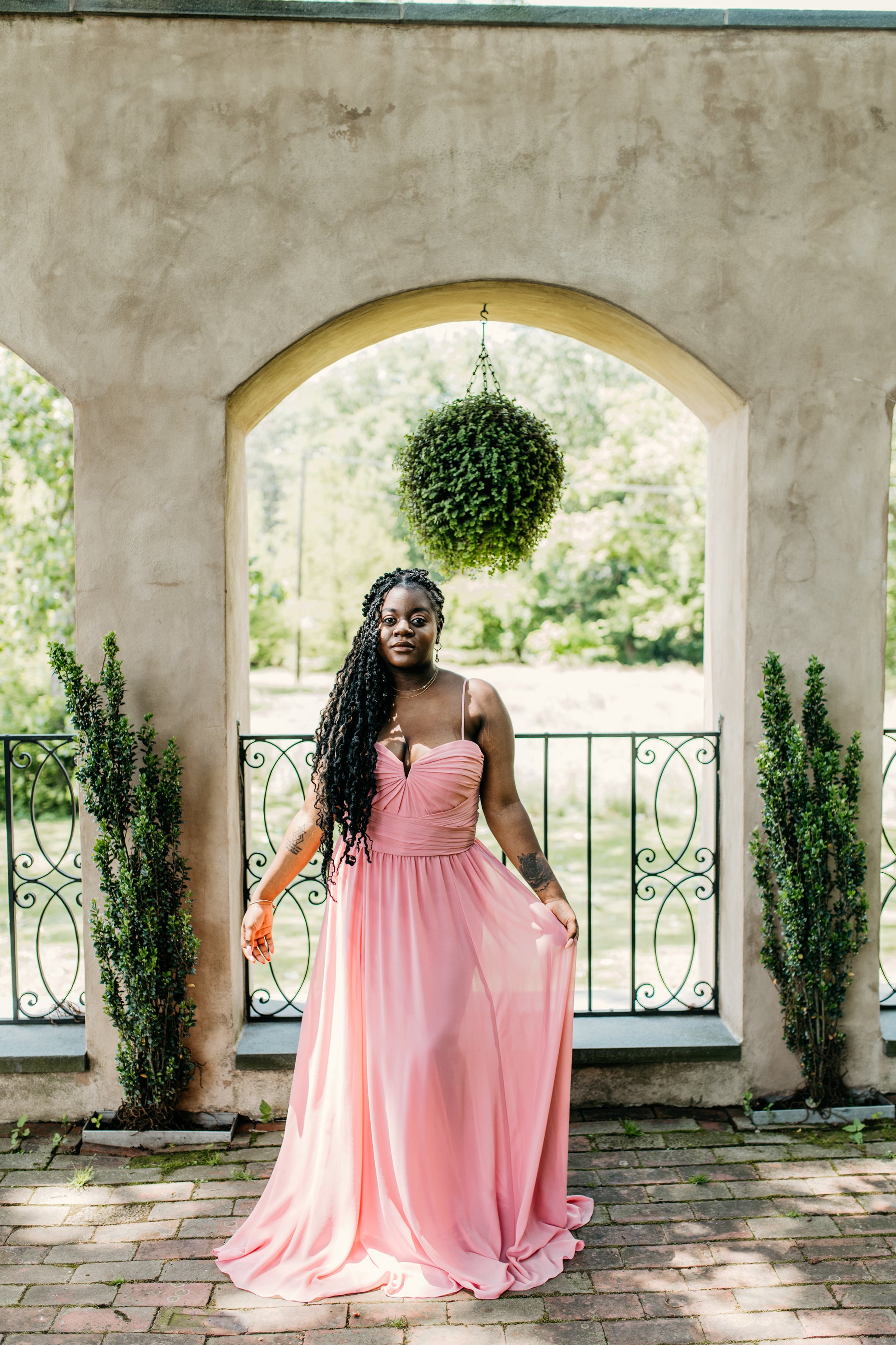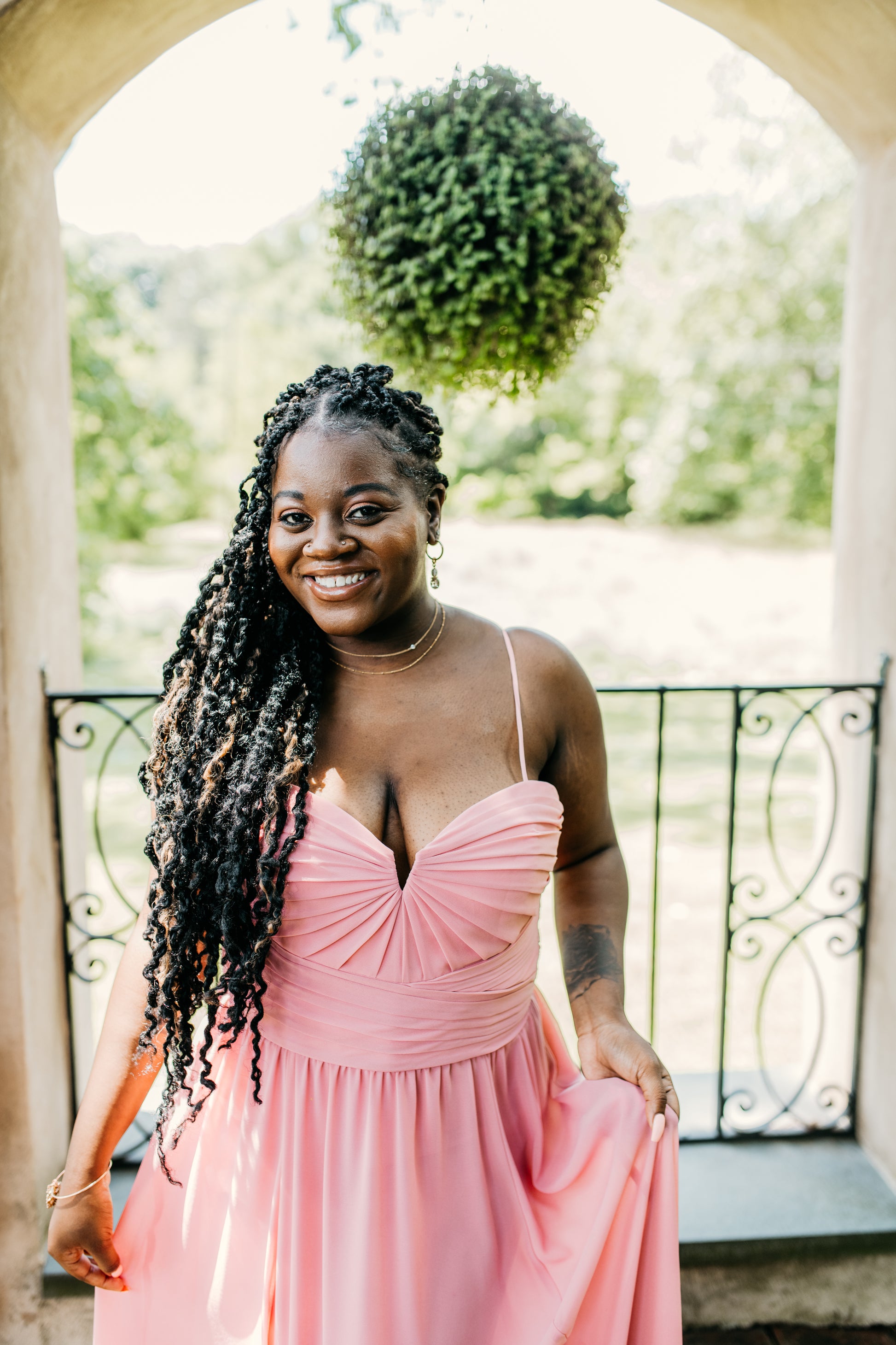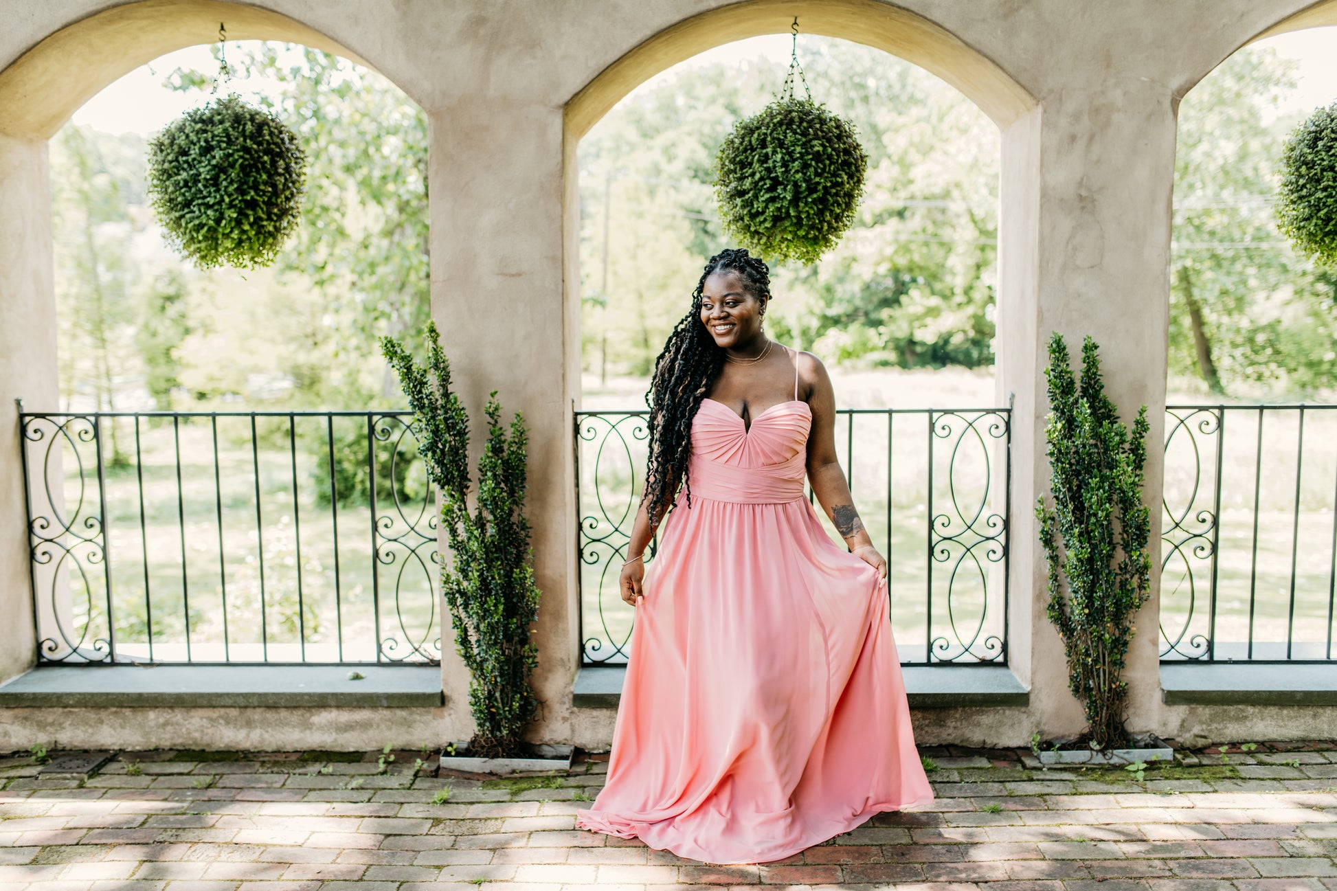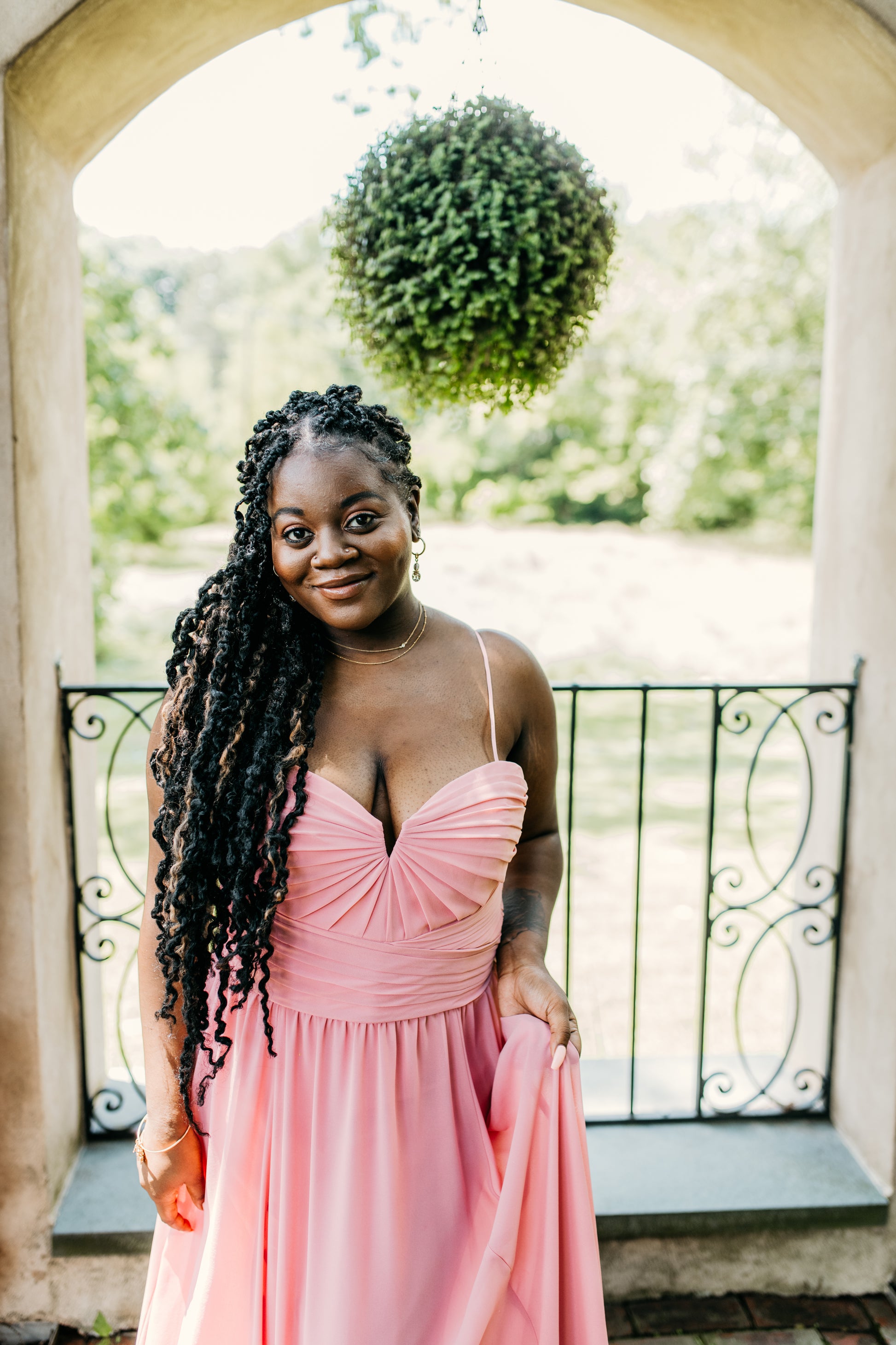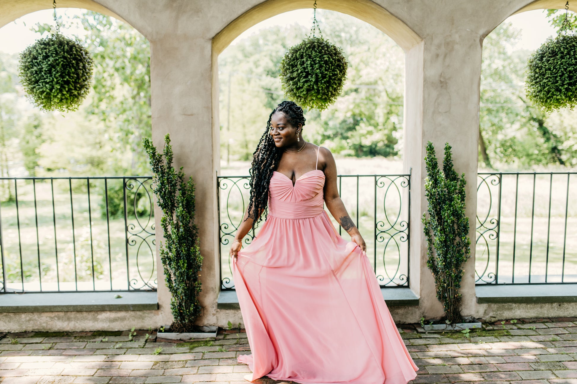 Chiffon beautifully draped and pleated extended empire boned bodice with 4" wide pleated waistband, spaghetti straps (could be worn as strapless), gathered A-line skirt