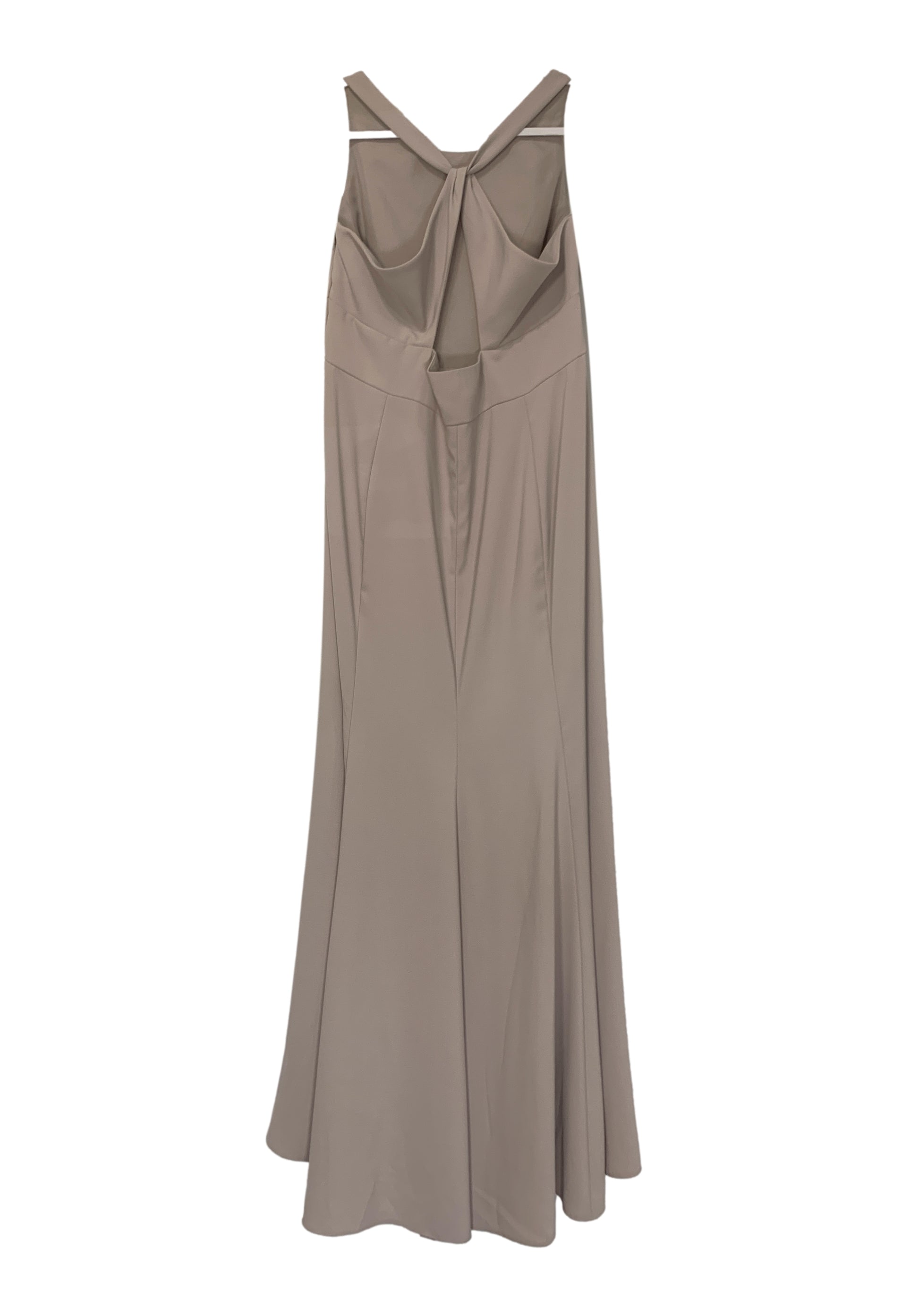 Bateau neck, princess seamed, extended empire bodice with 1.5" straps halter at back creating semi-open back with keyhole detail, 2.5" waistband, sleek princess seam a-line skirt.