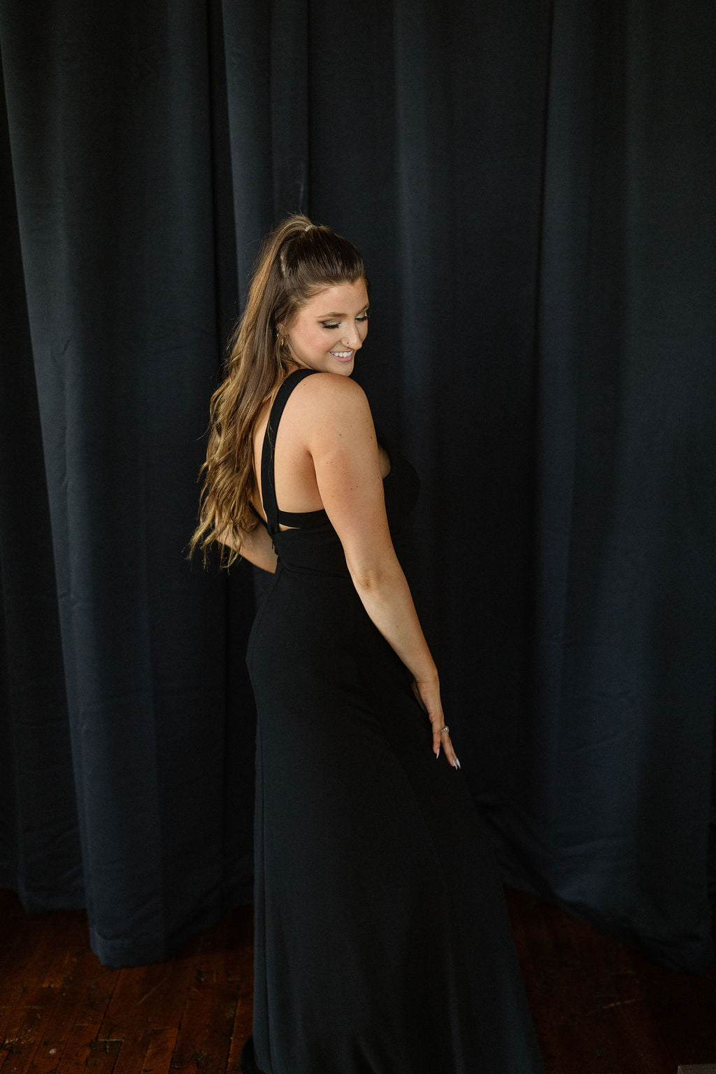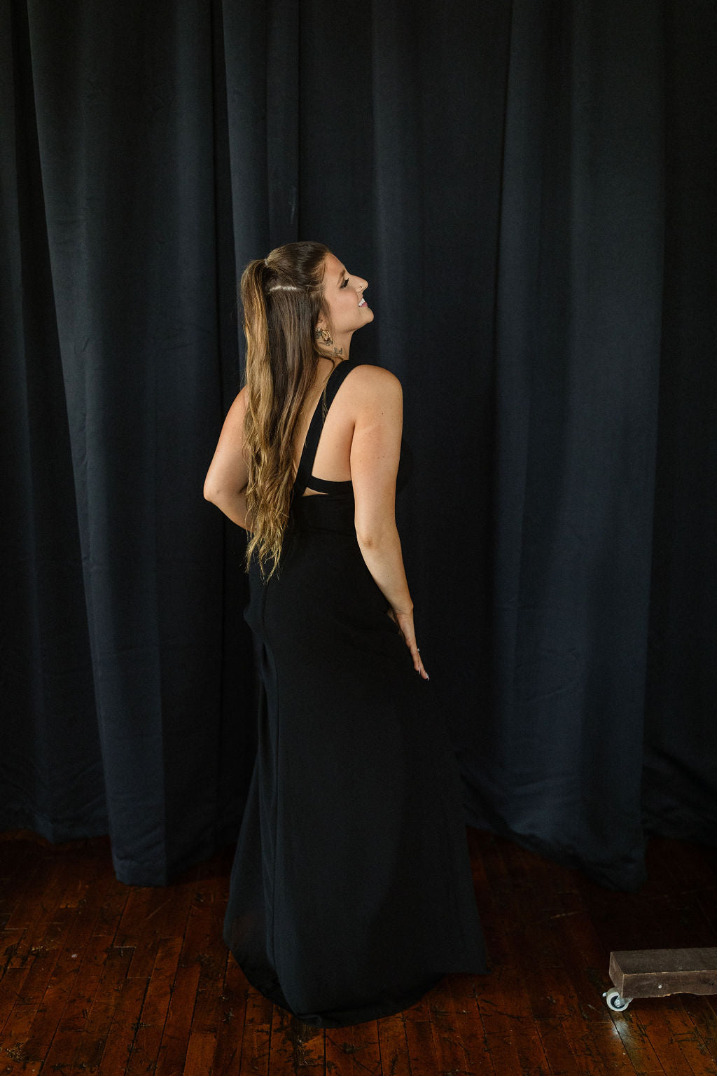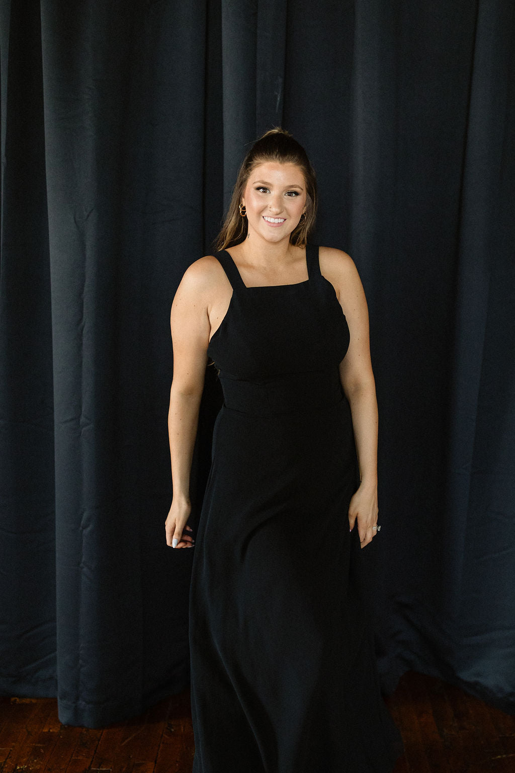 Black chiffon high square neckline, princess seam bodice, 1.25" straps, strappy open back, a-line skirt.