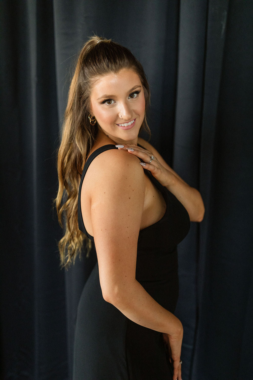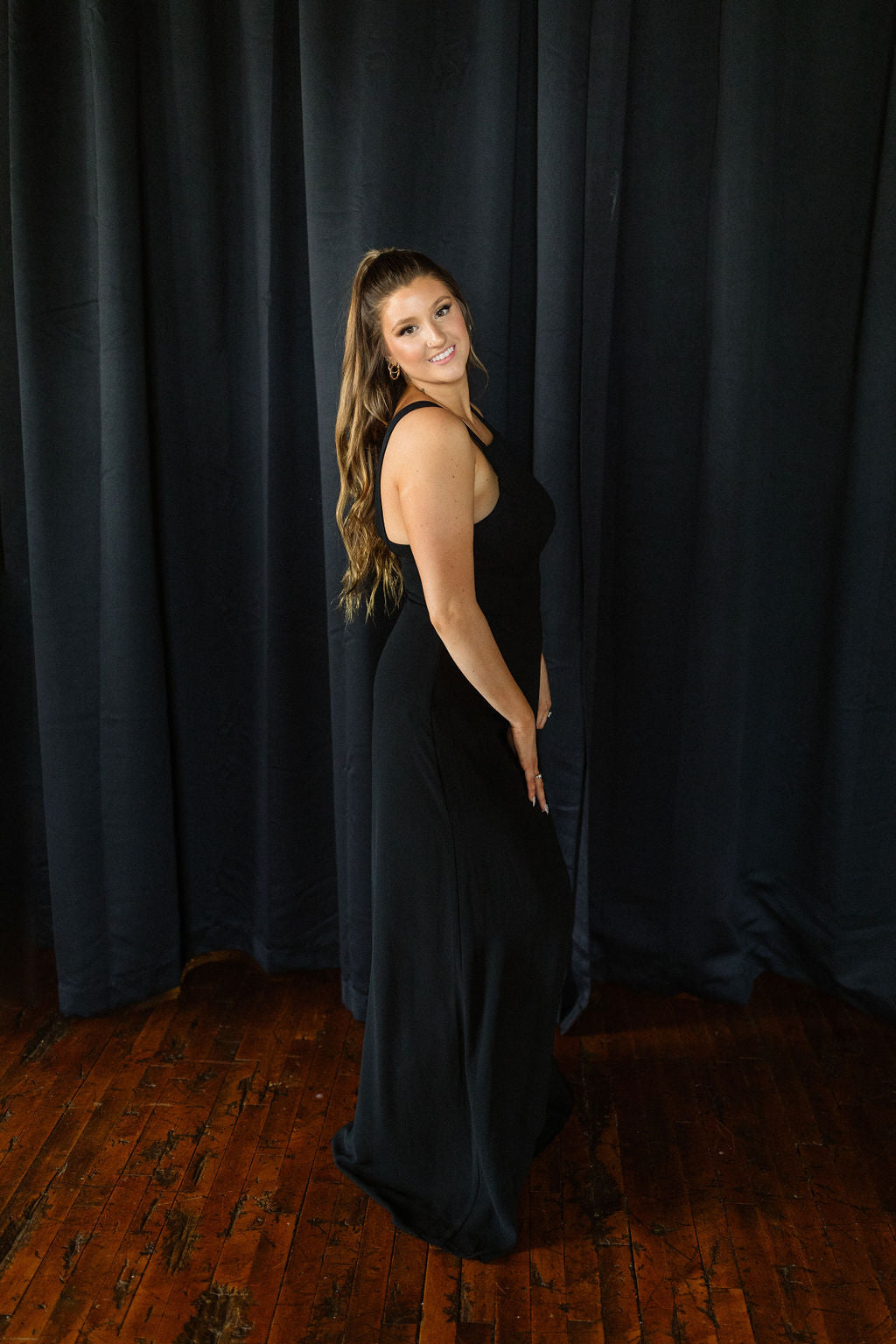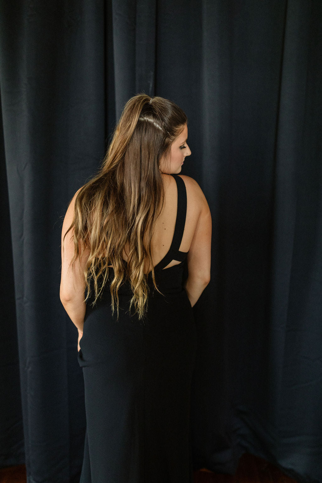 Black chiffon high square neckline, princess seam bodice, 1.25" straps, strappy open back, a-line skirt.